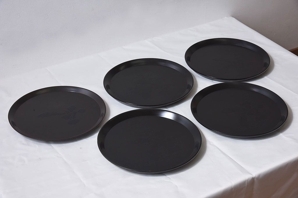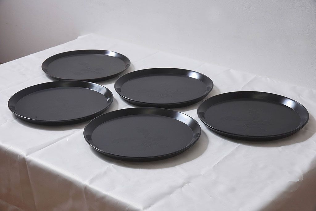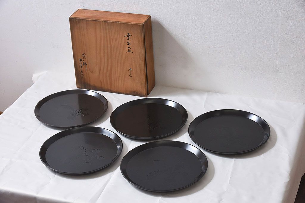 和製アンティーク 大正昭和初期 塗師小澤造 黒漆塗りが美しい桑名盆5枚セット(漆器、皿)