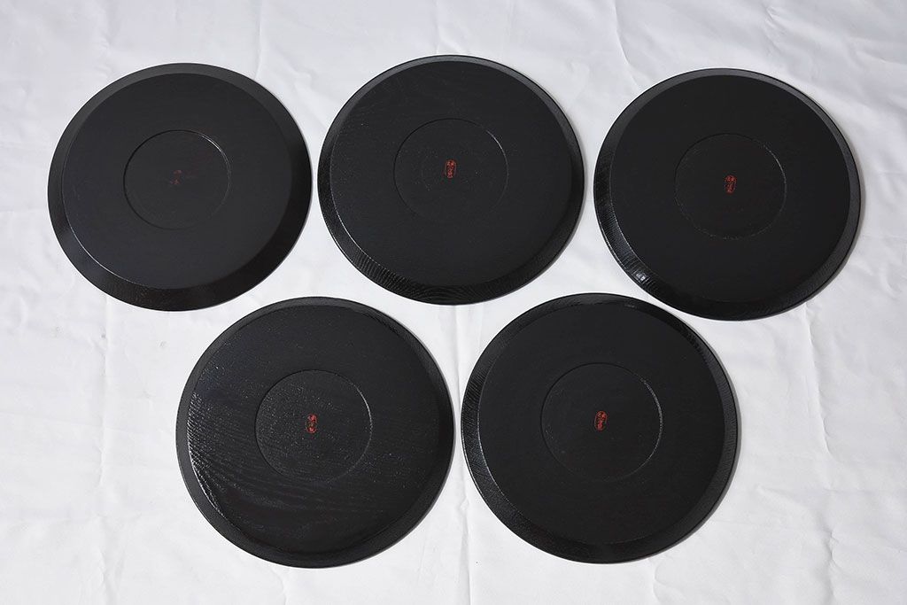 和製アンティーク 大正〜昭和初期 塗師小澤造 黒漆塗りが美しい桑名盆5枚セット(漆器、皿)です。