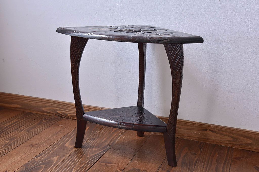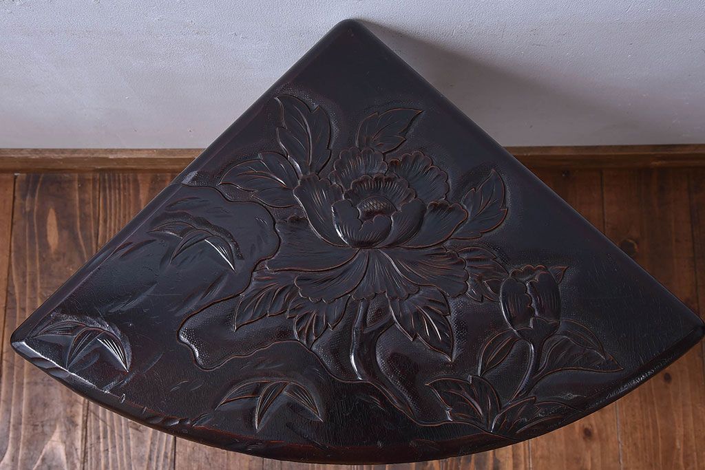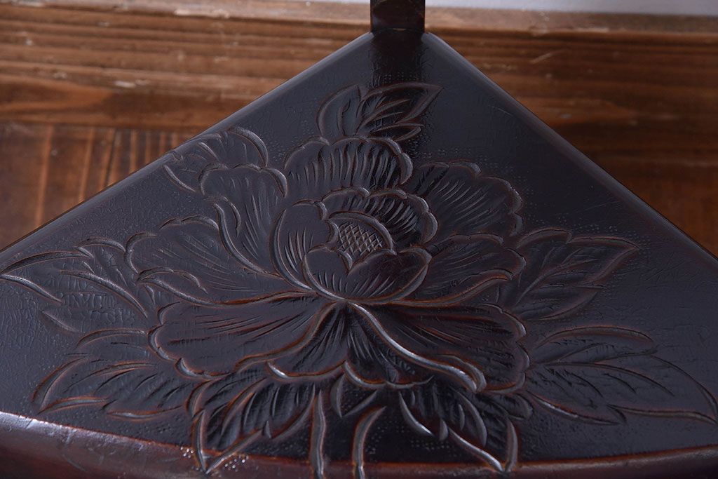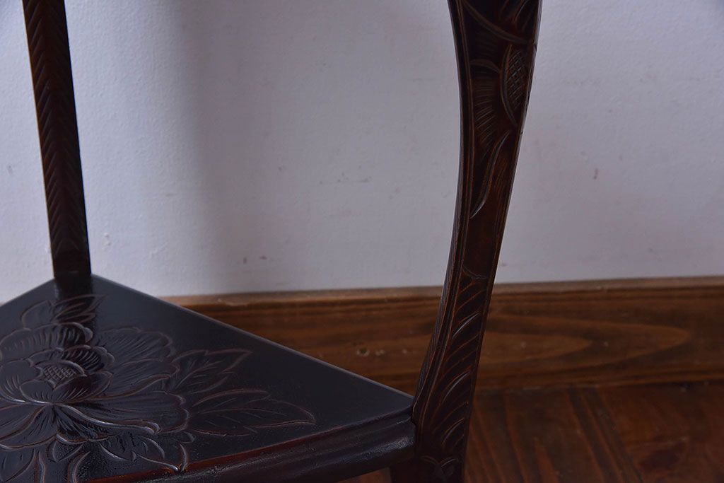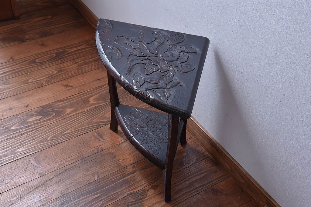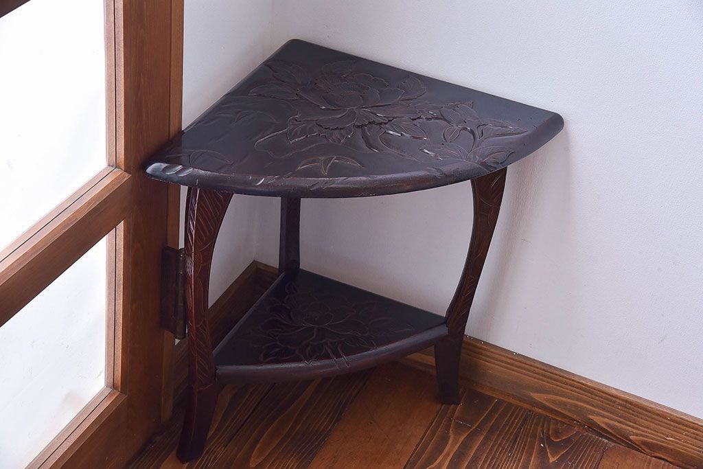 花台・飾り台 > アンティーク雑貨 伝統工芸 軽井沢彫りの小振りなビンテージコーナーラック(隅棚、飾り棚)