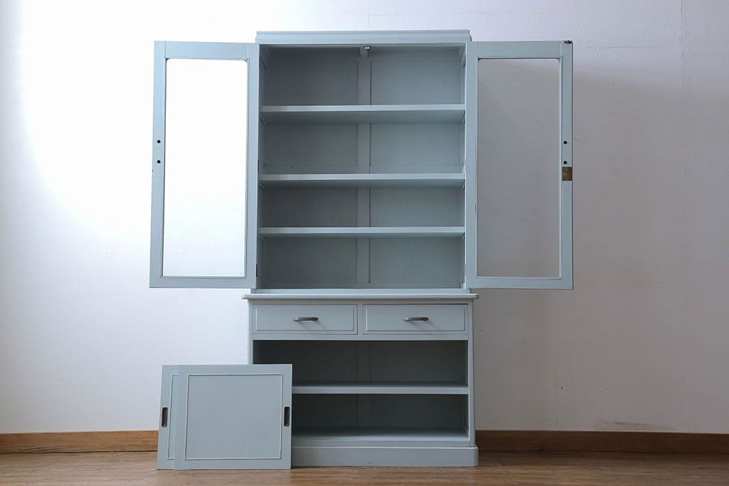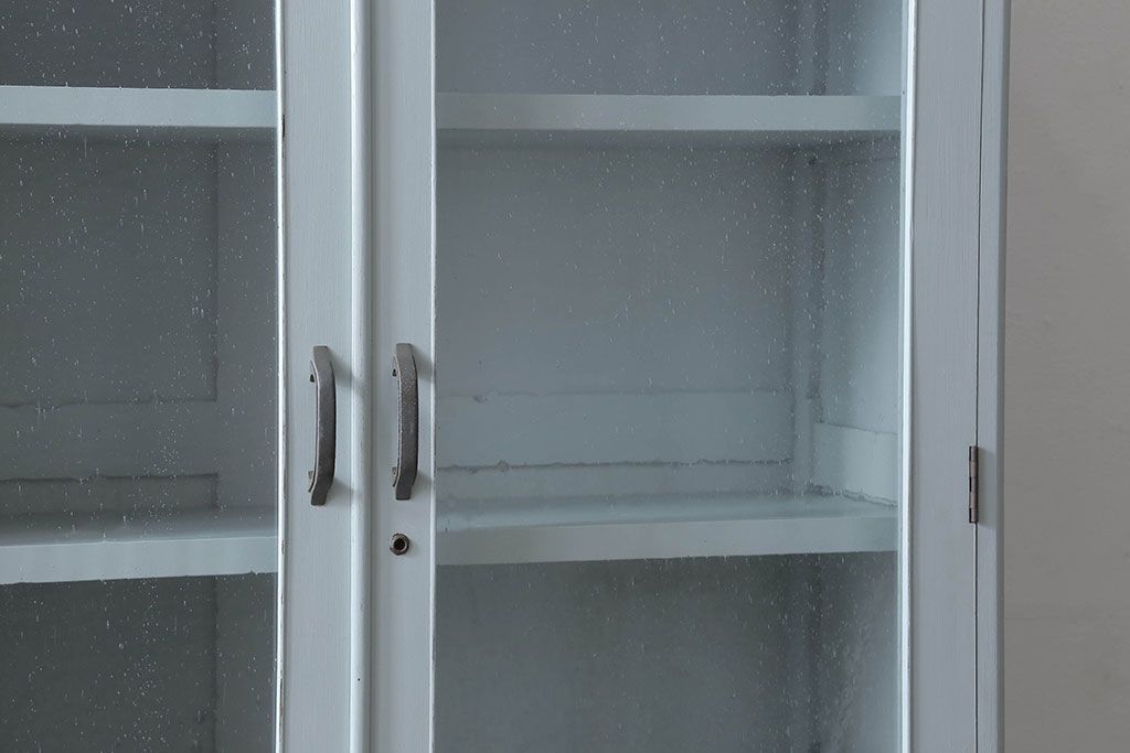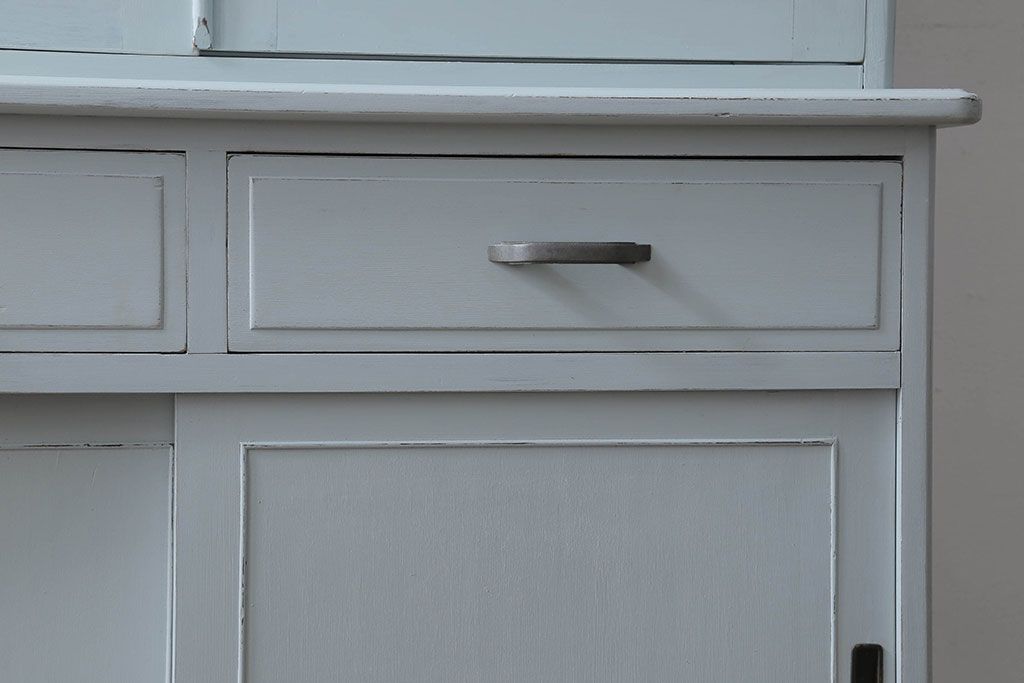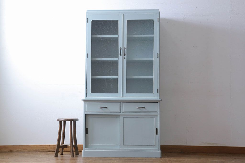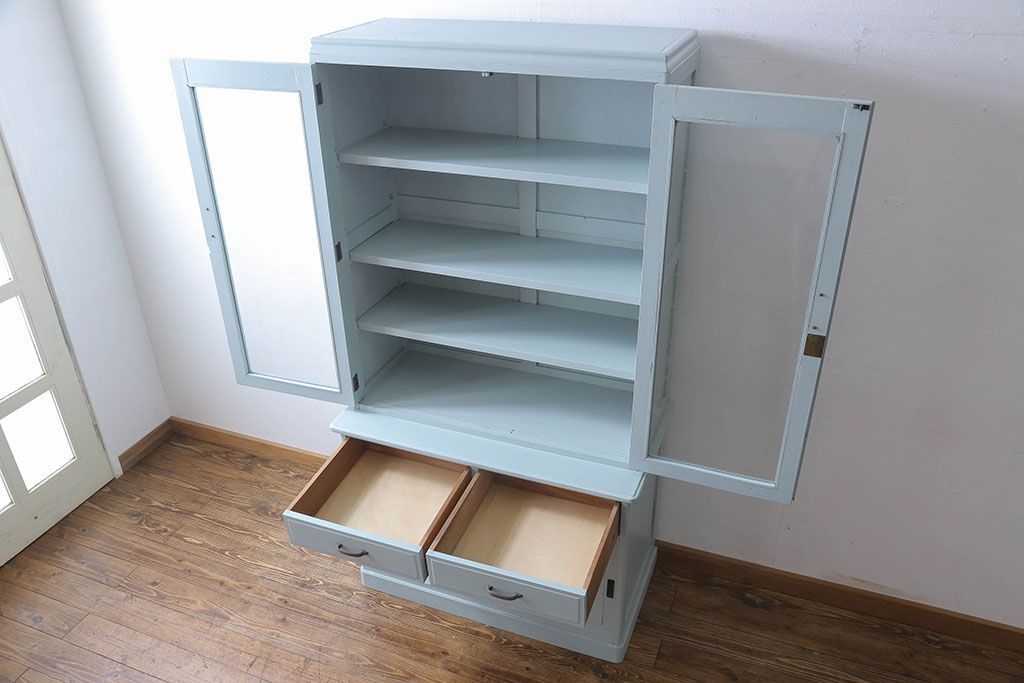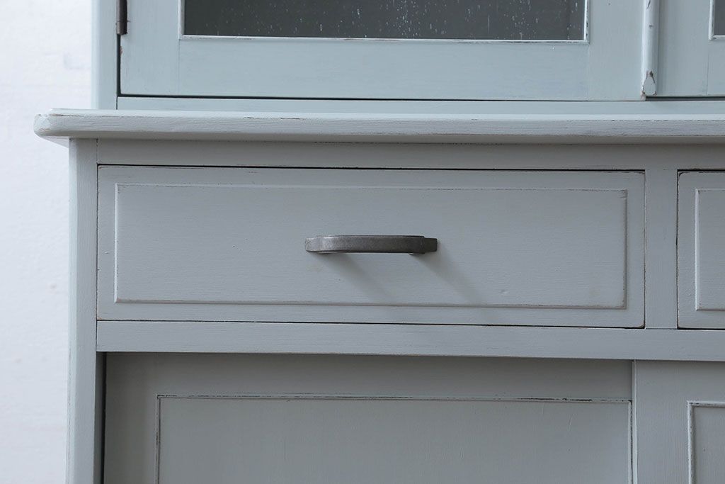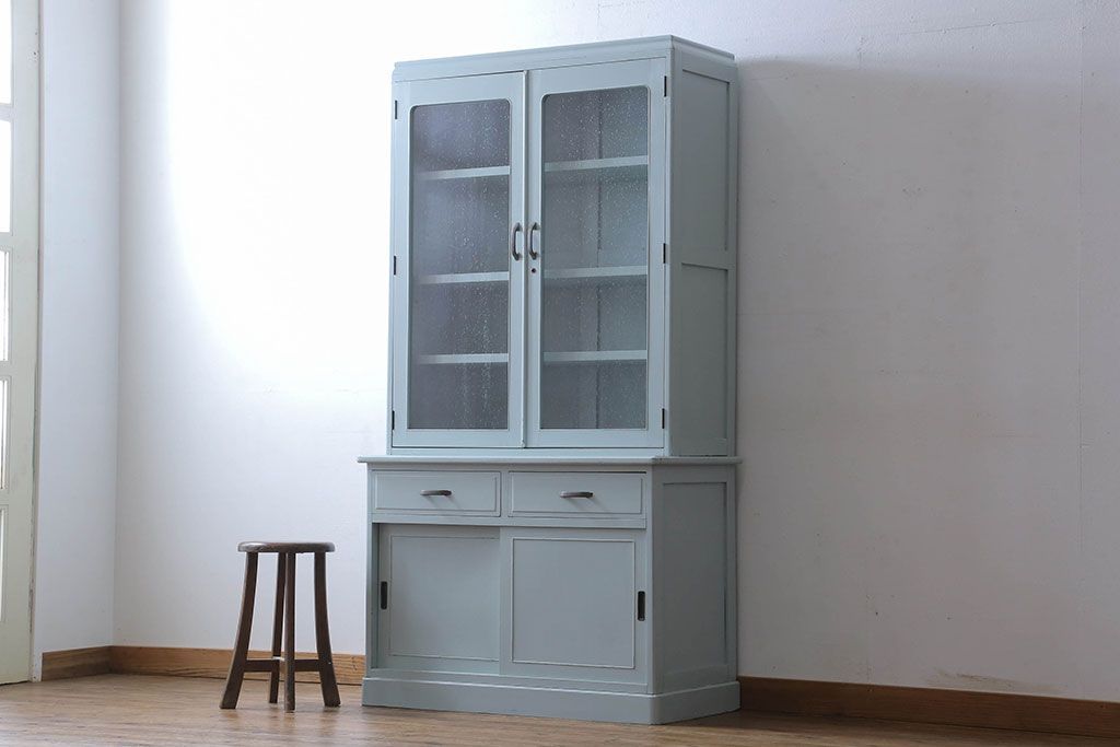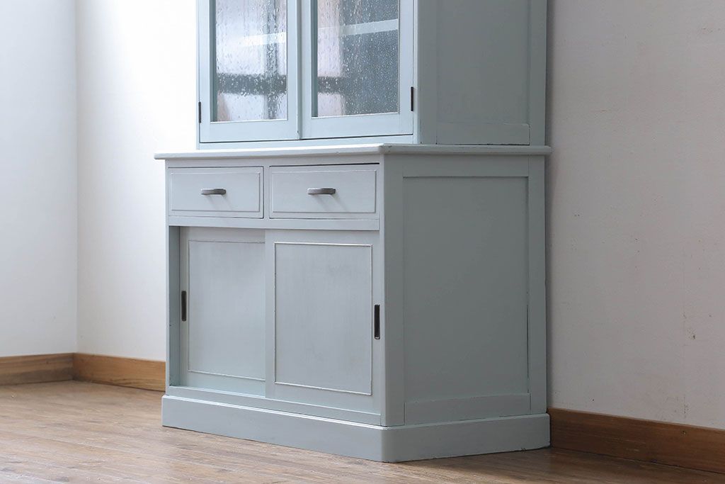 ペイント家具 気泡ガラスがお洒落なナチュラルカラーの食器棚(収納棚、戸棚、飾り棚)