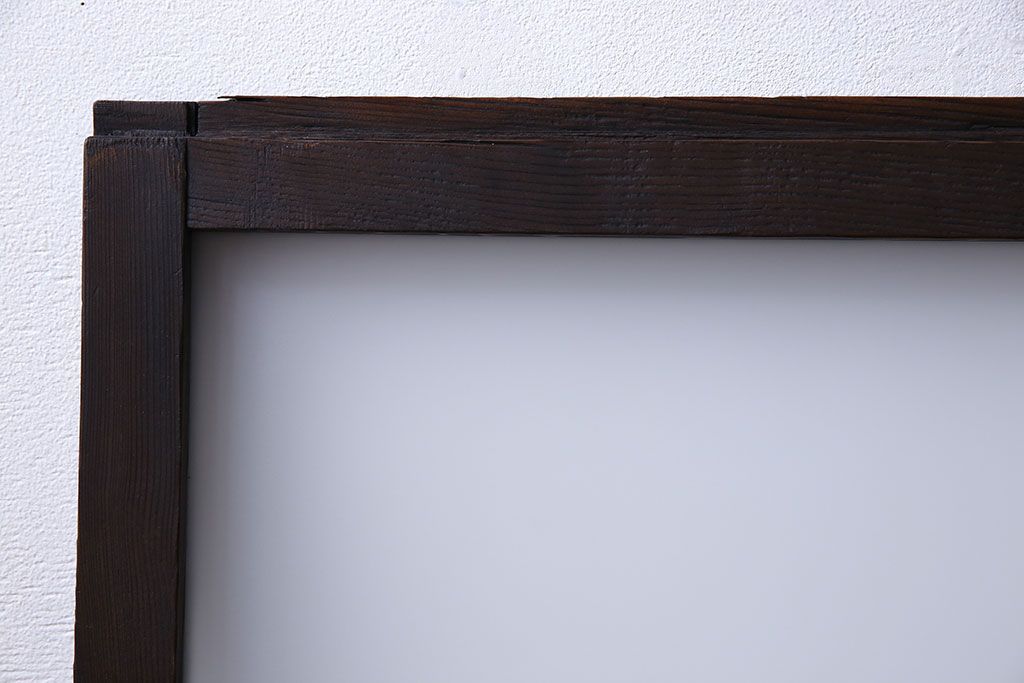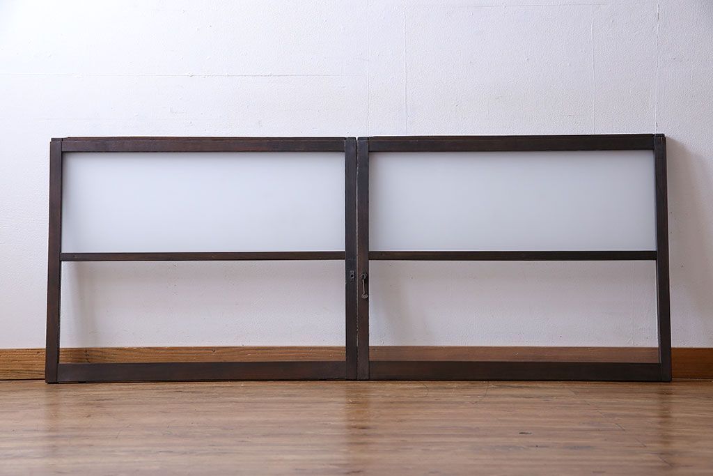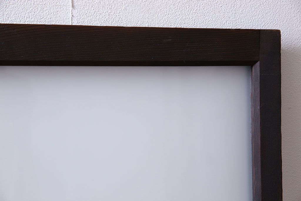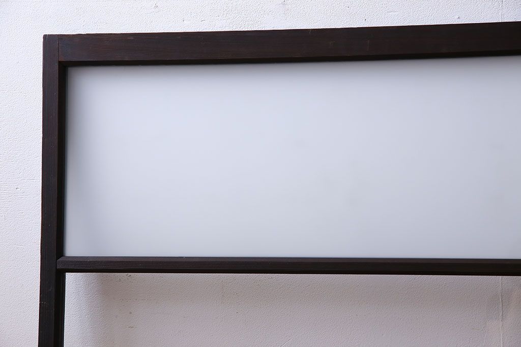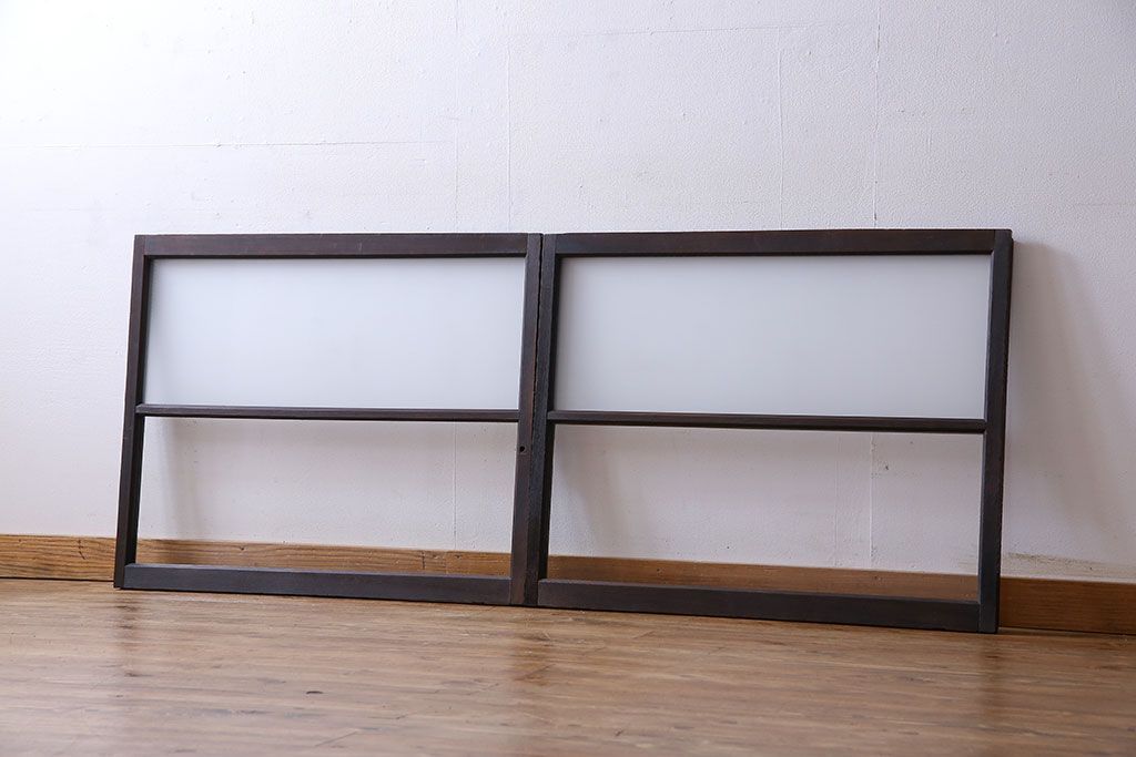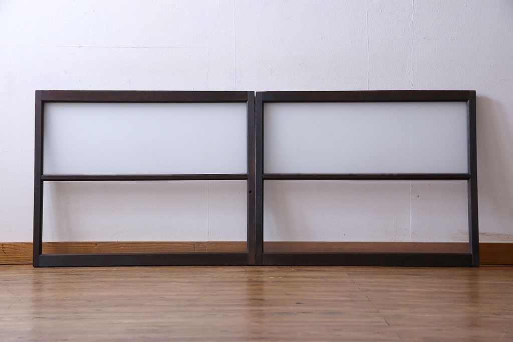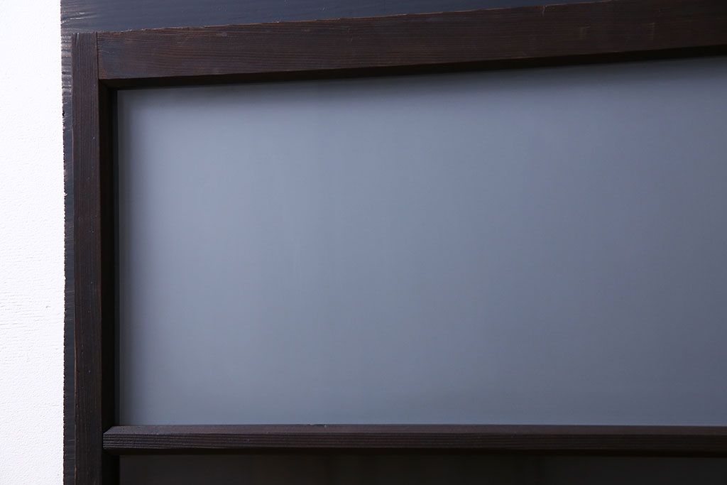 和製アンティーク 2種のガラスがアクセントのシンプルなガラス戸(窓、引き戸、建具)2枚組です。 シンプルなデザインがお部屋に取り入れやすい、 和製アンティークのガラス戸です。 上部にすりガラス、 下部にはクリアガラスが使われており、 2種の異なる質感がアクセントになった一品です。 木枠の濃い色合いも相まって、 モダンな空間づくりにぴったりですよ。 戸車はスムーズに動きます。 1枚目の画像にあるガラス戸2枚のうち、左のみ計測致しましたので、そちらをご参考ください。 使用上問題のあるダメージはありません。 ■重量 約4kg(1枚) ■框サイズ 上45mm/左30mm/右30mm/下50mm