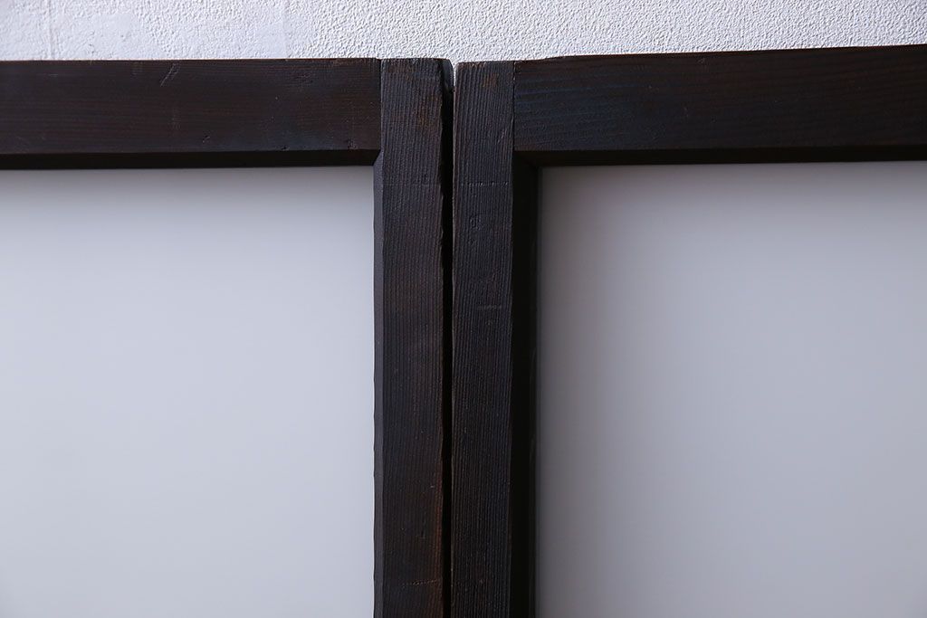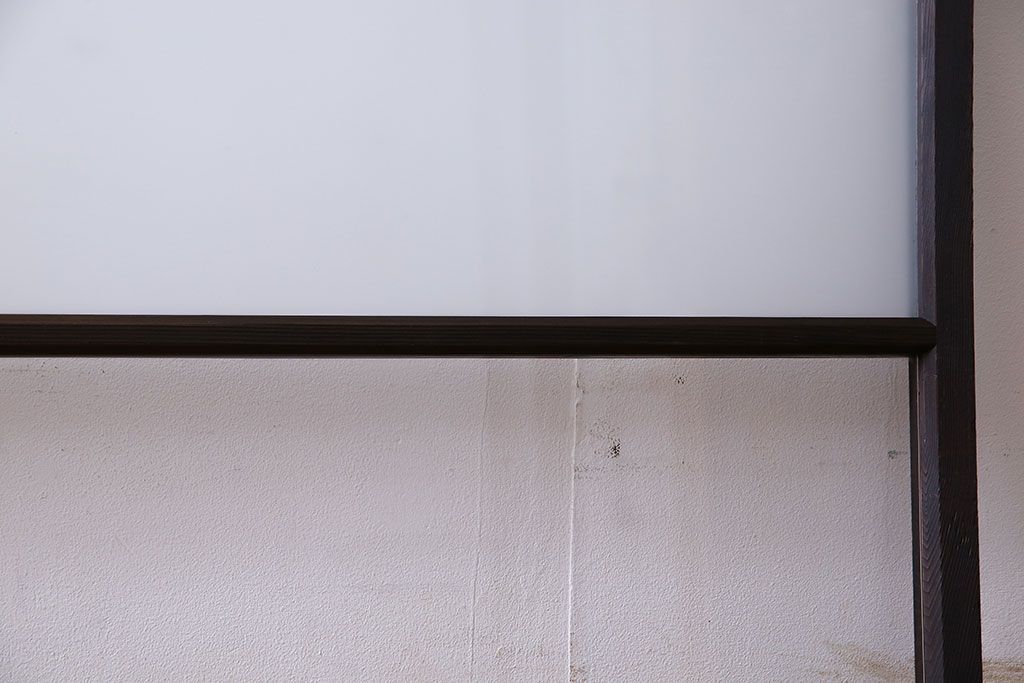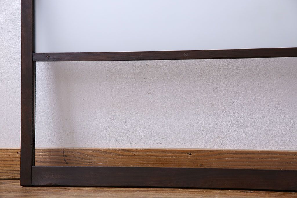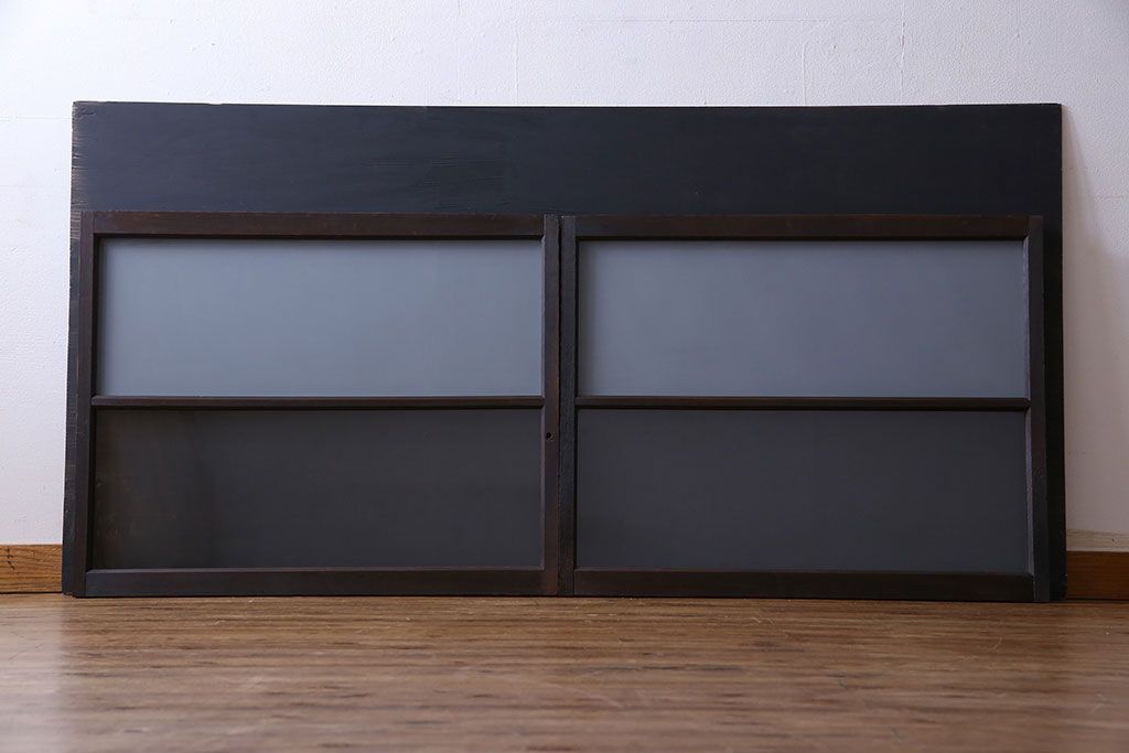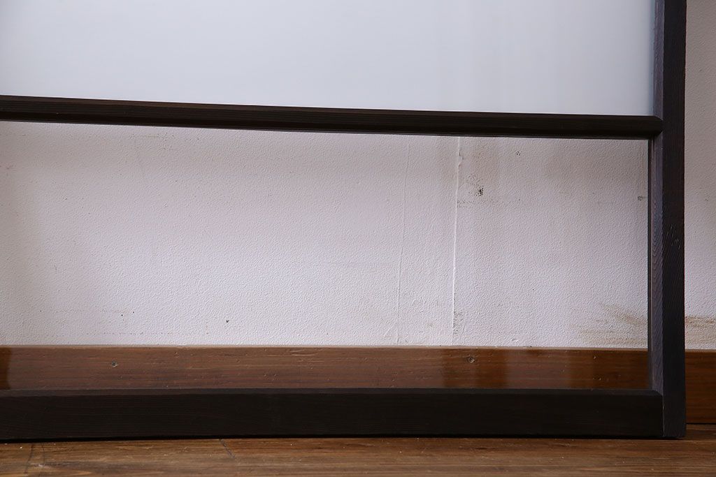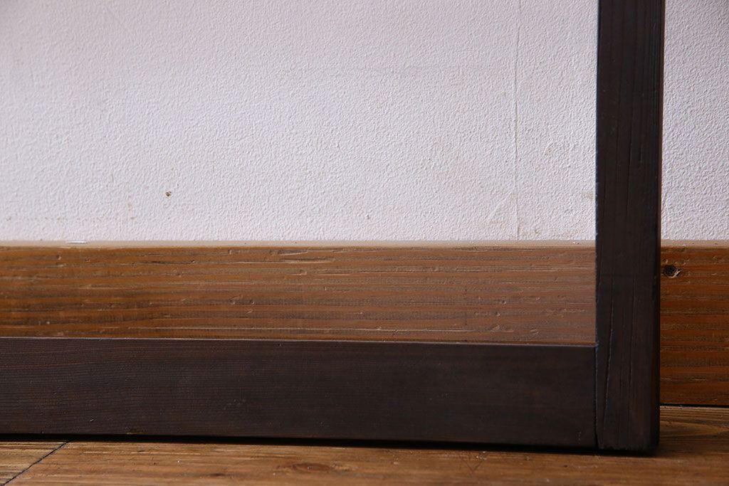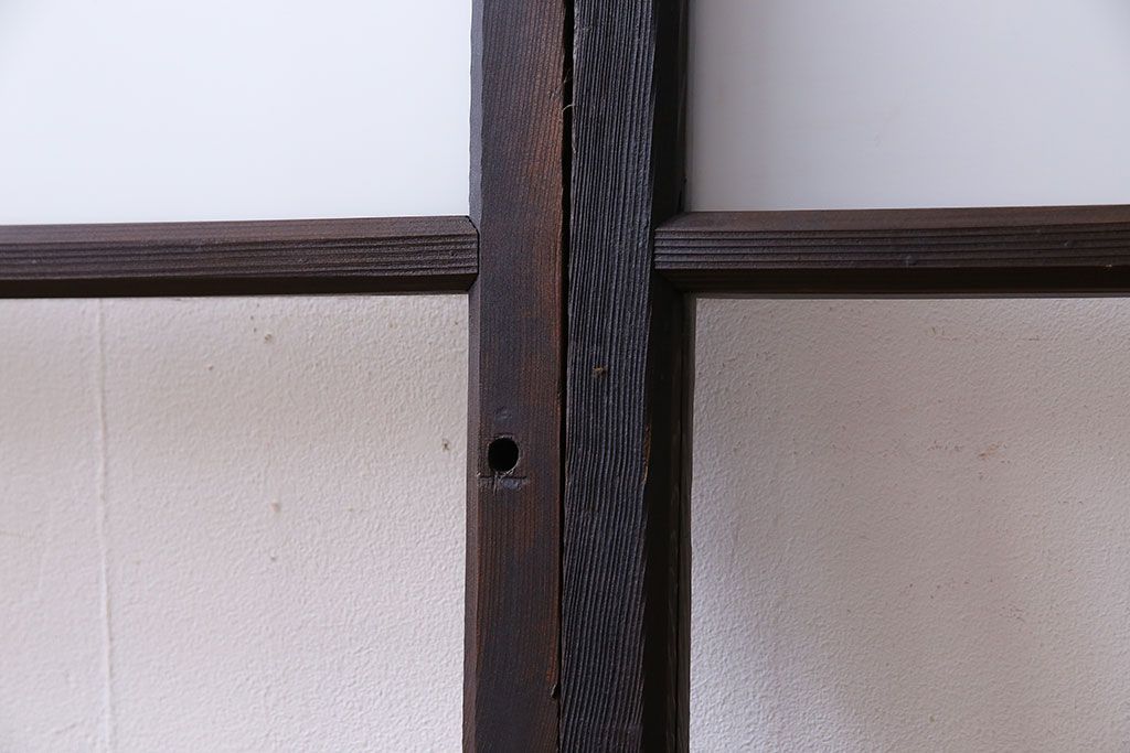 和製アンティーク 2種のガラスがアクセントのシンプルなガラス戸(窓、引き戸、建具)2枚組です。 シンプルなデザインがお部屋に取り入れやすい、 和製アンティークのガラス戸です。 上部にすりガラス、 下部にはクリアガラスが使われており、 2種の異なる質感がアクセントになった一品です。 木枠の濃い色合いも相まって、 モダンな空間づくりにぴったりですよ。 戸車はスムーズに動きます。 1枚目の画像にあるガラス戸2枚のうち、左のみ計測致しましたので、そちらをご参考ください。 使用上問題のあるダメージはありません。 ■重量 約4kg(1枚) ■框サイズ 上45mm/左30mm/右30mm/下50mm
