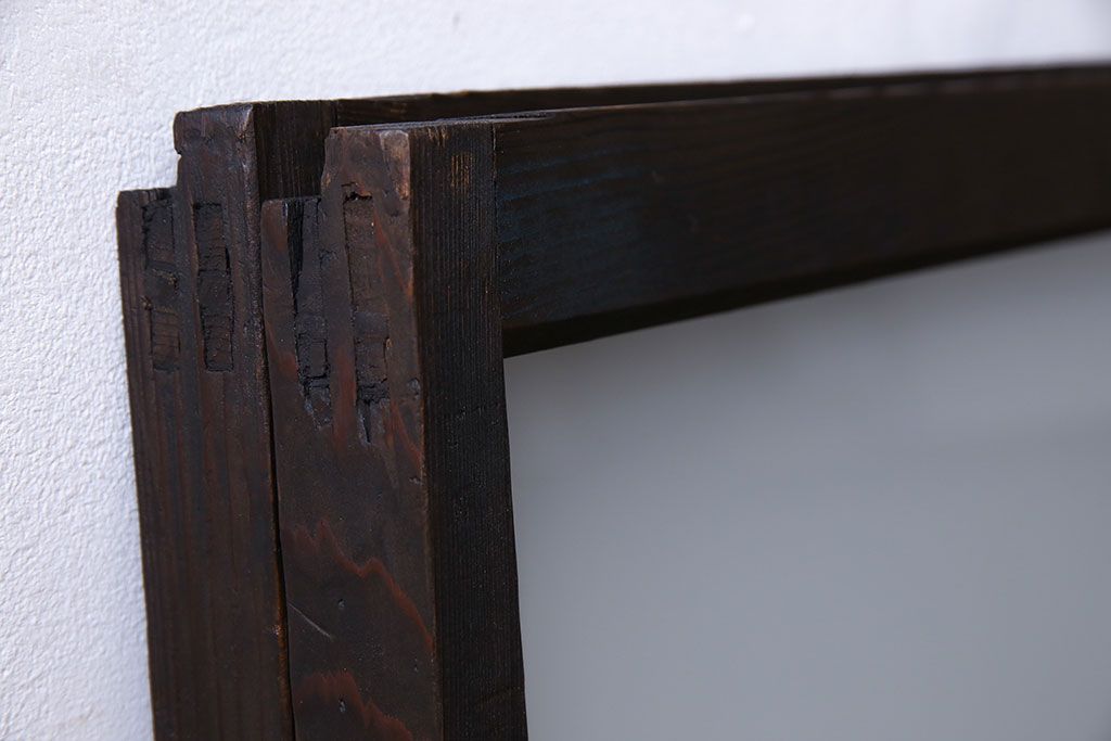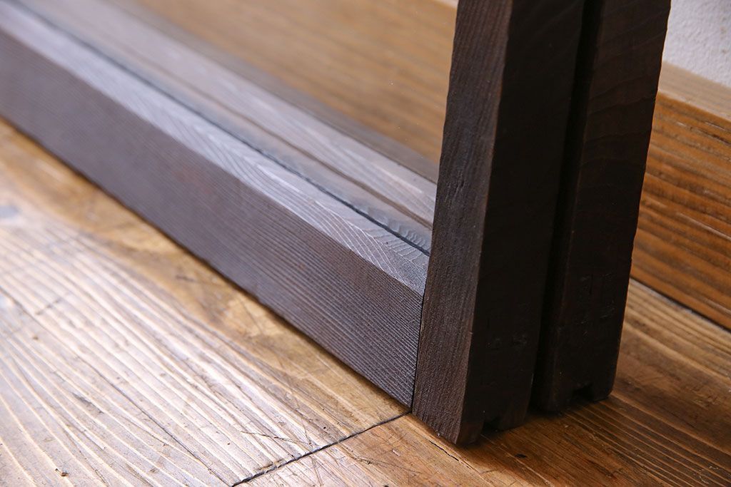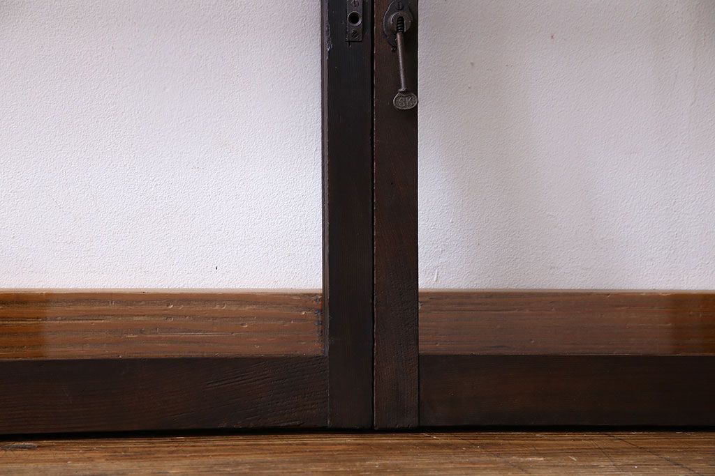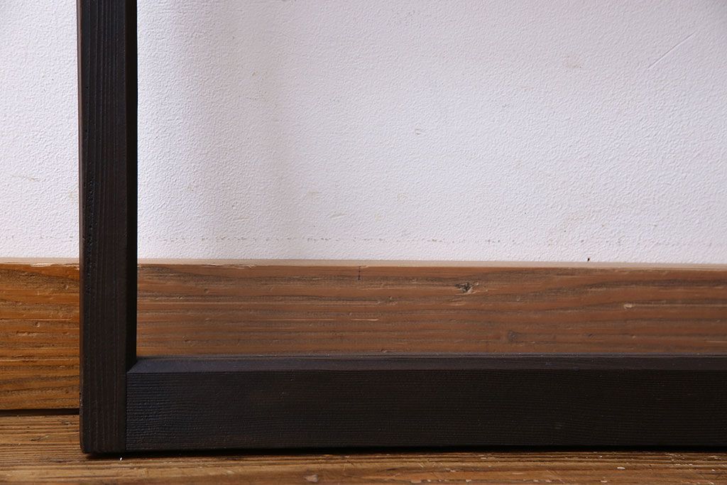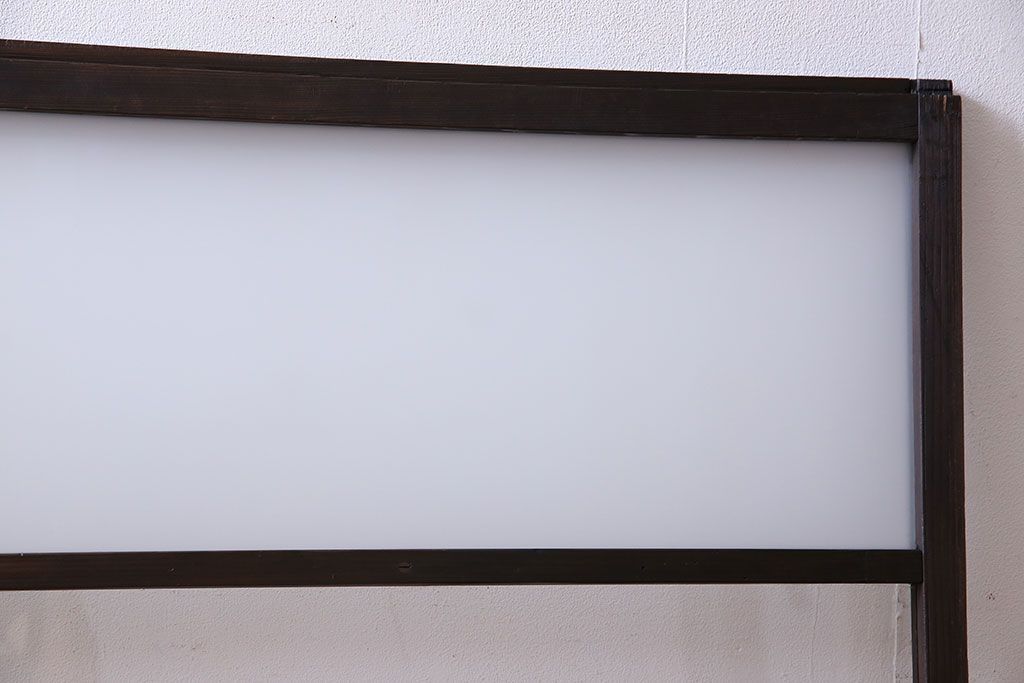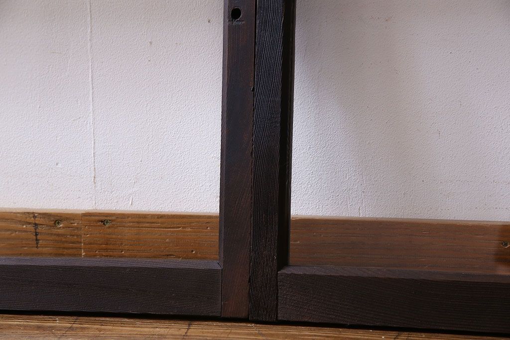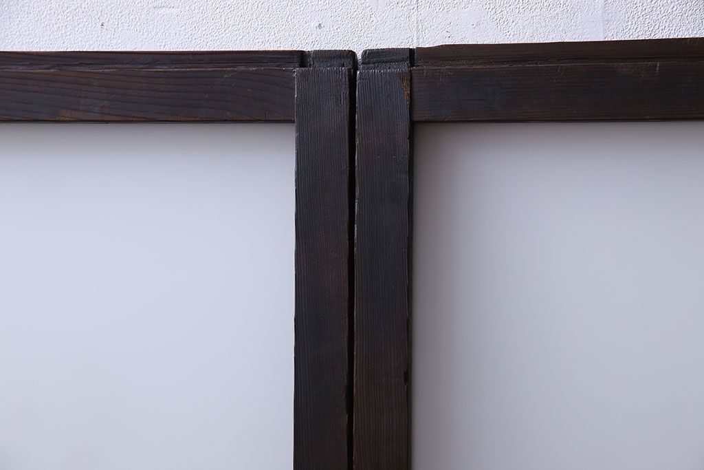 和製アンティーク 2種のガラスがアクセントのシンプルなガラス戸(窓、引き戸、建具)2枚組です。 シンプルなデザインがお部屋に取り入れやすい、 和製アンティークのガラス戸です。 上部にすりガラス、 下部にはクリアガラスが使われており、 2種の異なる質感がアクセントになった一品です。 木枠の濃い色合いも相まって、 モダンな空間づくりにぴったりですよ。 戸車はスムーズに動きます。 1枚目の画像にあるガラス戸2枚のうち、左のみ計測致しましたので、そちらをご参考ください。 使用上問題のあるダメージはありません。 ■重量 約4kg(1枚) ■框サイズ 上45mm/左30mm/右30mm/下50mm