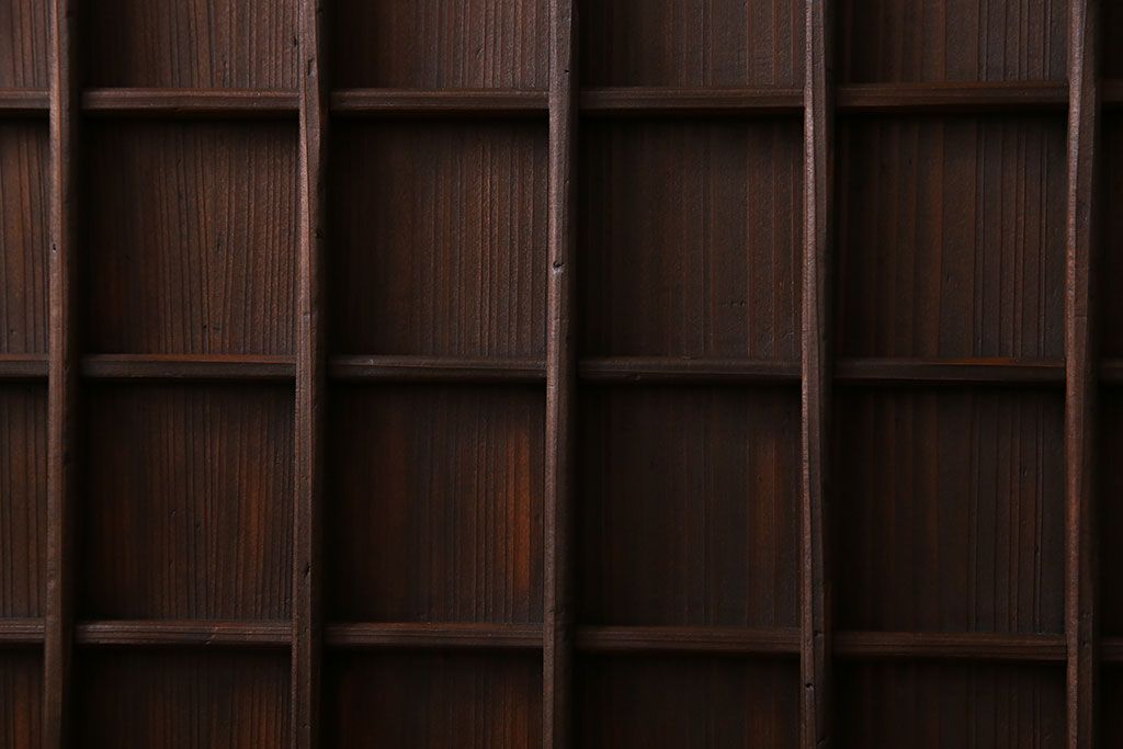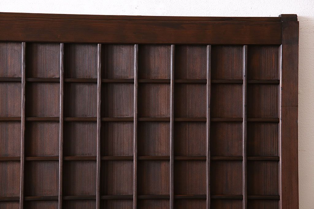 ラフジュ工房> 衝立・パーテーション > 和製アンティーク 両面マス目格子 シックな色合いの板戸(きつね格子、狐格子、引き戸、仕切り戸、建具)