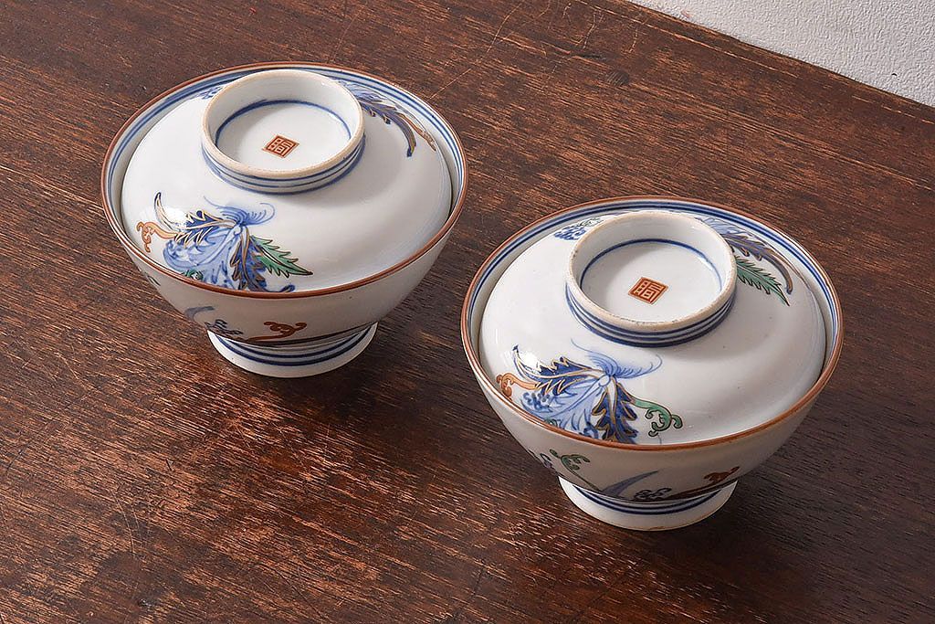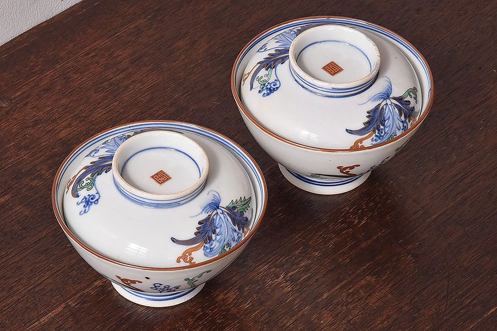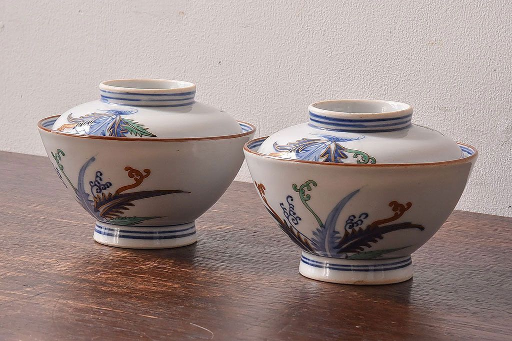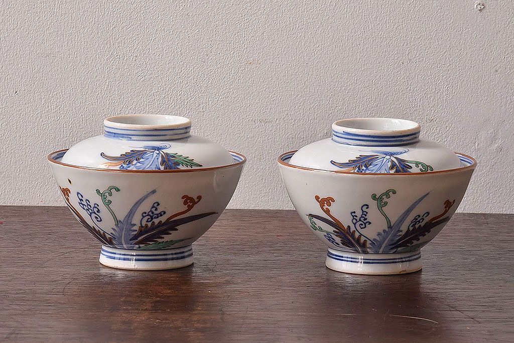 アンティーク雑貨 和製アンティーク 色絵 蓋付き茶碗2客セット(2)