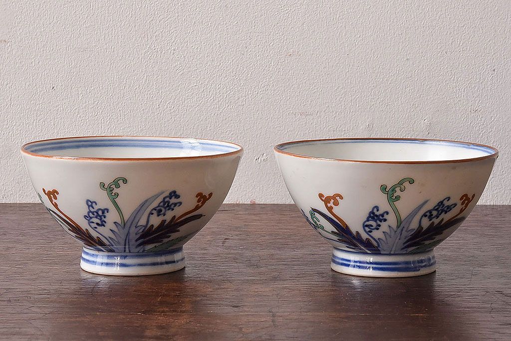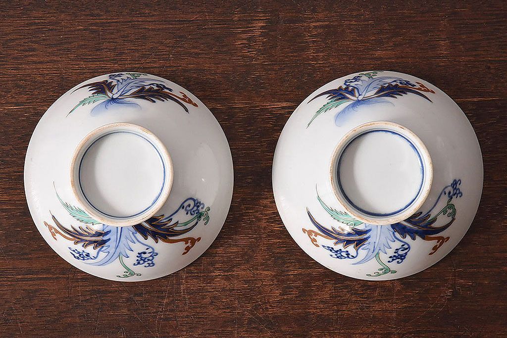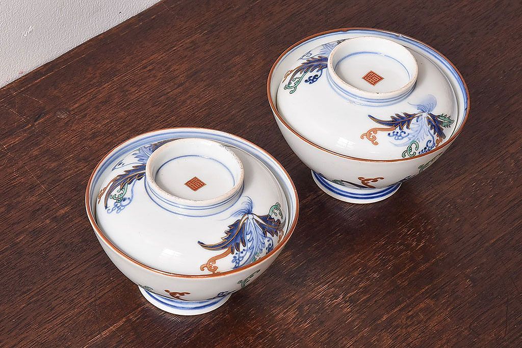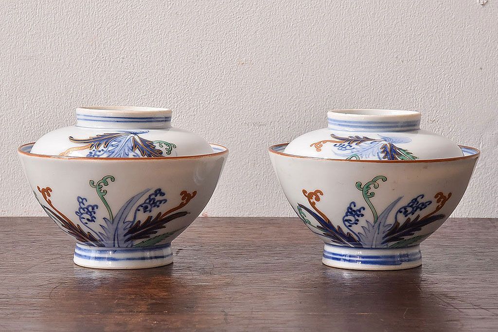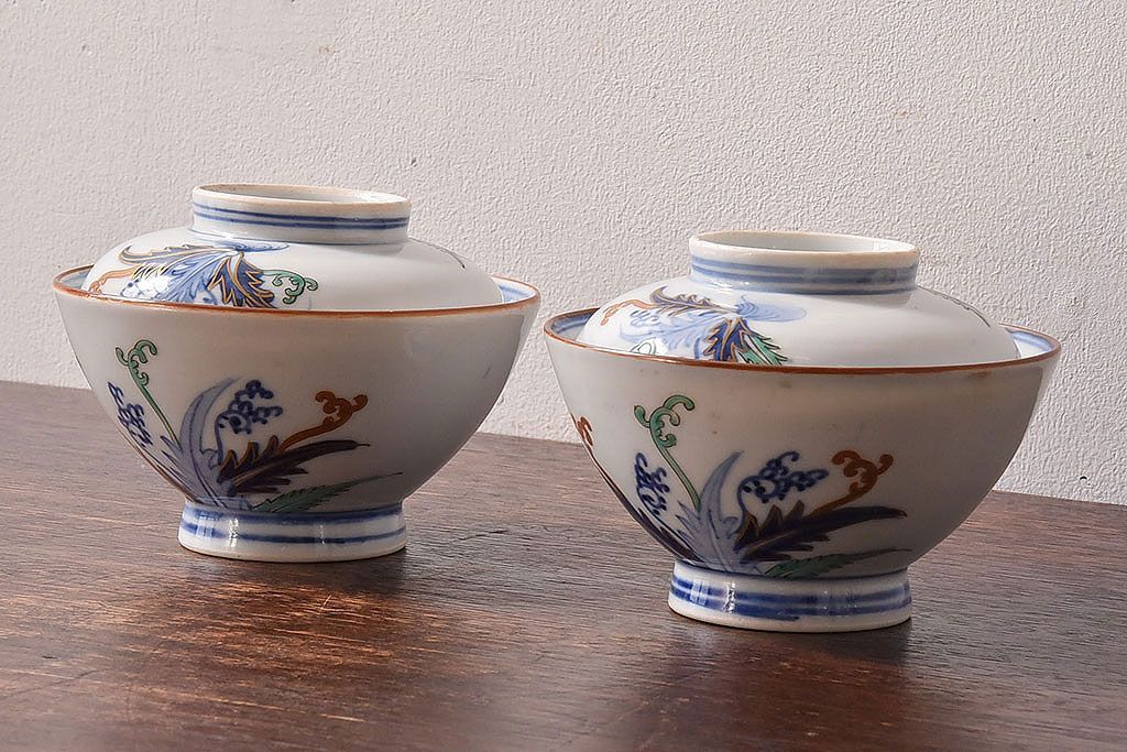 アンティーク雑貨 和食器 色絵 アンティーク蓋付き茶碗2客セット(1)