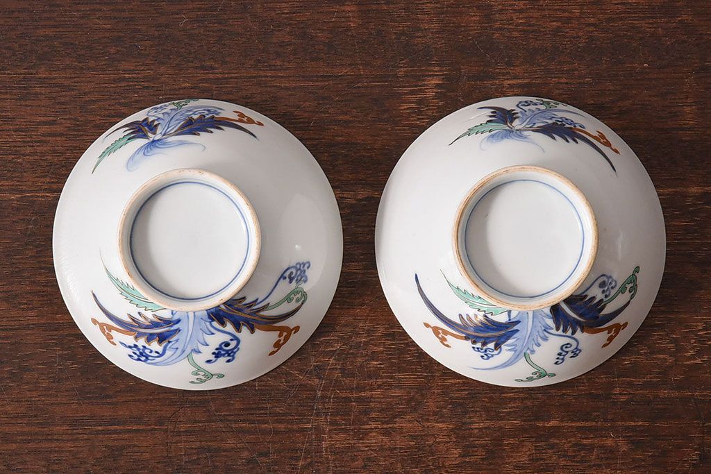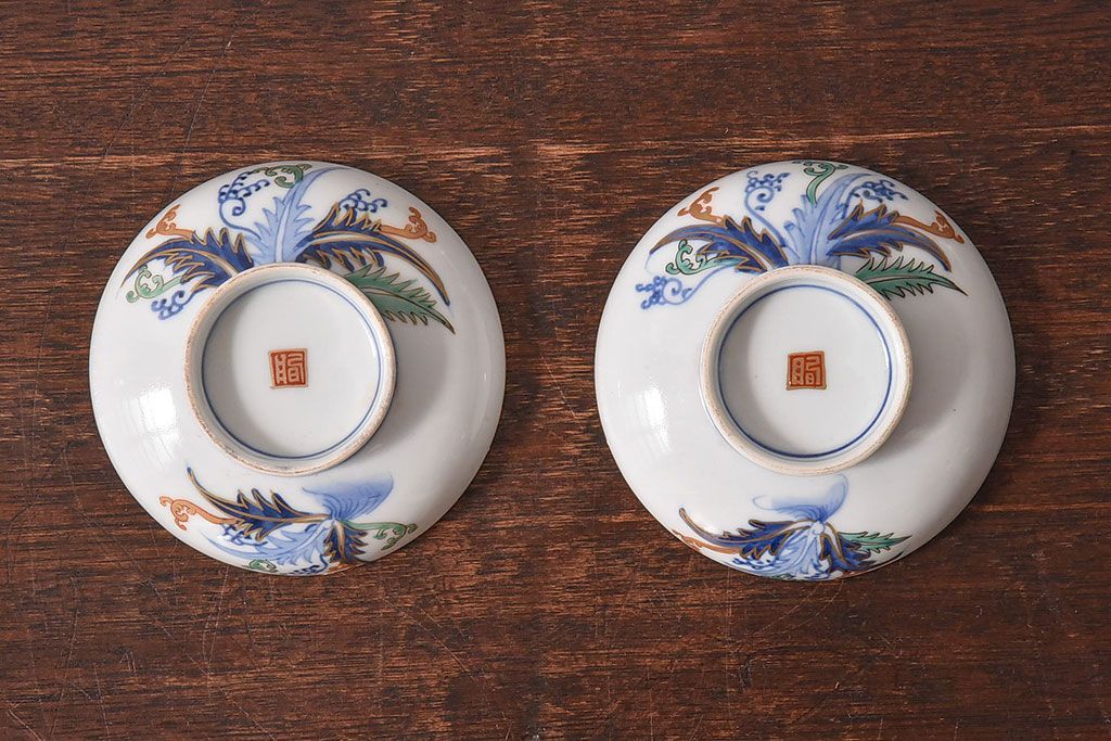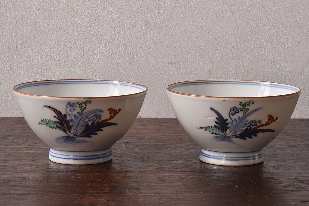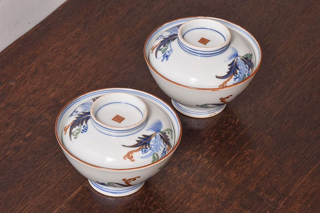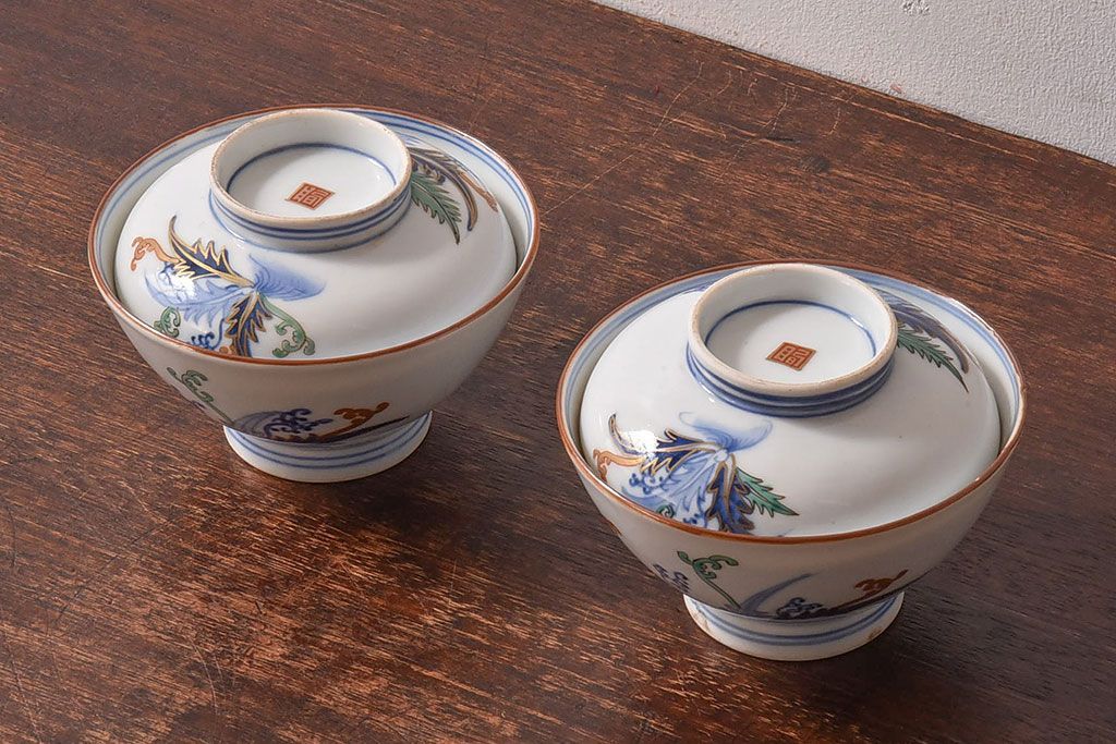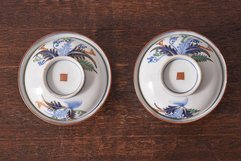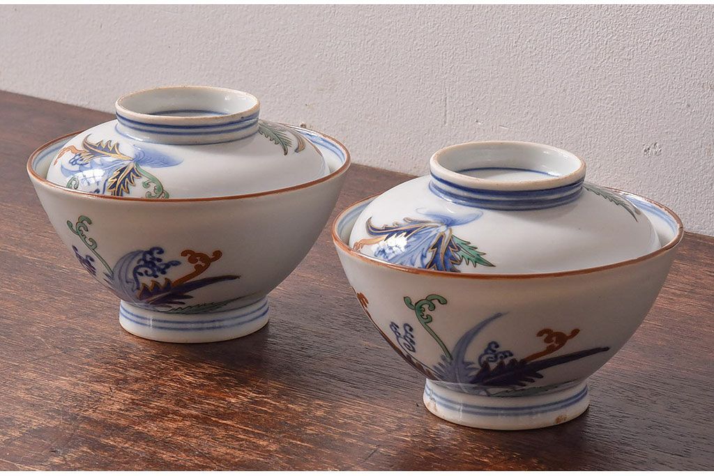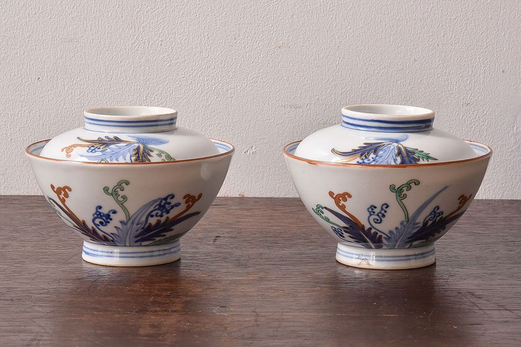 アンティーク雑貨 和製アンティーク 色絵 蓋付き茶碗2客セット(1)