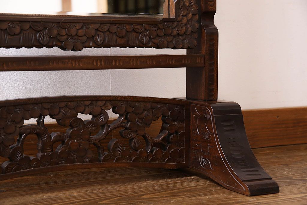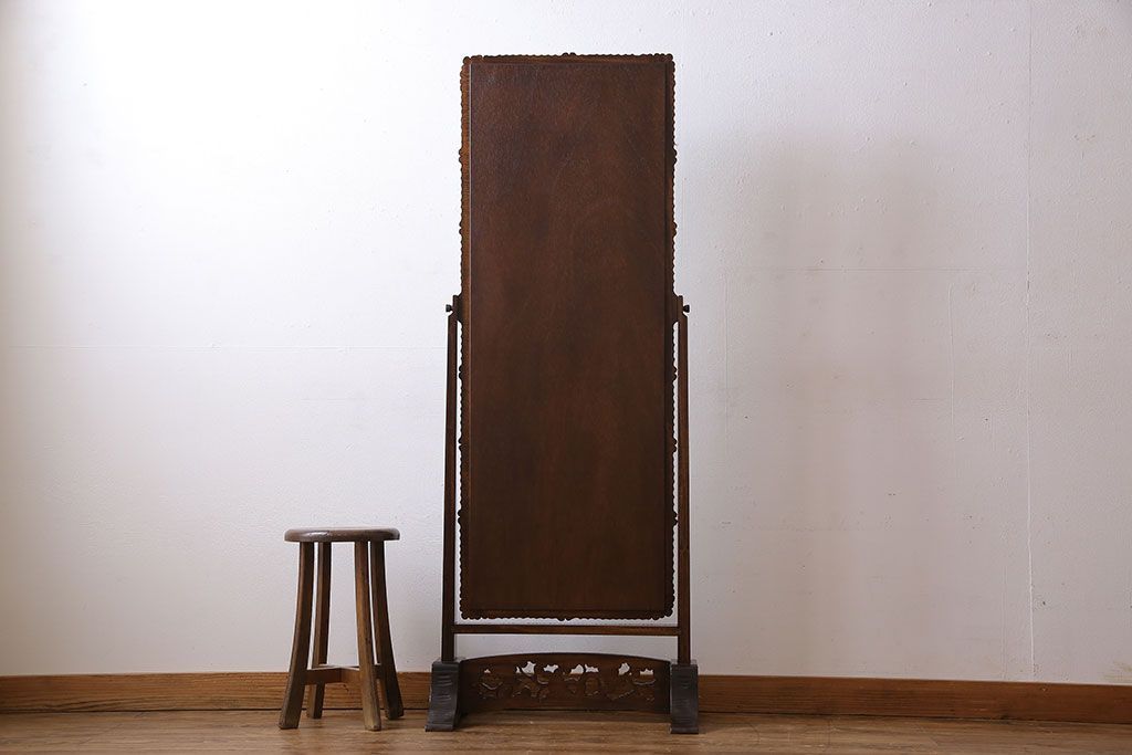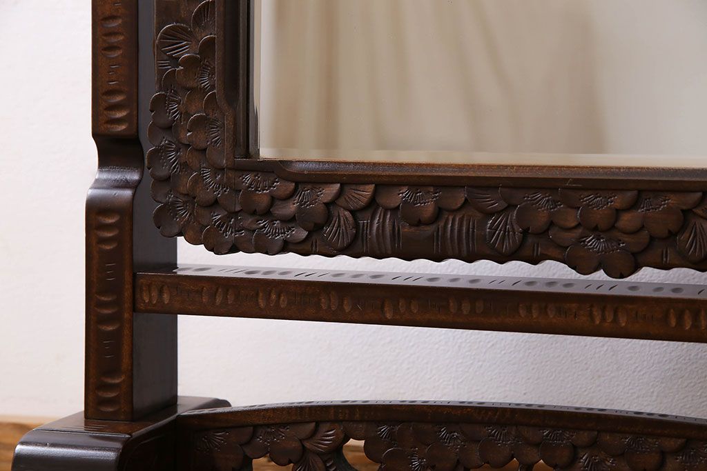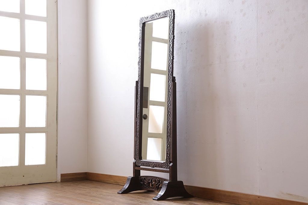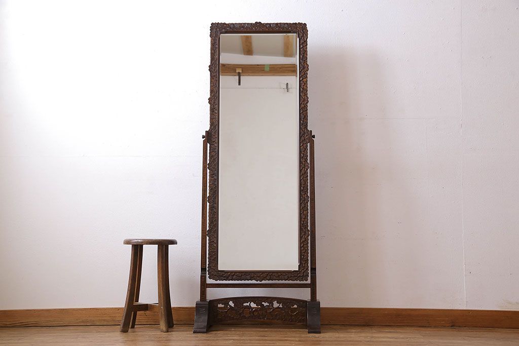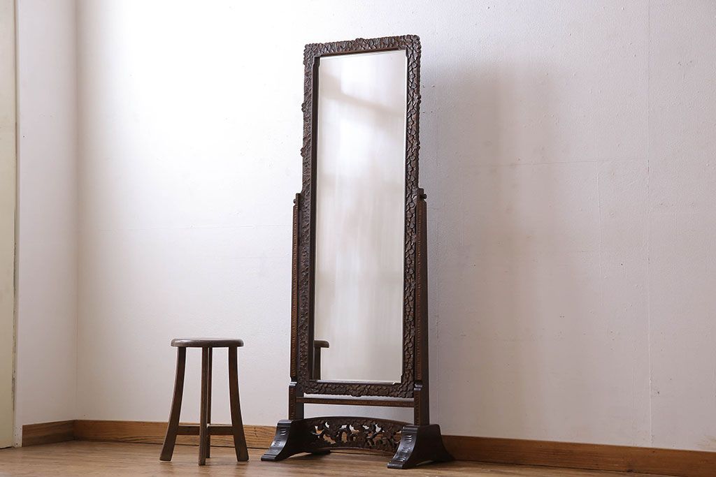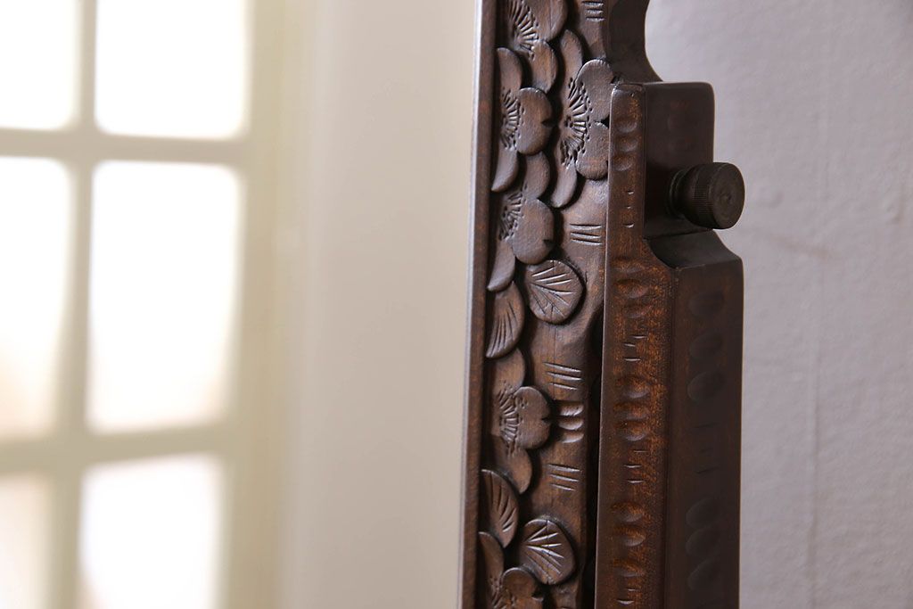 民芸家具 > アンティーク雑貨 中古 伝統工芸 軽井沢彫り 桜 彫刻が目を引く姿見(鏡、ミラー)