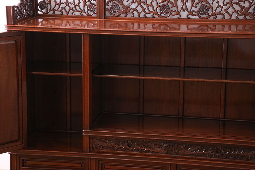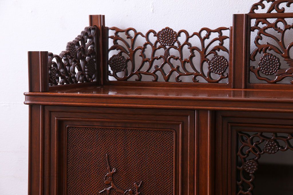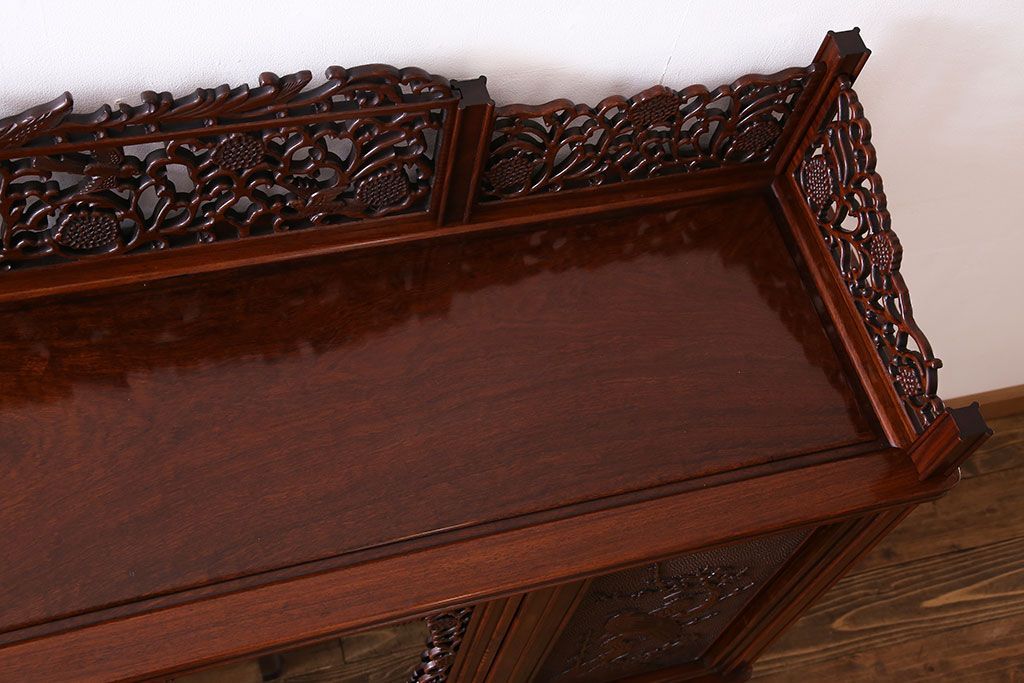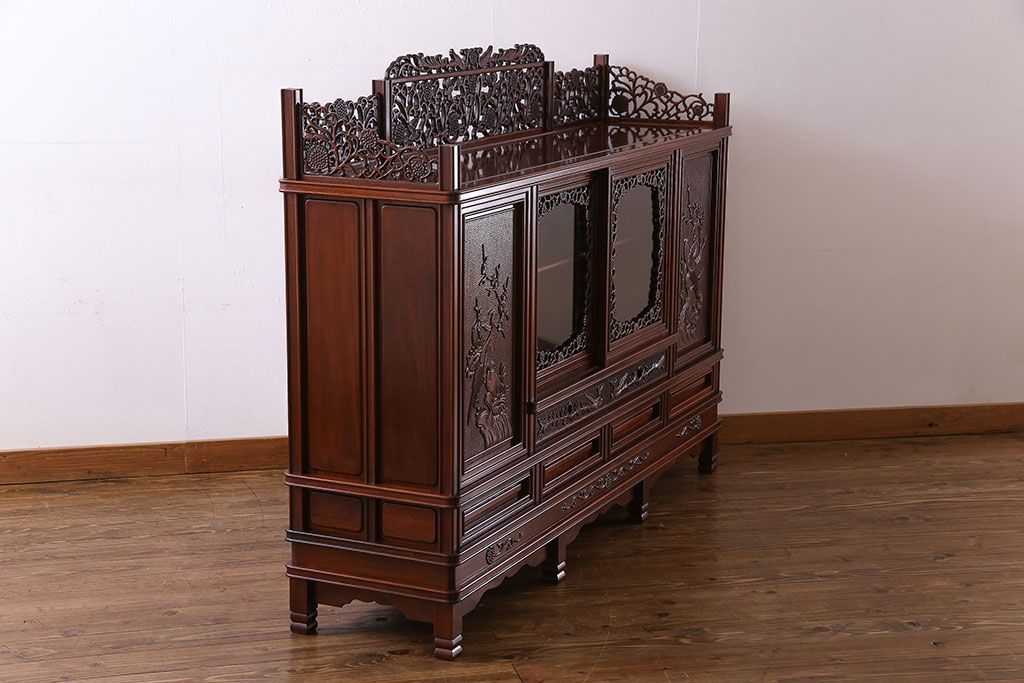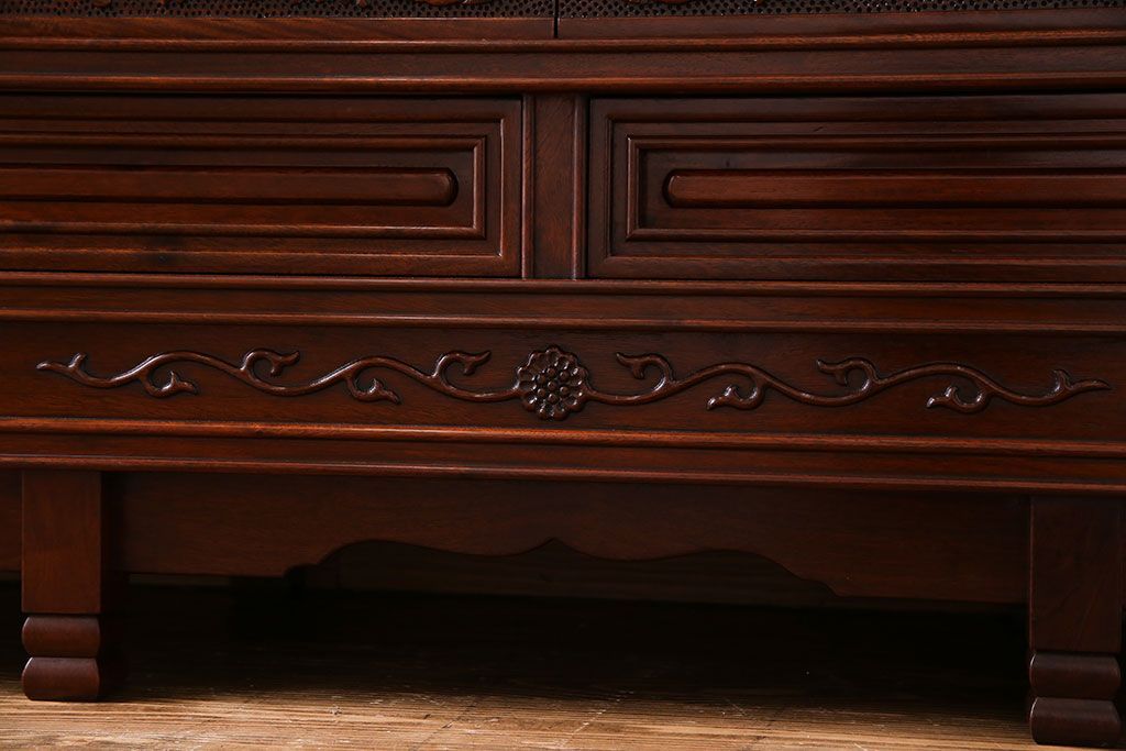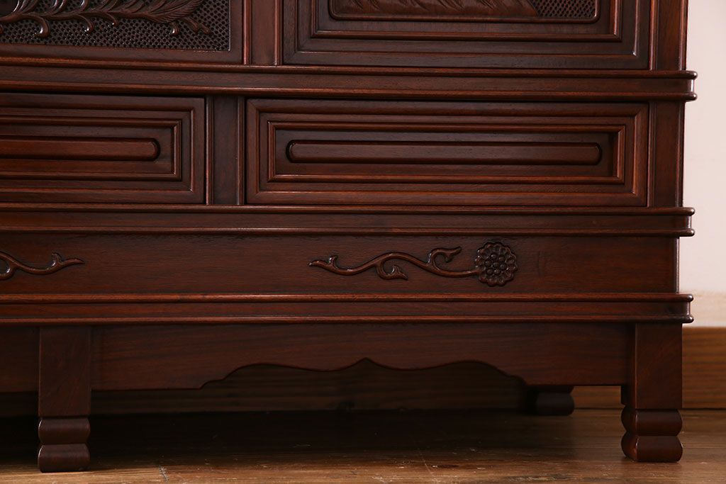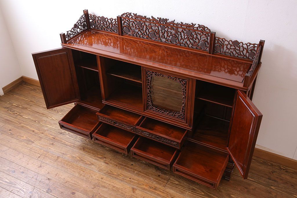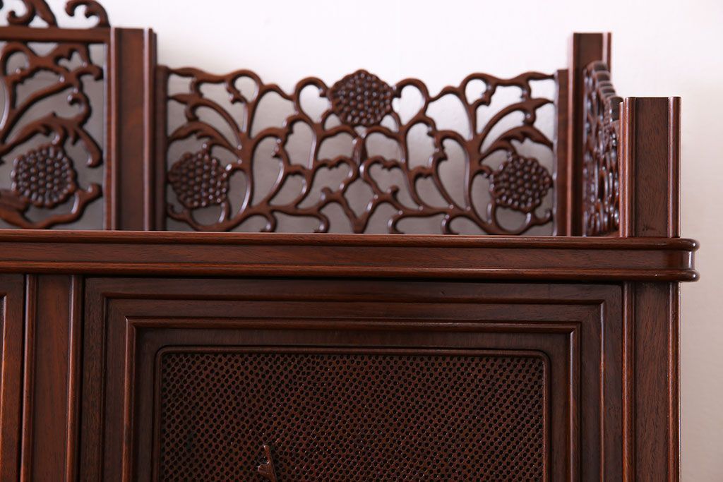 中古 民芸家具 唐木材(花梨材・カリン材)使用!美しい彫刻が目を惹く大振りなサイドボード(キャビネット、飾り棚)(定価約160万円)
