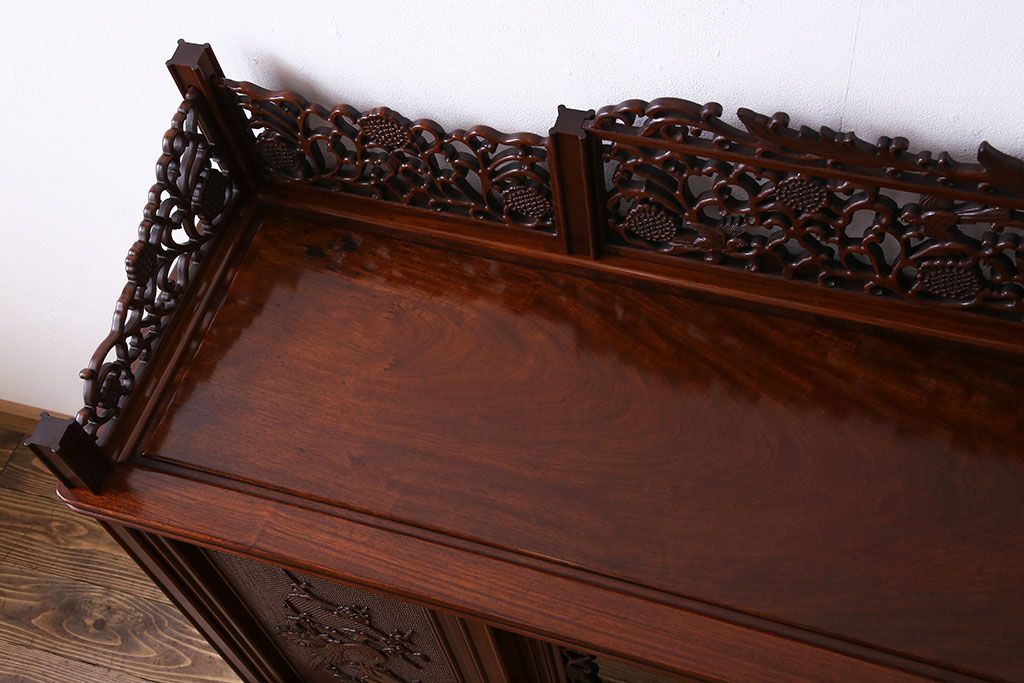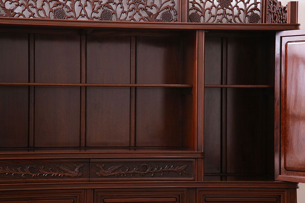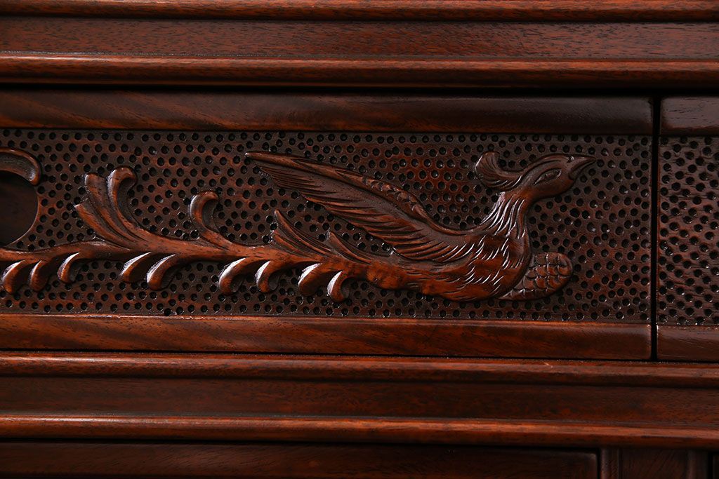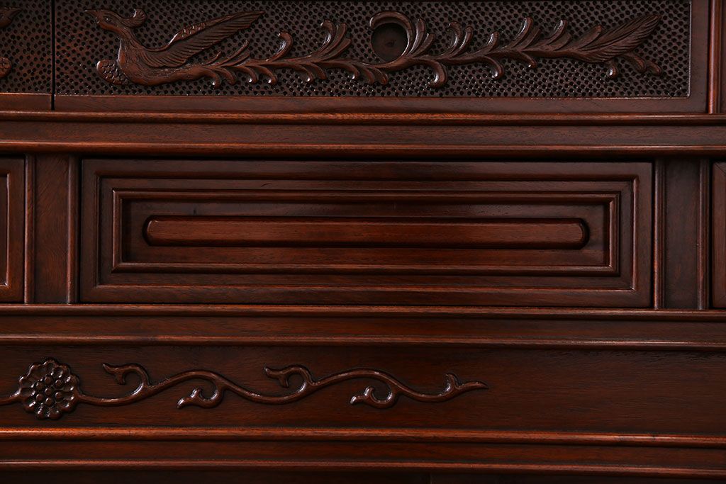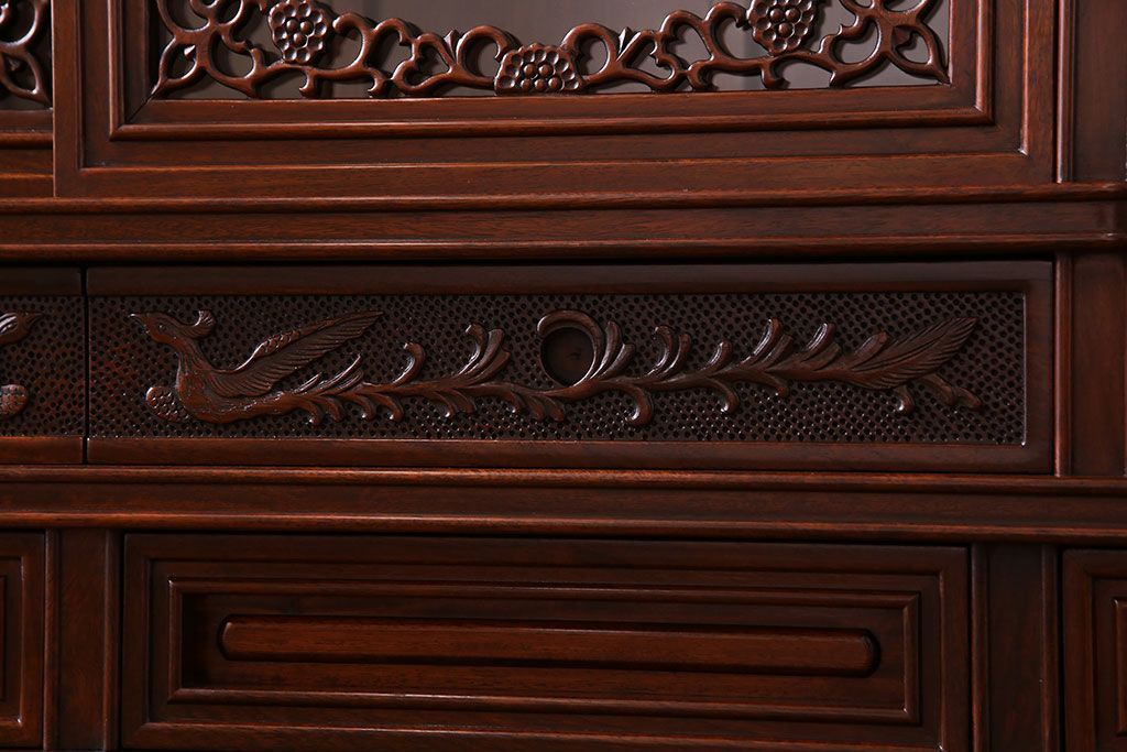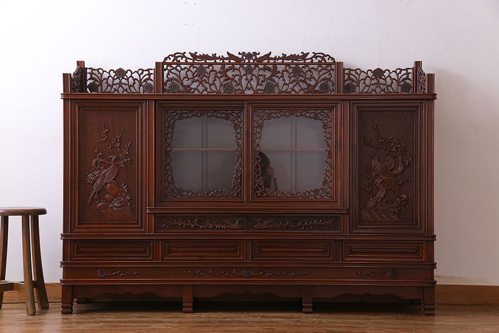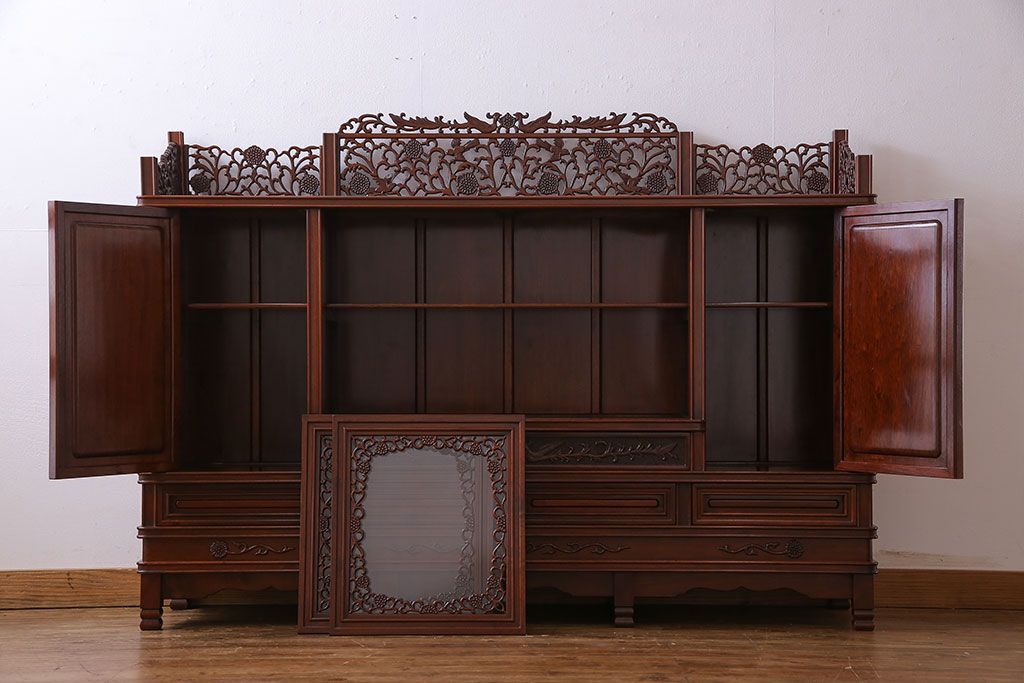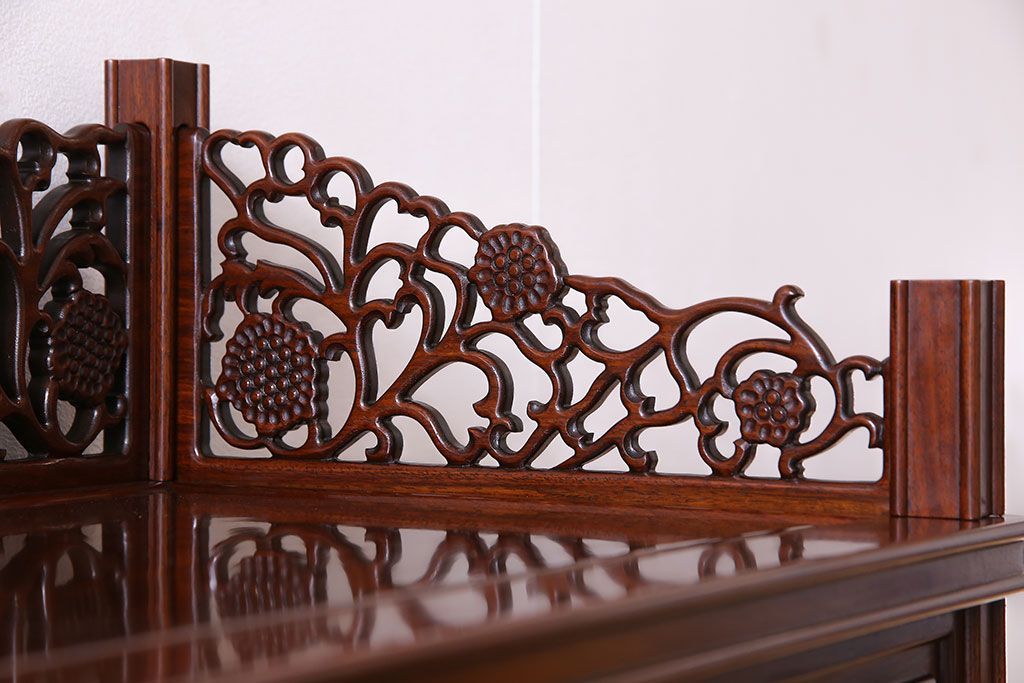 中古 民芸家具 唐木材(花梨材・カリン材)使用!美しい彫刻が目を惹く大振りなサイドボード(キャビネット、飾り棚)(定価約160万円)