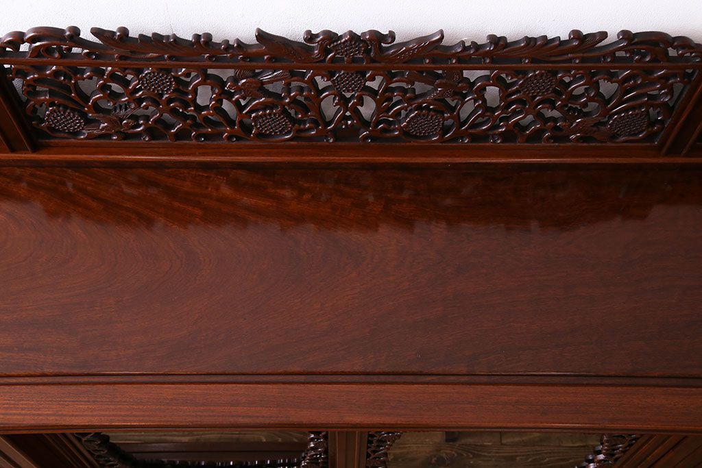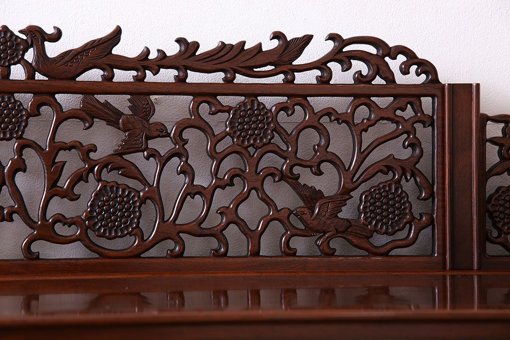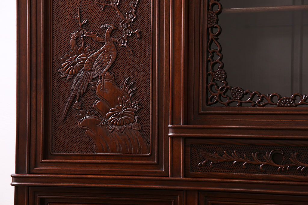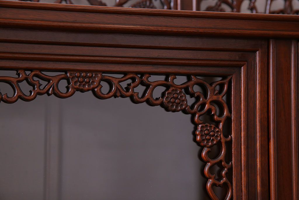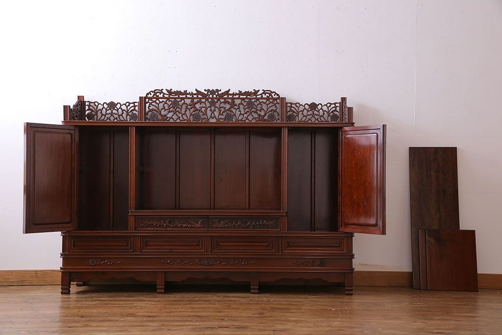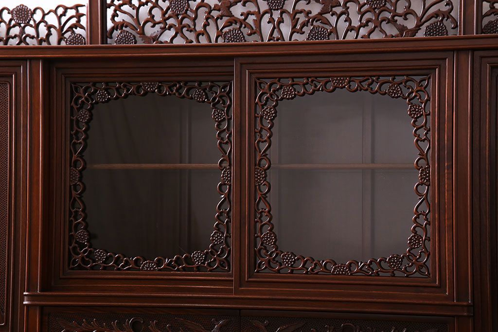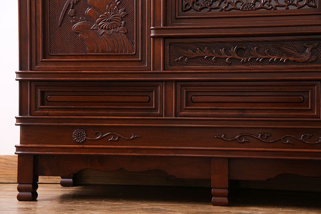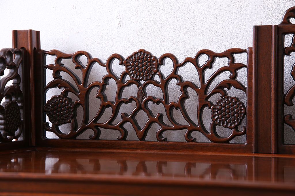 中古 民芸家具 唐木材(花梨材・カリン材)使用!美しい彫刻が目を惹く大振りなサイドボード(キャビネット、飾り棚)(定価約160万円)