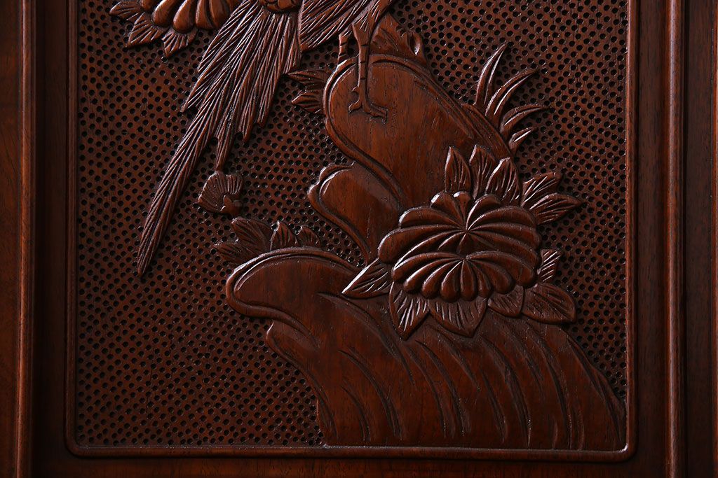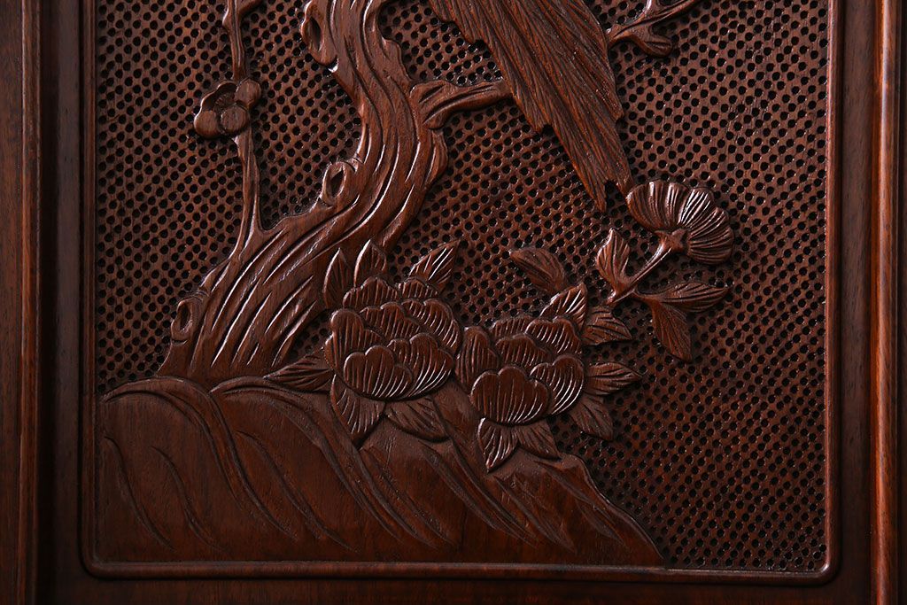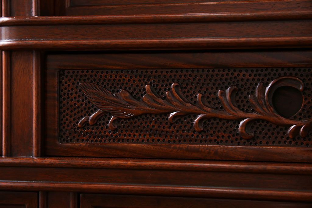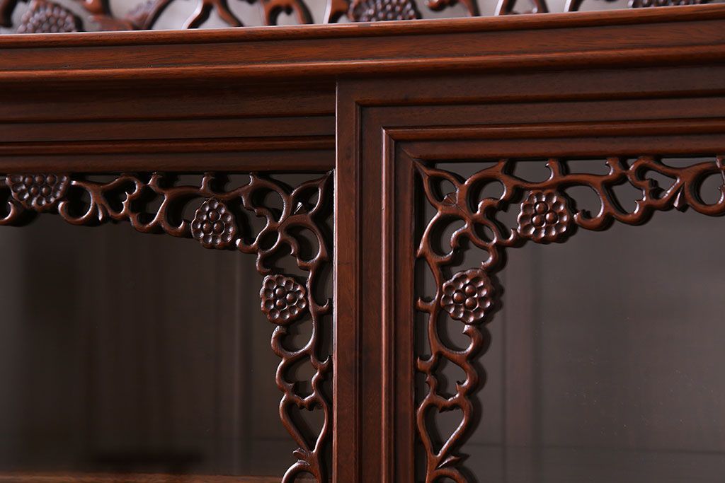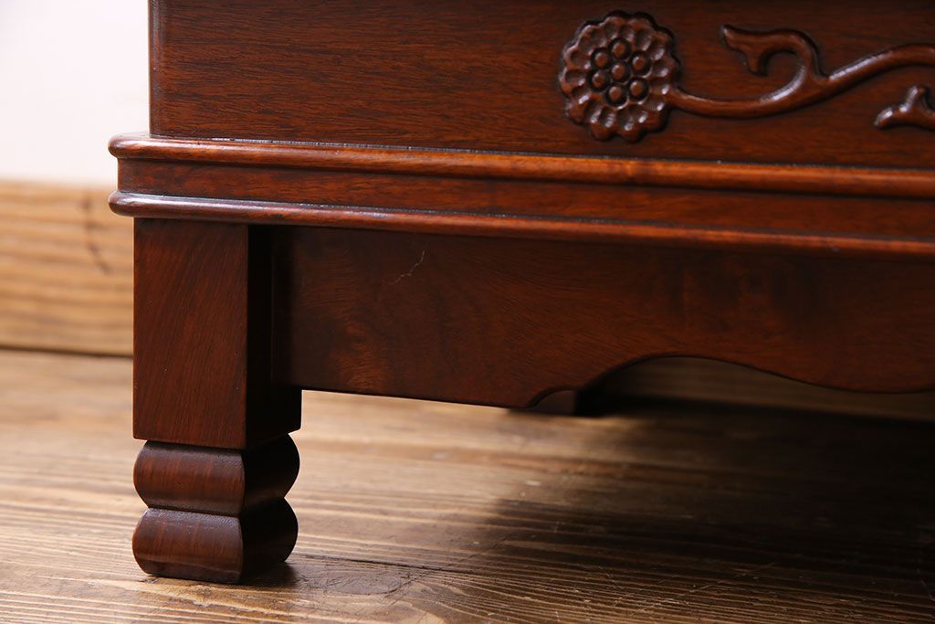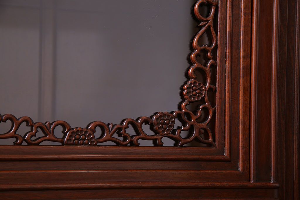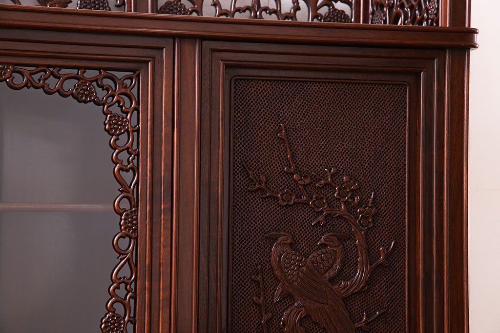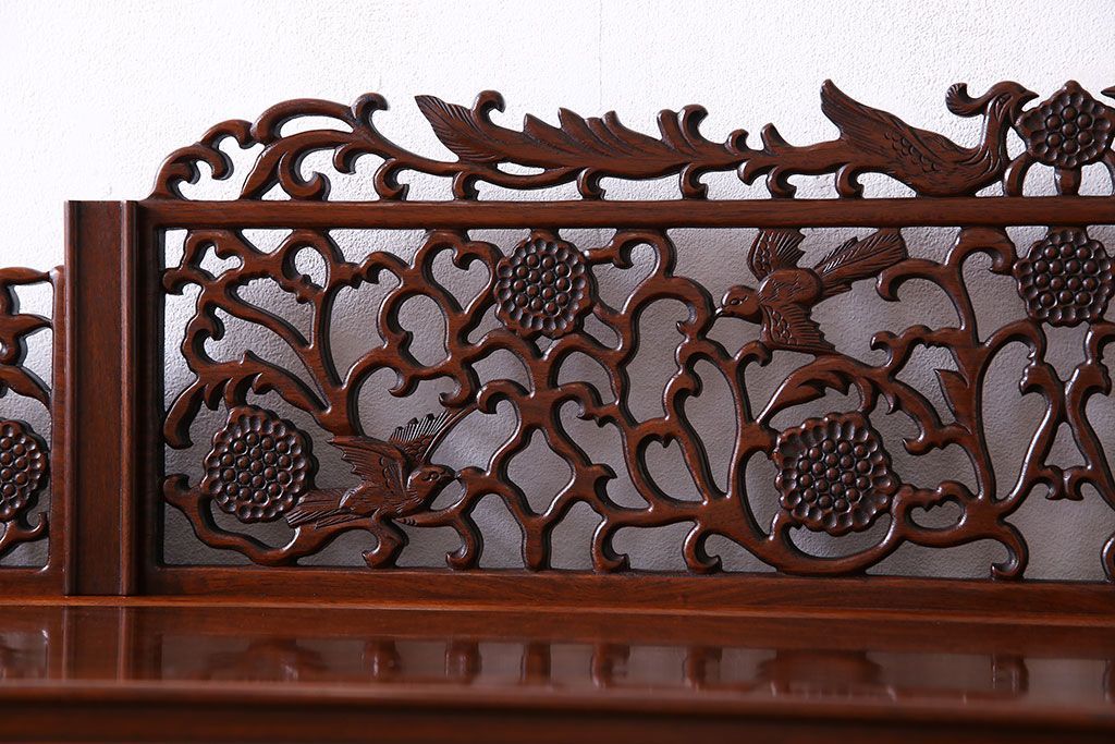 中古 民芸家具 唐木材(花梨材・カリン材)使用!美しい彫刻が目を惹く大振りなサイドボード(キャビネット、飾り棚)(定価約160万円)