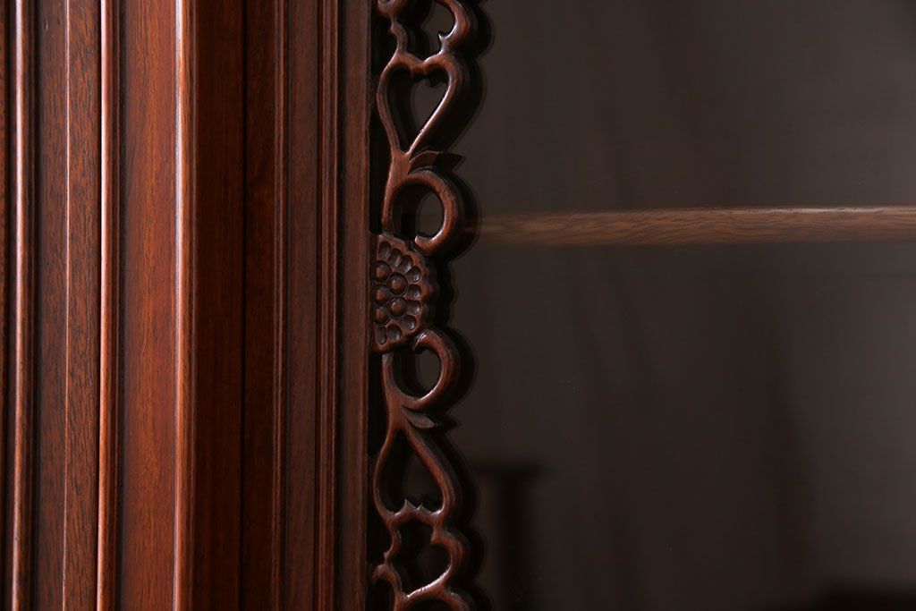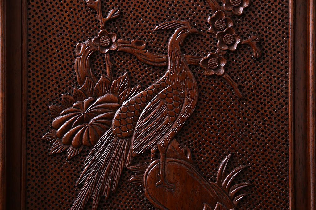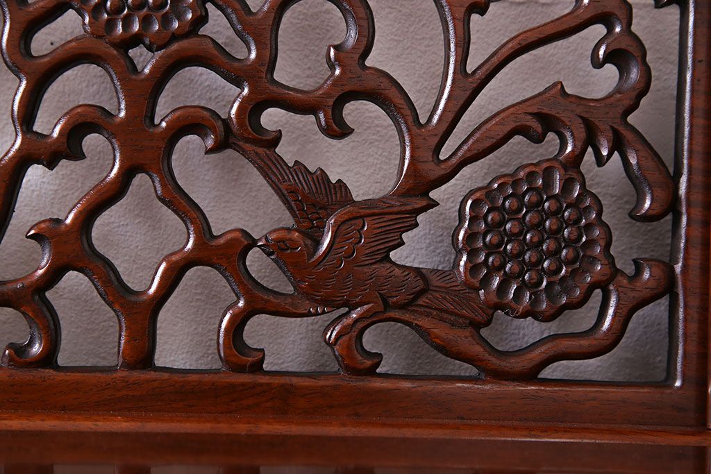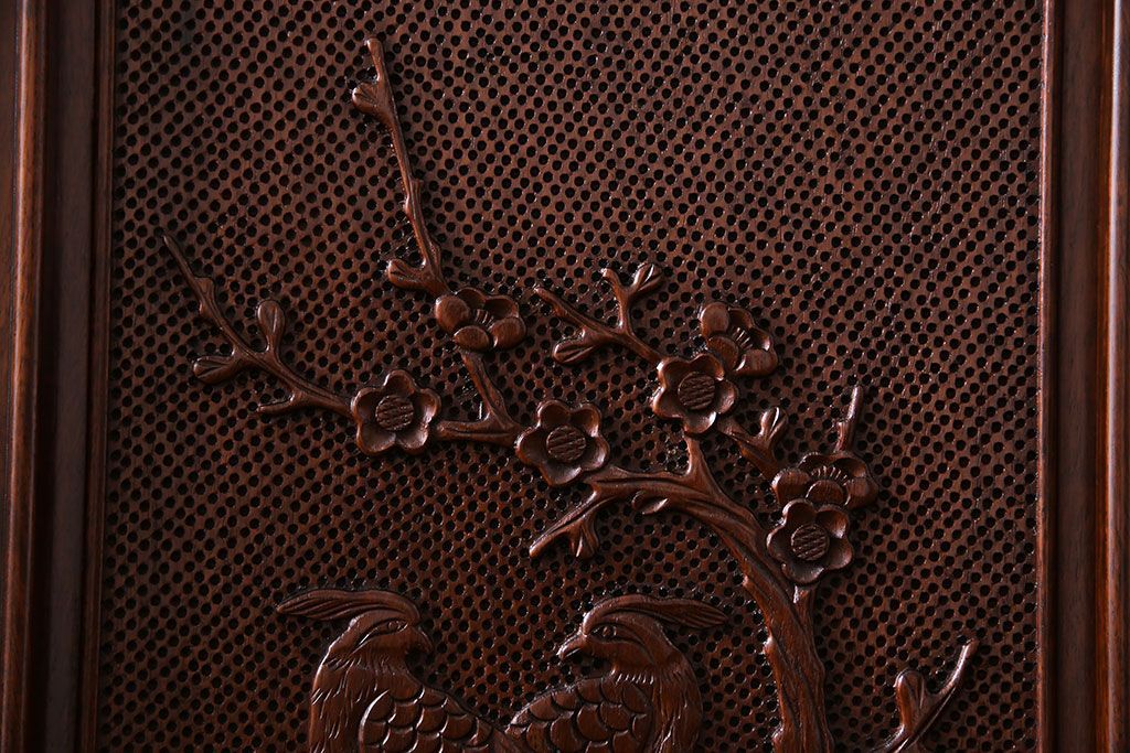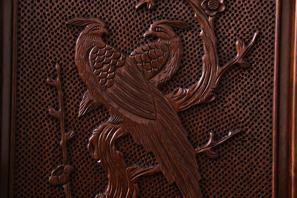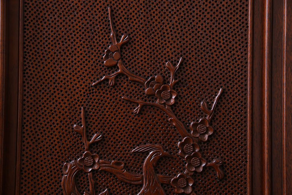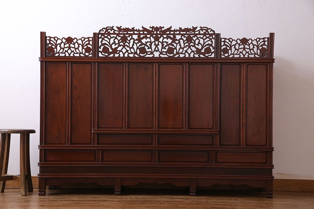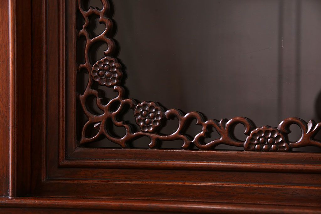 中古 民芸家具 唐木材(花梨材・カリン材)使用!美しい彫刻が目を惹く大振りなサイドボード(キャビネット、飾り棚)(定価約160万円)