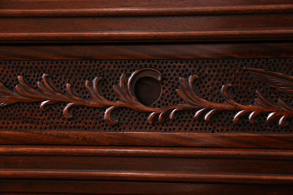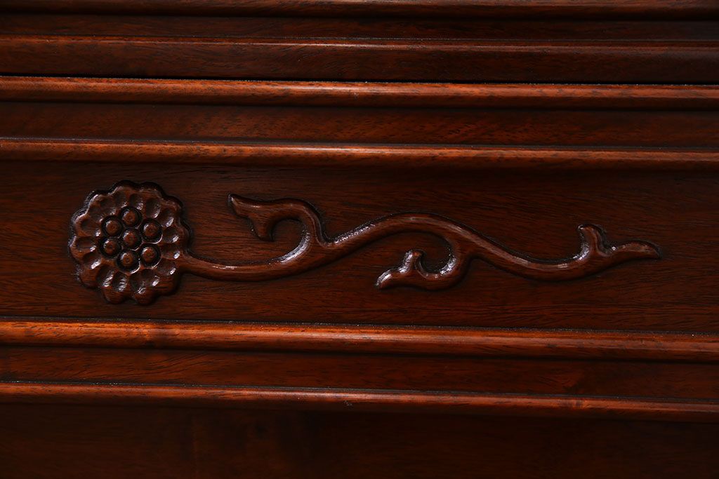 ラフジュ工房> 民芸家具 > 中古 民芸家具 唐木材(花梨材・カリン材)使用!美しい彫刻が目を惹く大振りなサイドボード(キャビネット、飾り棚)(定価約160万円)