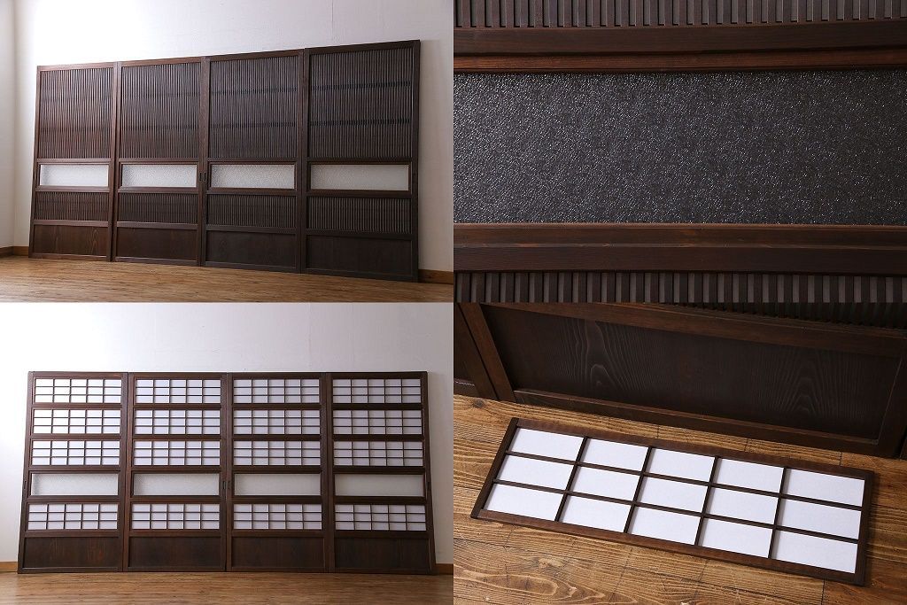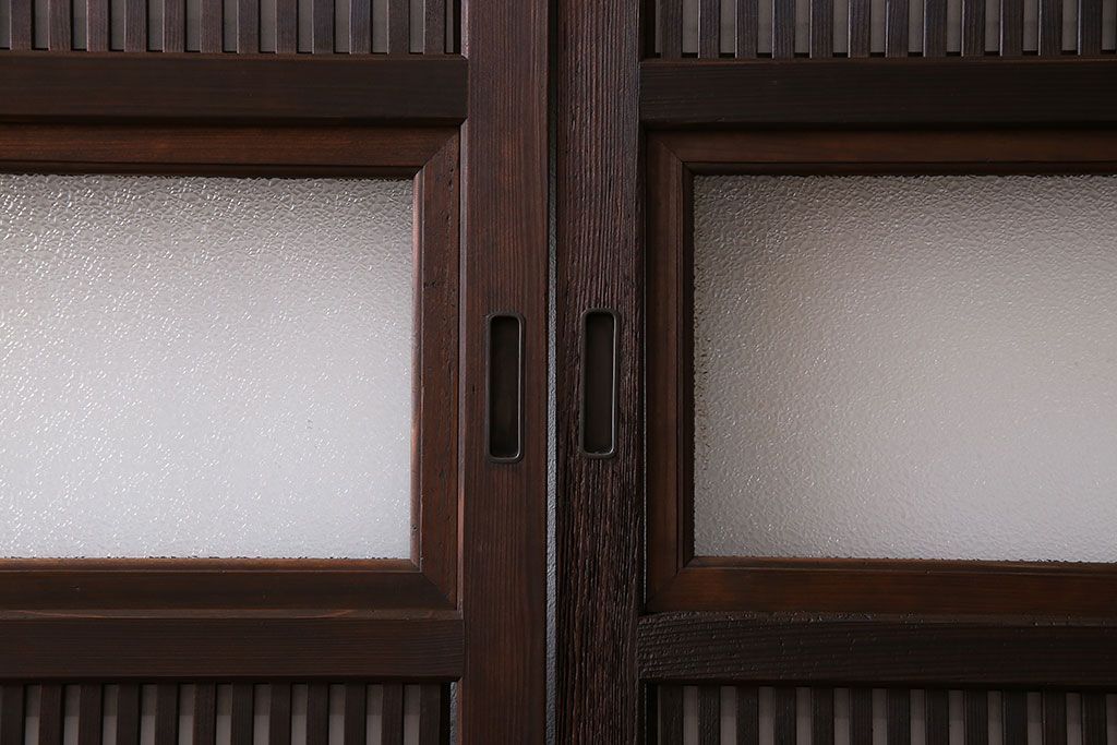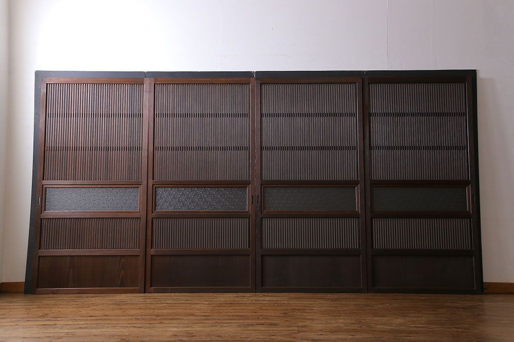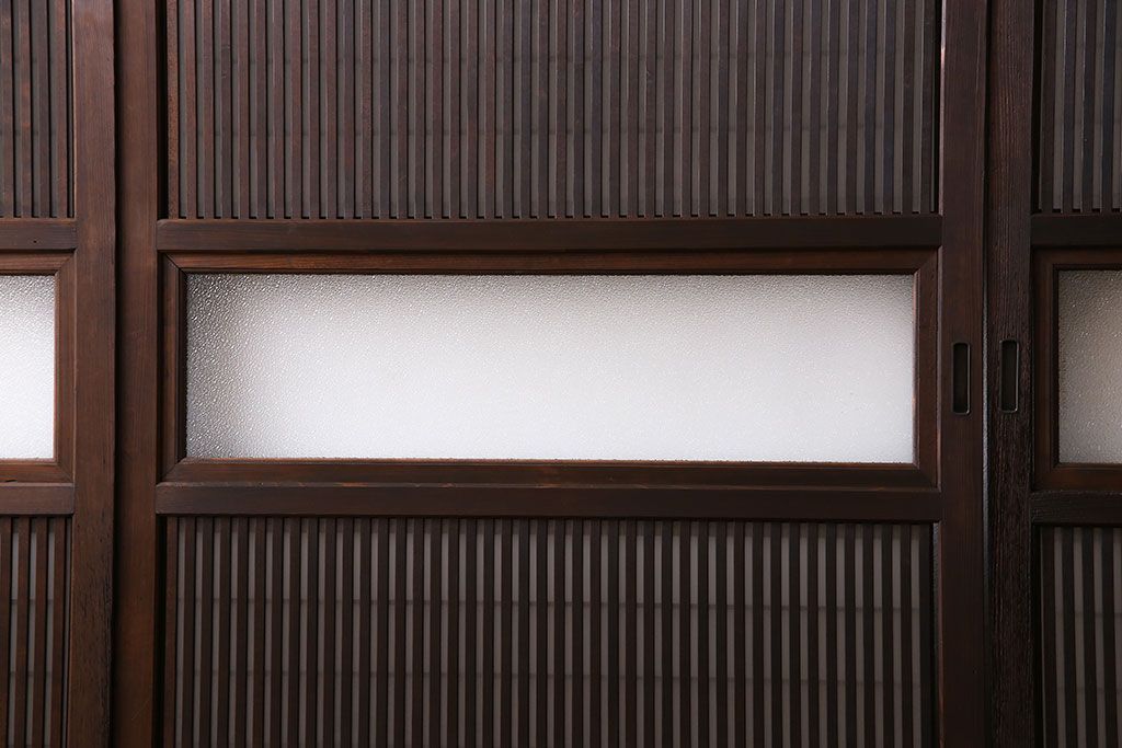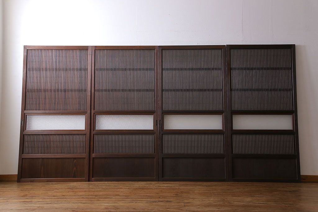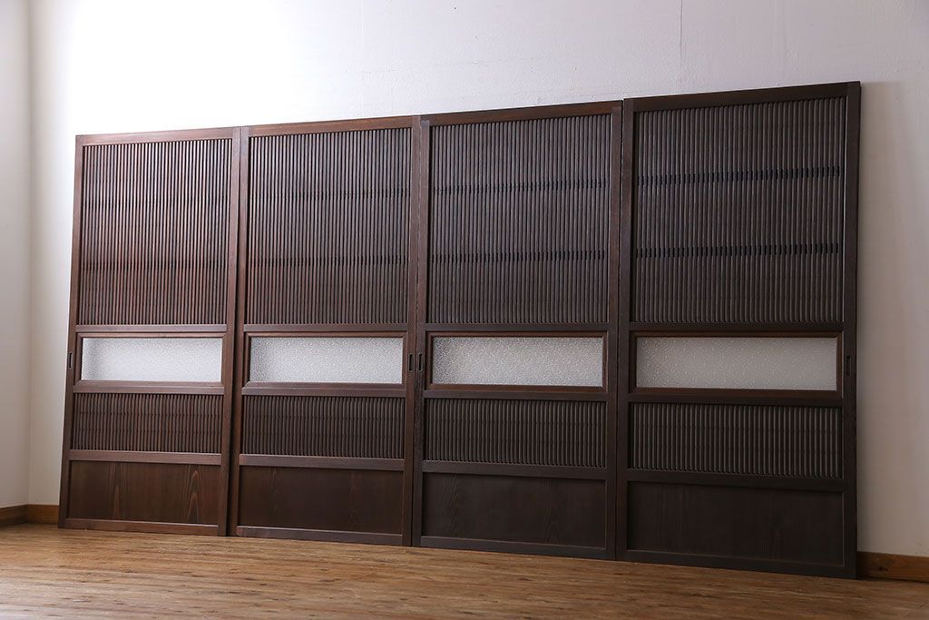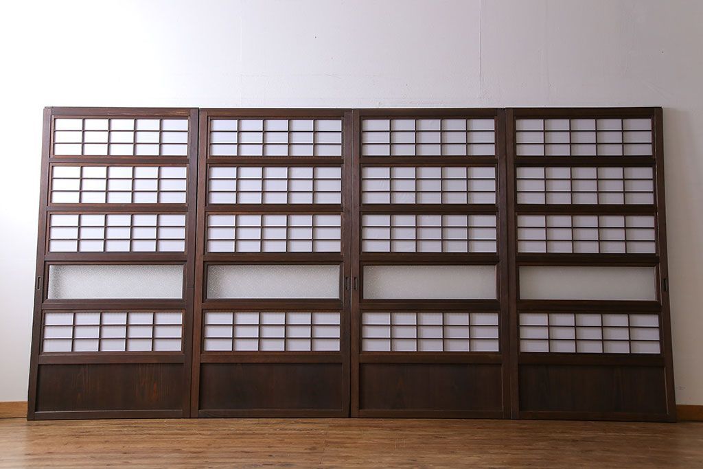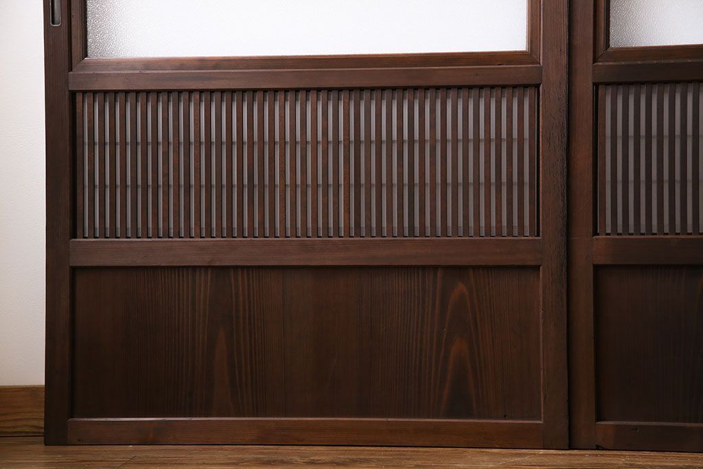 和製アンティーク 裏障子付き 上品な雰囲気漂うガラス帯格子戸(引き戸、障子戸、建具)4枚セット