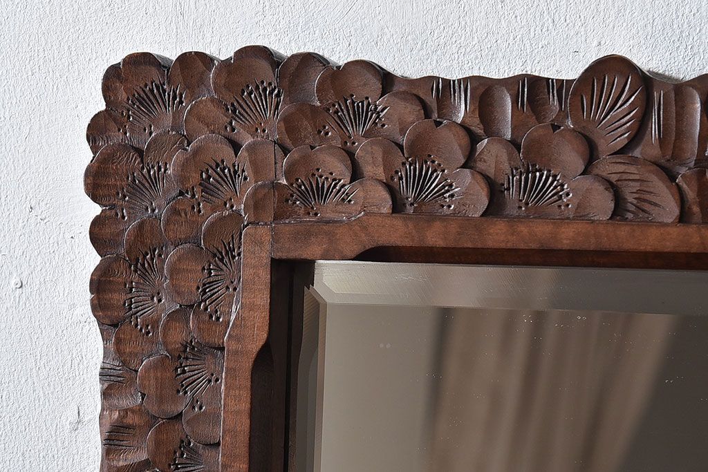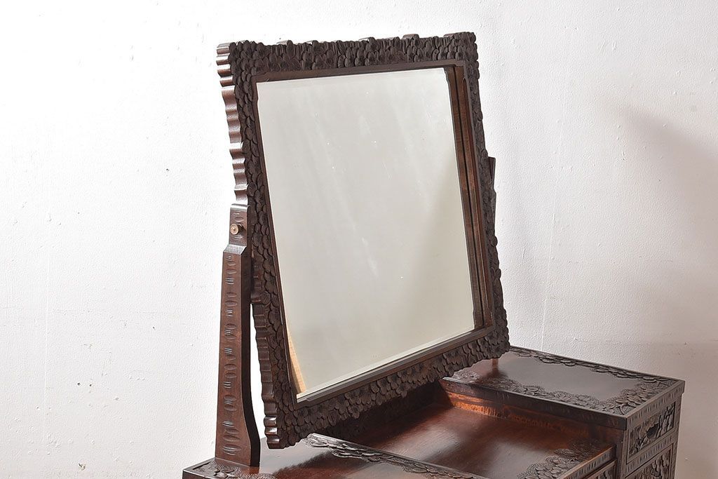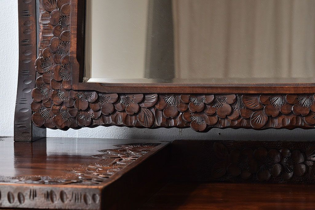 シックで上質な空間づくりにぴったりの、軽井沢彫りのドレッサーと椅子のセットです。豪華な桜の彫刻柄が存在感を放ち、職人の繊細な技を存分に感じることのできる一品です。軽井沢彫りの家具は、明治時代に軽井沢に別荘を建てた欧米人のためにつくられたのがはじまりで、西洋家具の形式と日本の伝統技法の融和が特徴です。こちらのドレッサーも西洋のアンティーク家具とも相性が良く、シックでクラシカルなお部屋に合わせるのも素敵ですよ。女性のための特別なスペースに、こちらの上品ながらも華やかなドレッサーはいかがでしょうか。