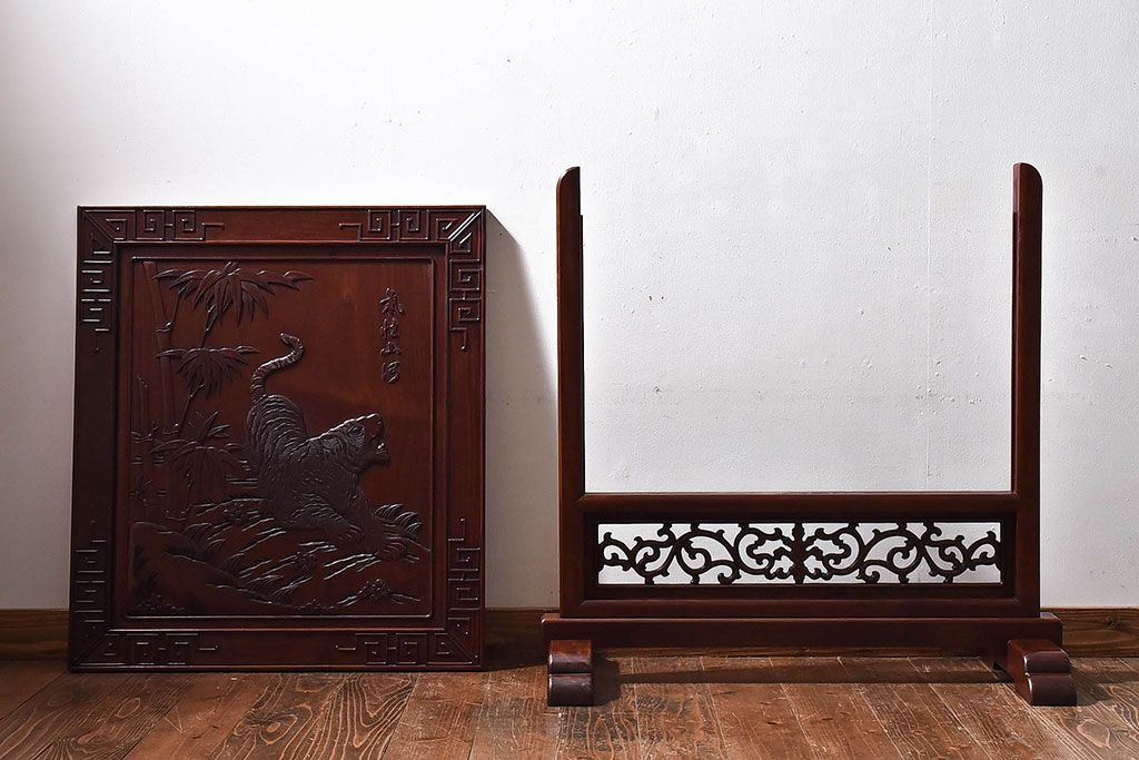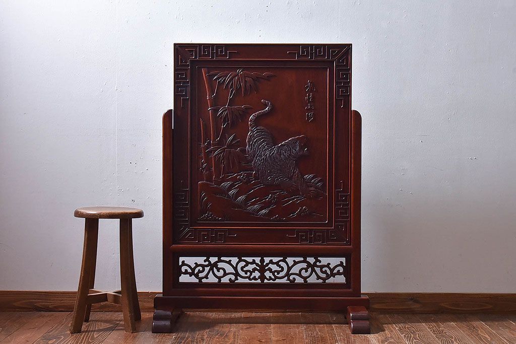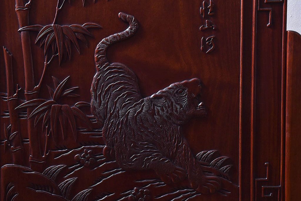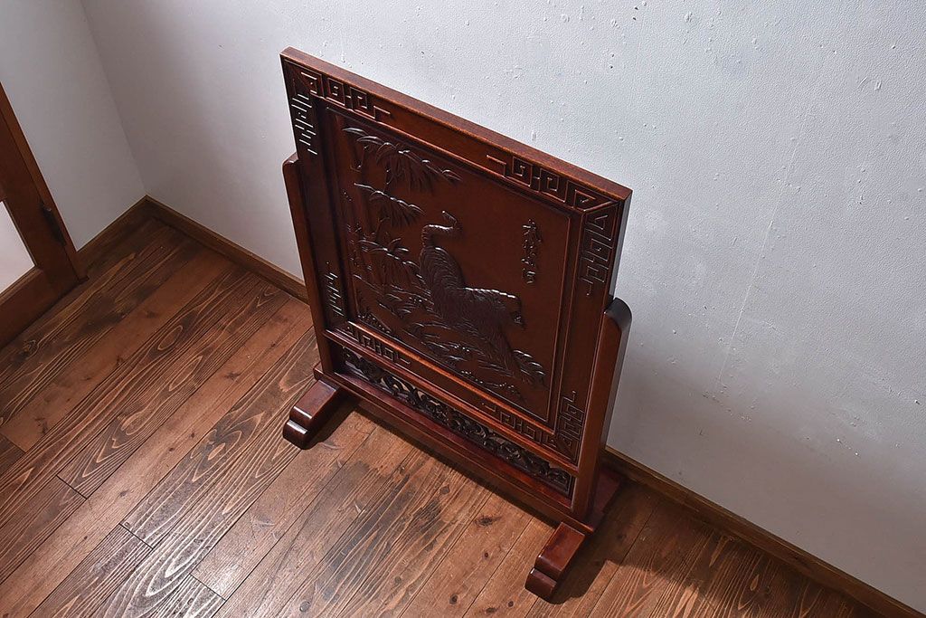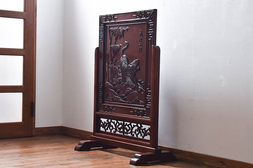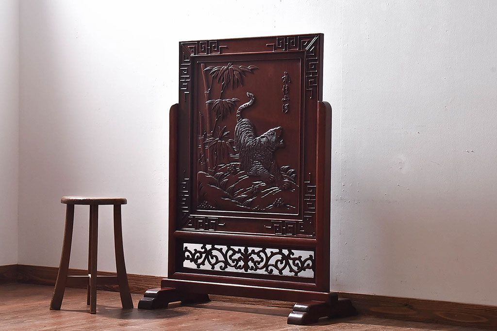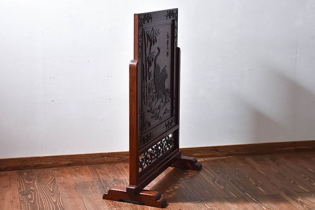 アンティーク雑貨 中国 虎の図 漆塗りが美しい上質な唐木の衝立(パーテーション)
