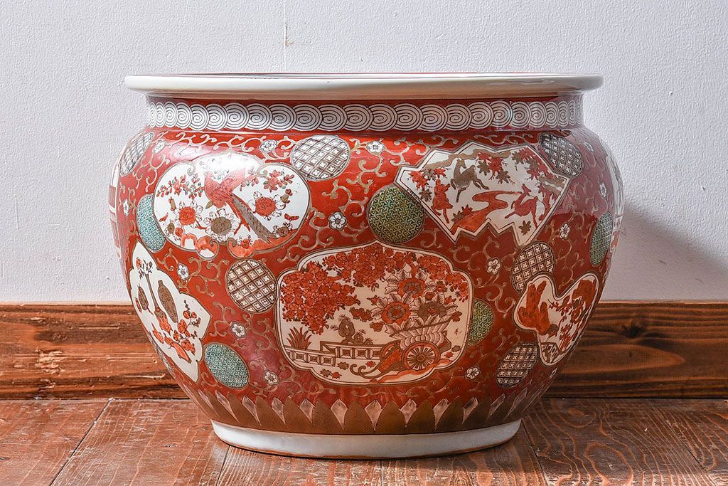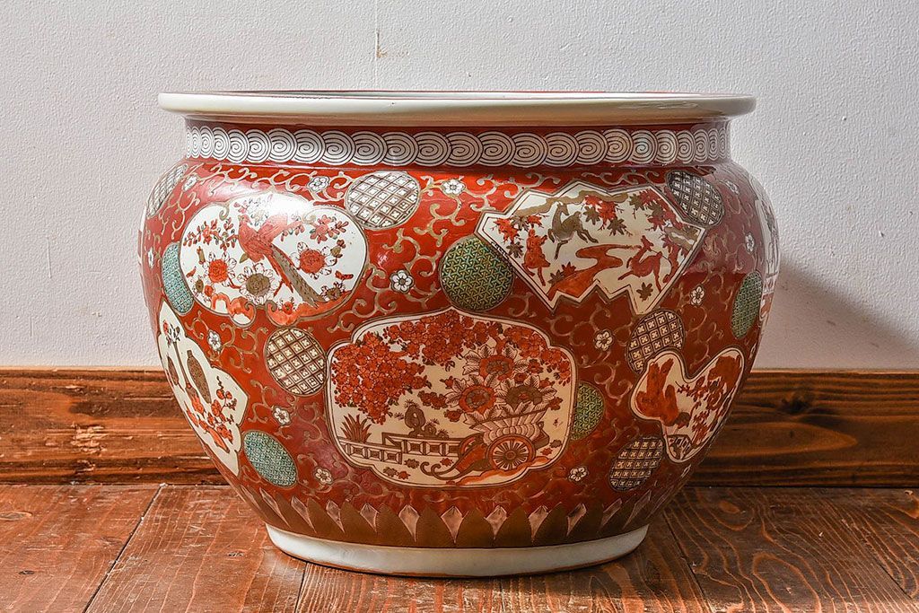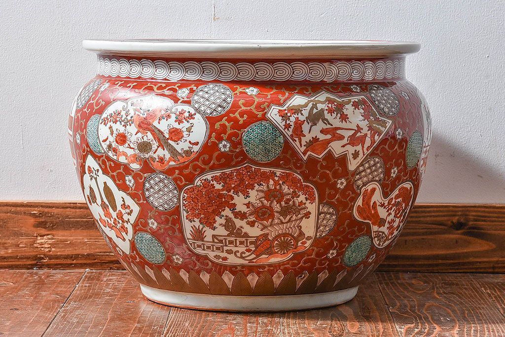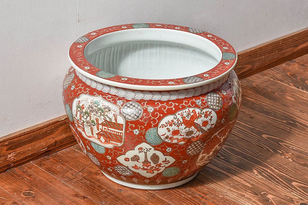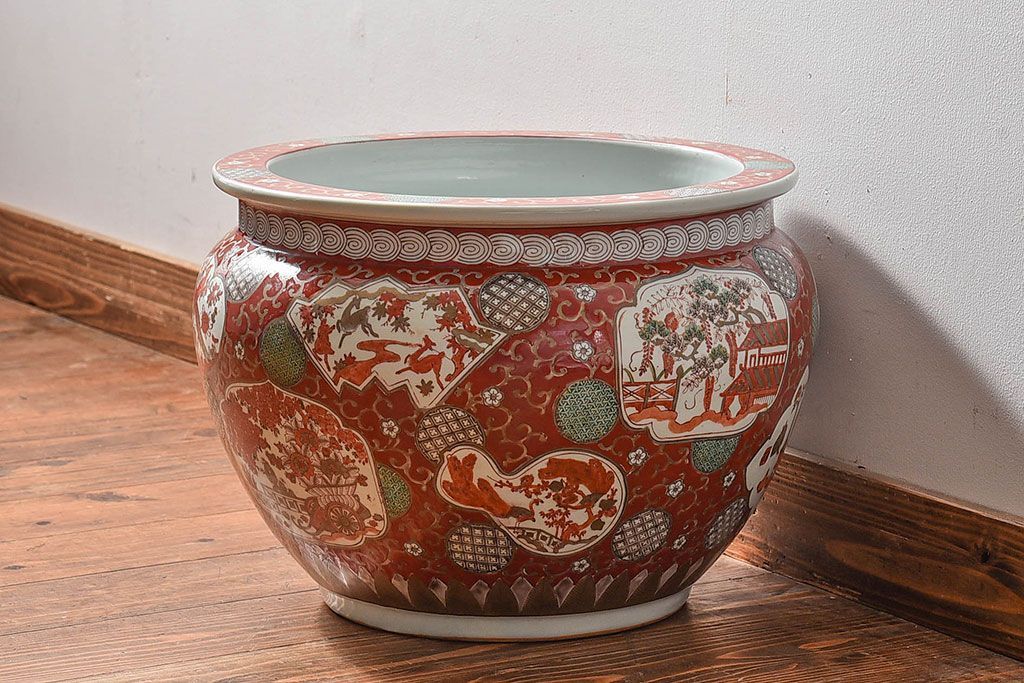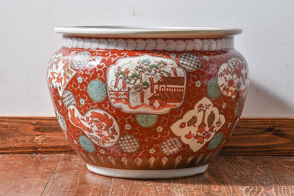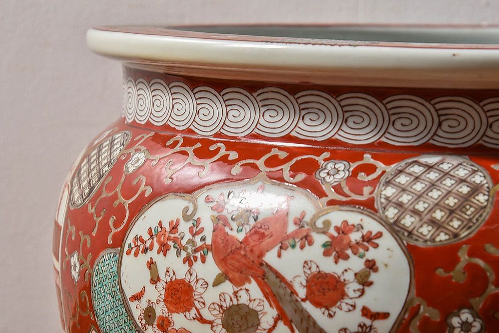 ラフジュ工房> 雑貨 > アンティーク雑貨 明治期 色絵 力強い色が存在感を放つ赤絵水鉢(窓絵火鉢、鉢カバー)