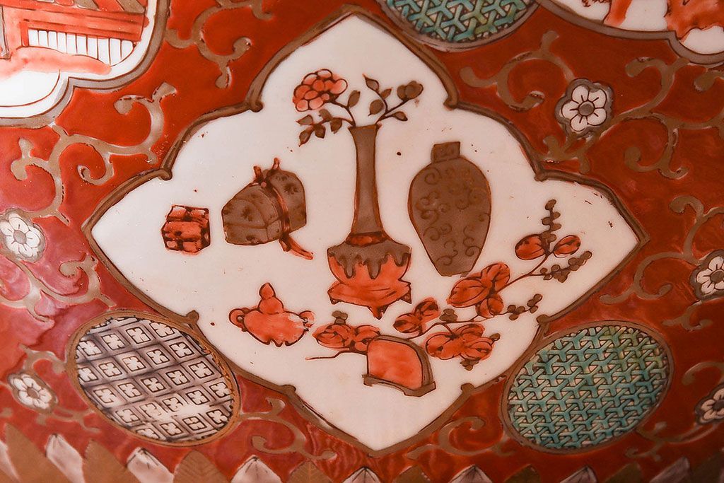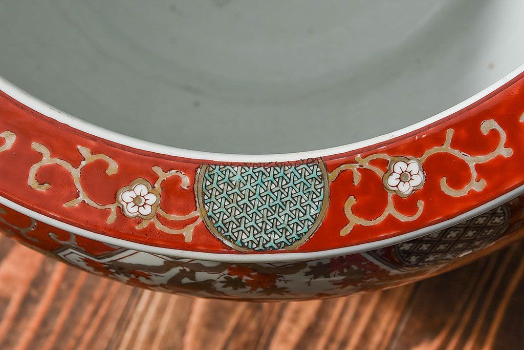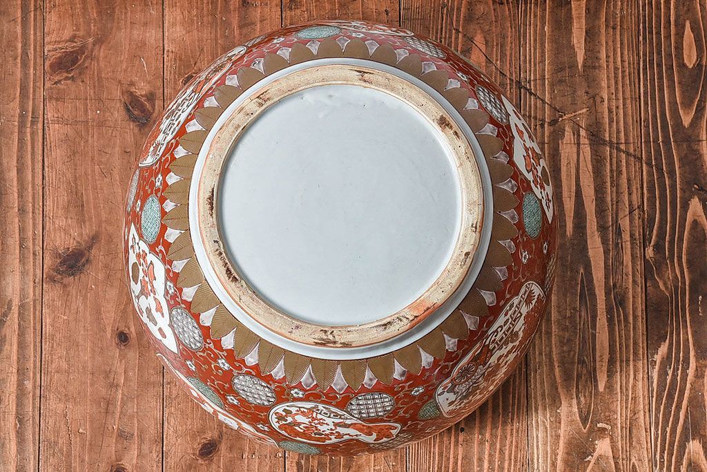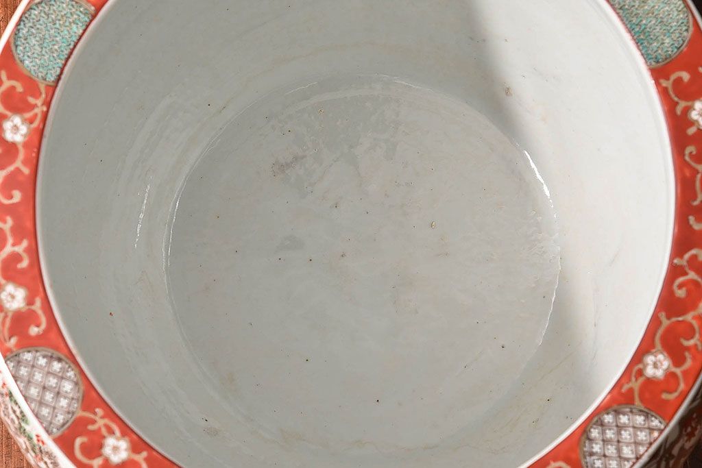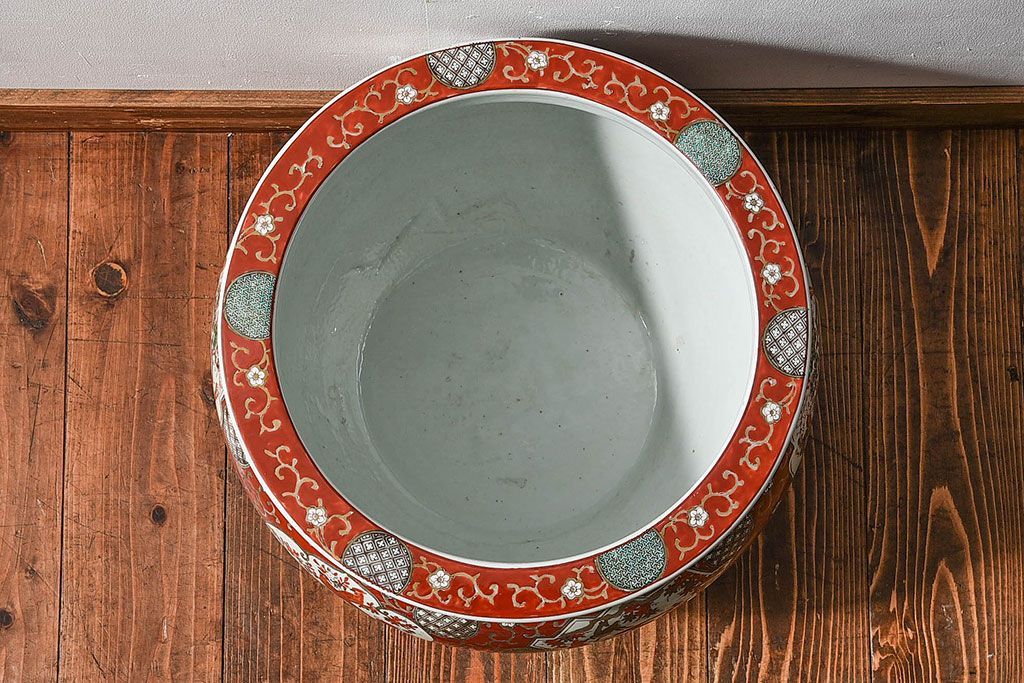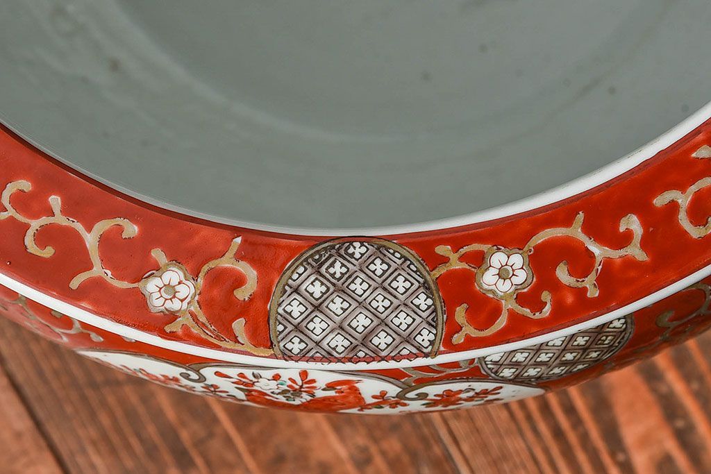 ラフジュ工房> 雑貨 > アンティーク雑貨 明治期 色絵 力強い色が存在感を放つ赤絵水鉢(窓絵火鉢、鉢カバー)
