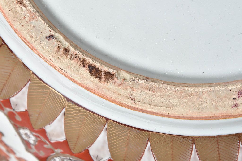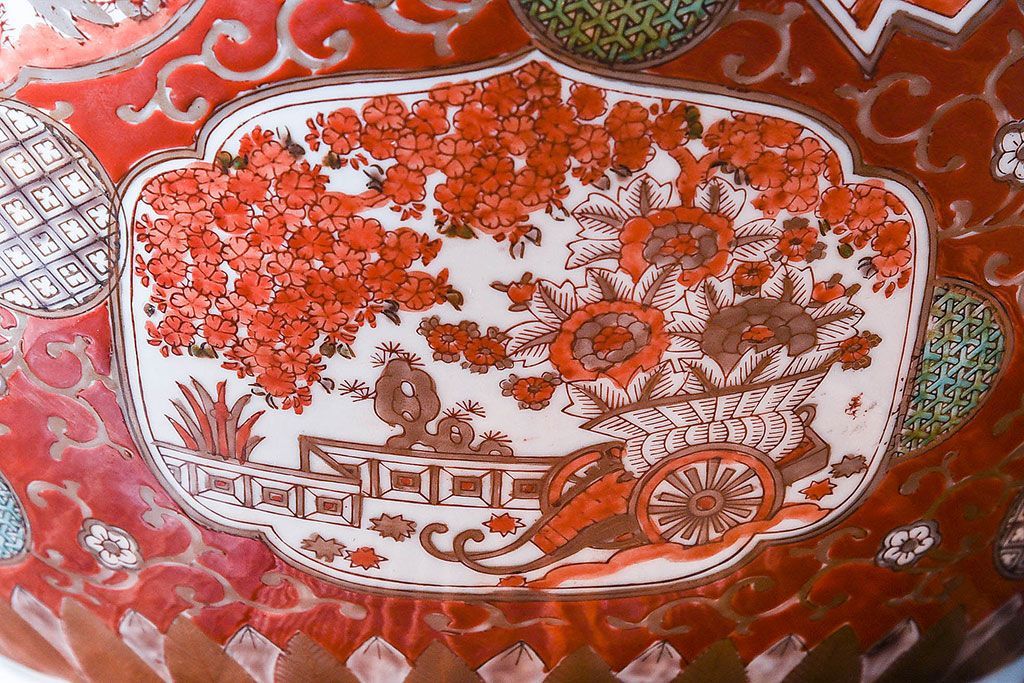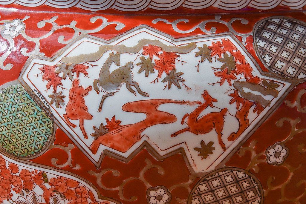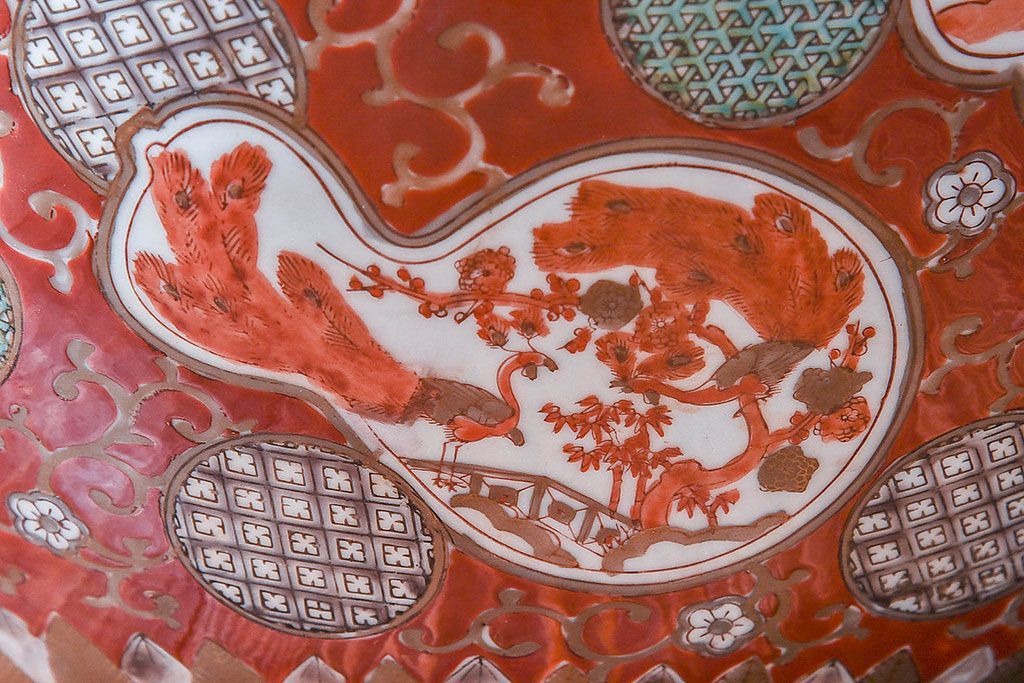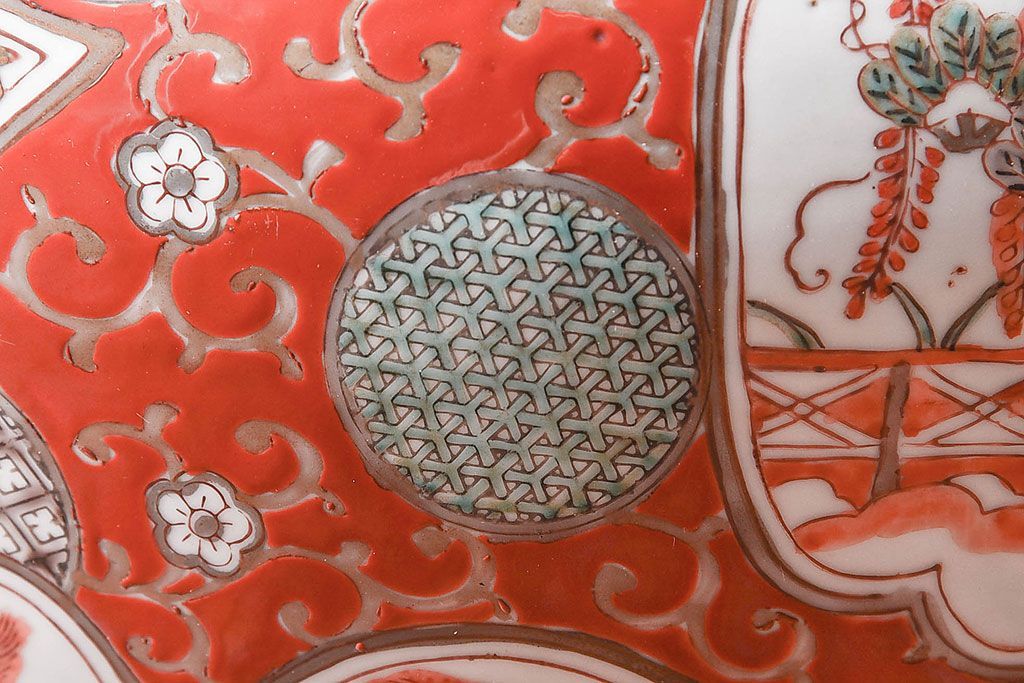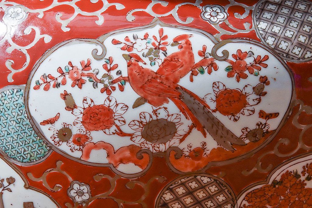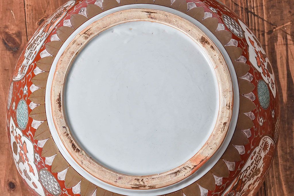 ラフジュ工房> 雑貨 > アンティーク雑貨 明治期 色絵 力強い色が存在感を放つ赤絵水鉢(窓絵火鉢、鉢カバー)
