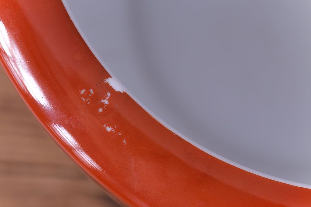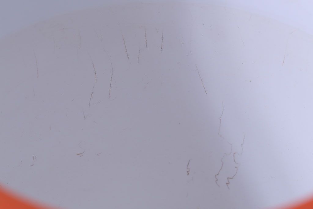 画像にありますように、内側に汚れのようなもの、縁や側面の塗装の剥がれなどありますが、ニュウ(ひび)、ホツ(欠け)等の大きなダメージはなく、高台もきれいな良好な状態です。