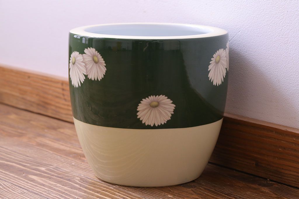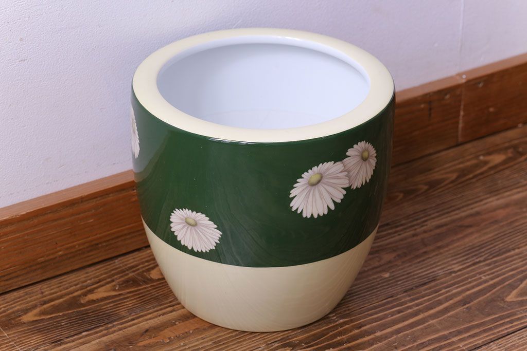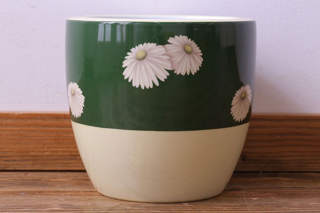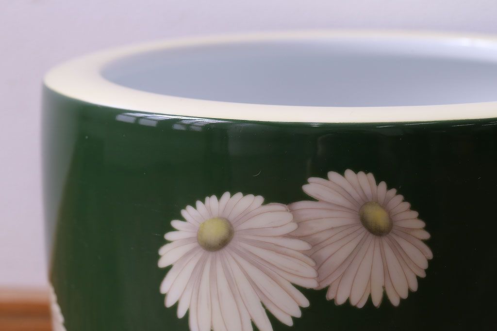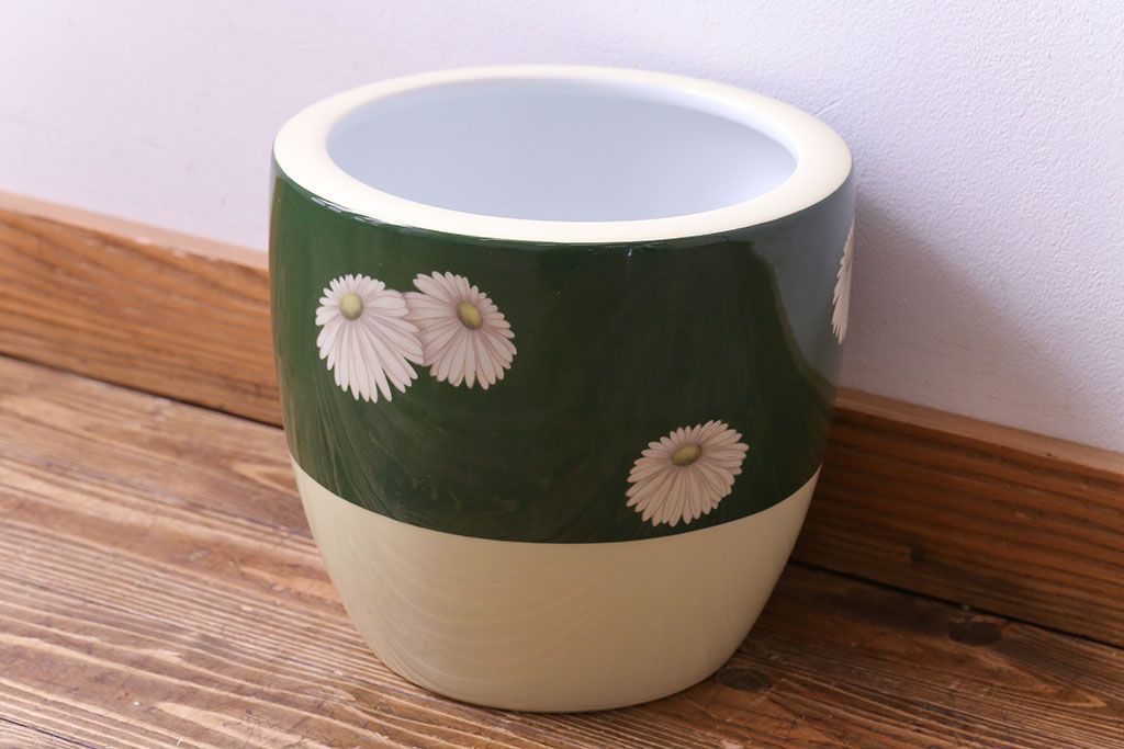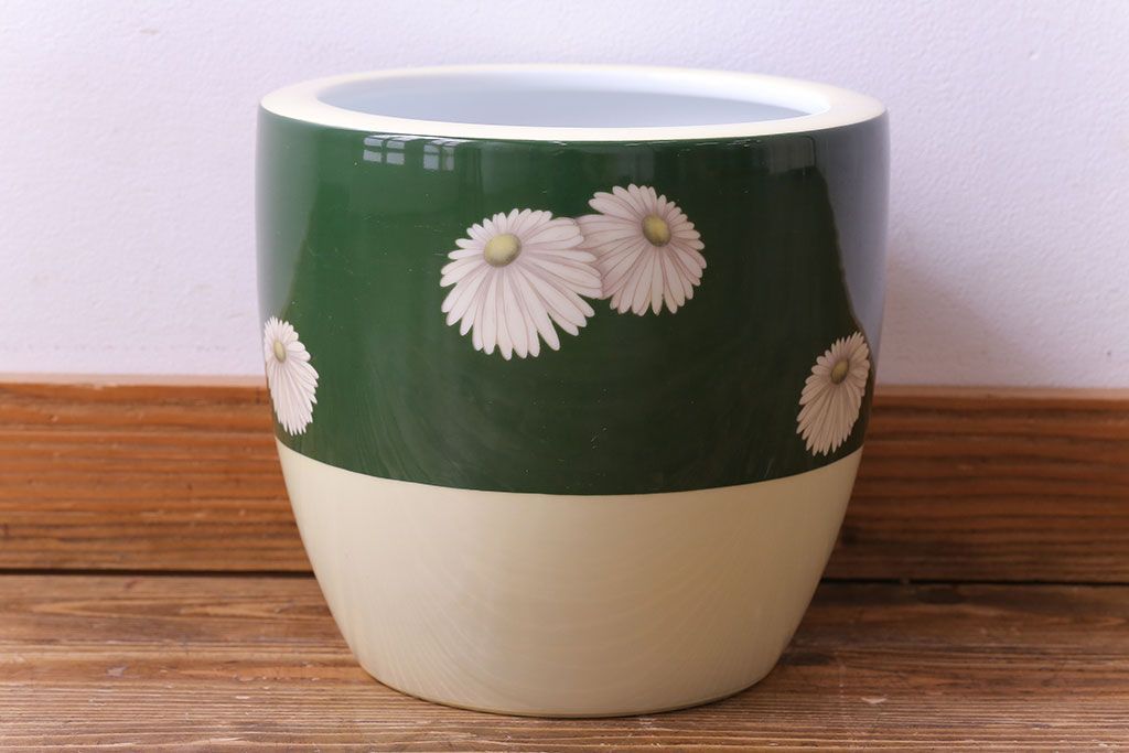 火鉢> 瀬戸火鉢 > アンティーク雑貨 オールドノリタケ(日陶) 緑地 白菊文様 バイカラーがおしゃれな壱型火鉢(手あぶり、鉢カバー)