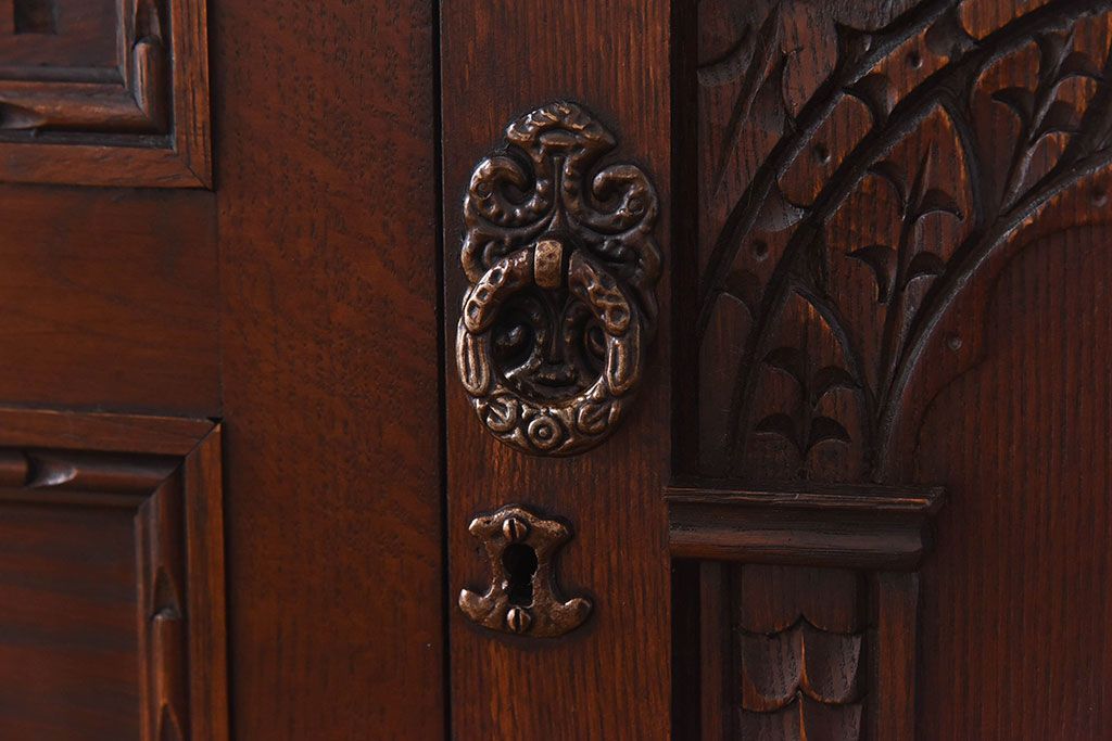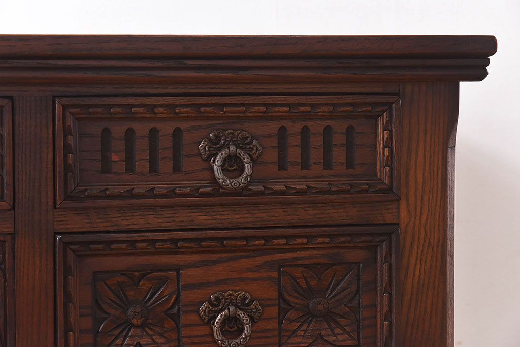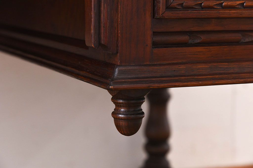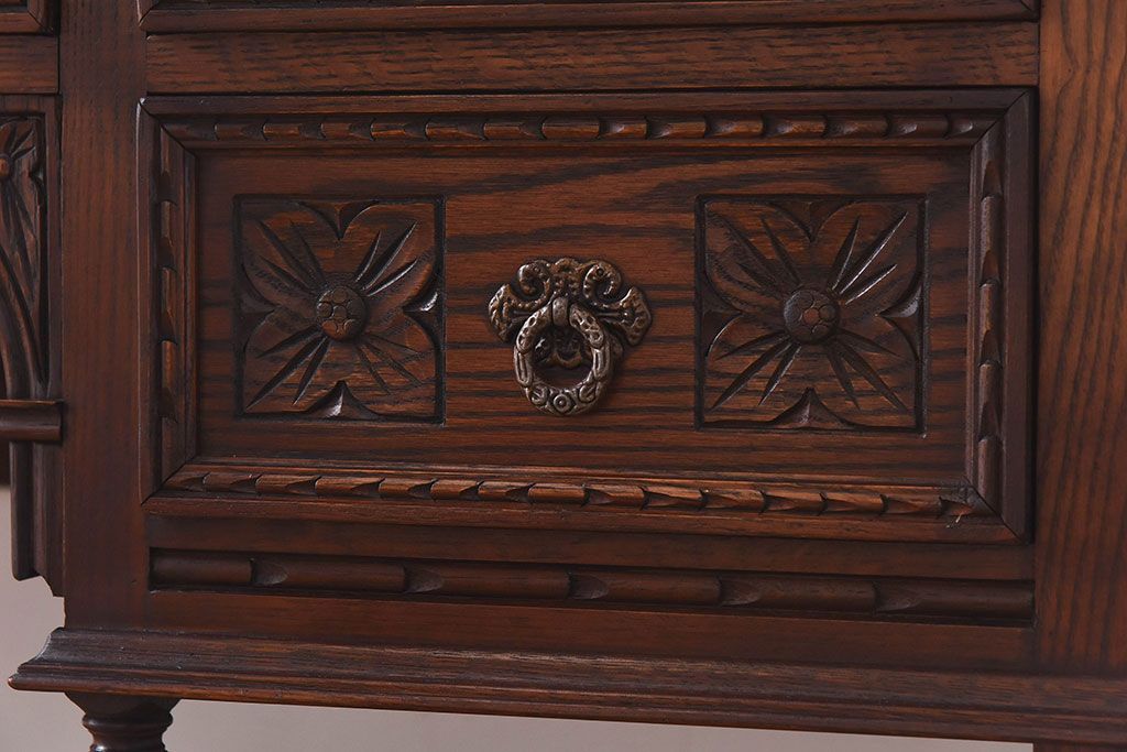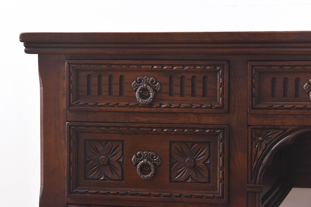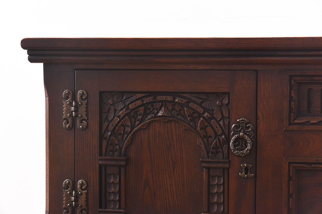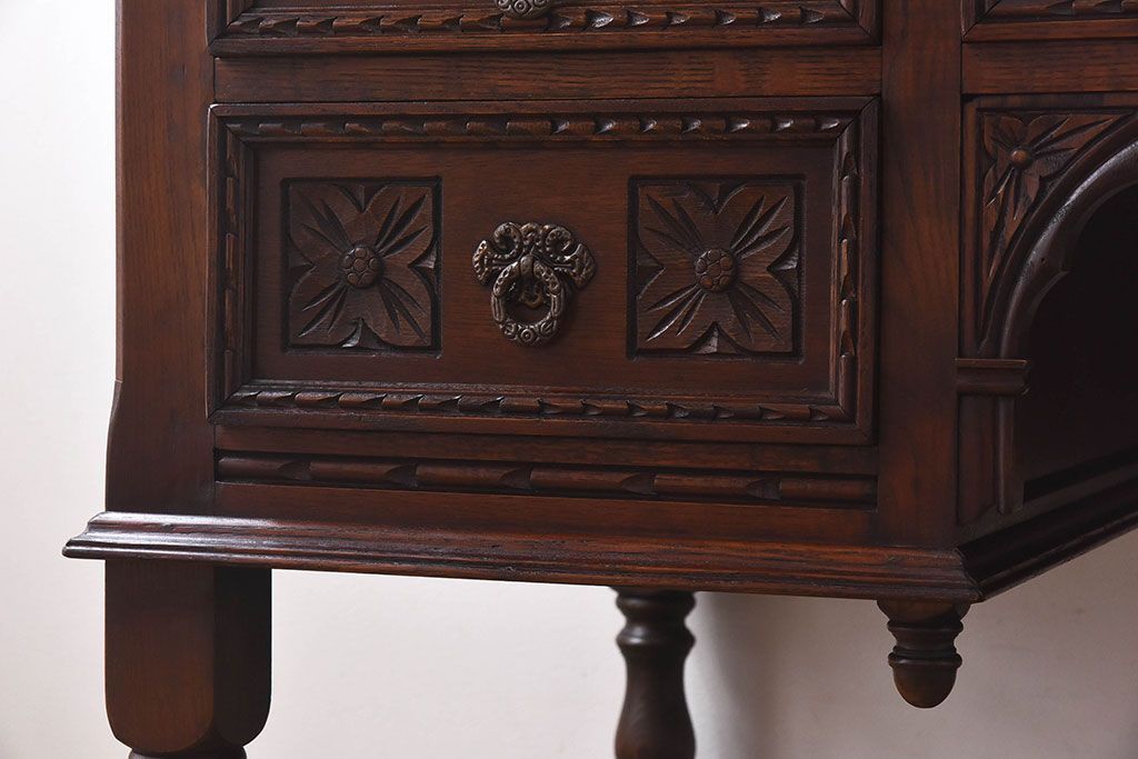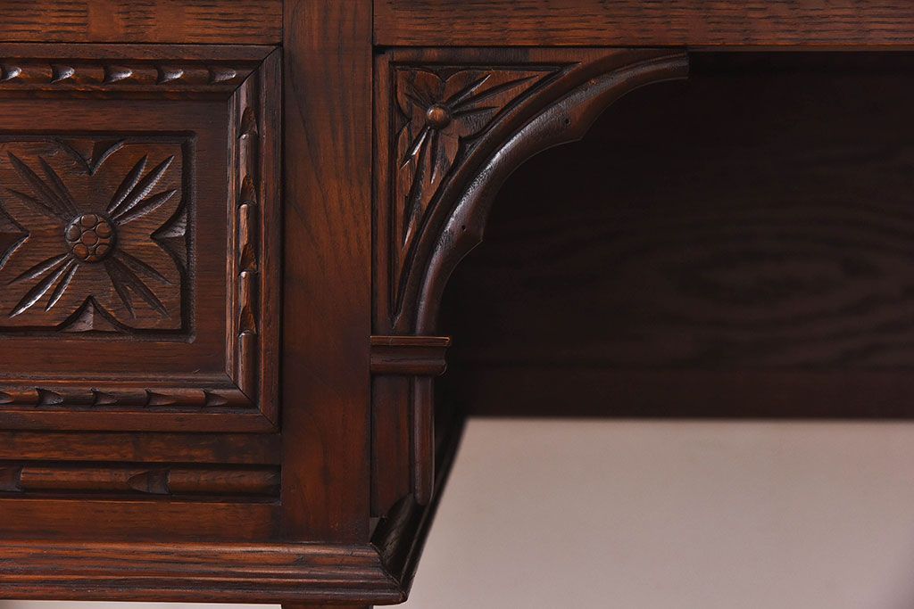アンティークかと思わせるようなクオリティの高い手彫りの彫刻は、