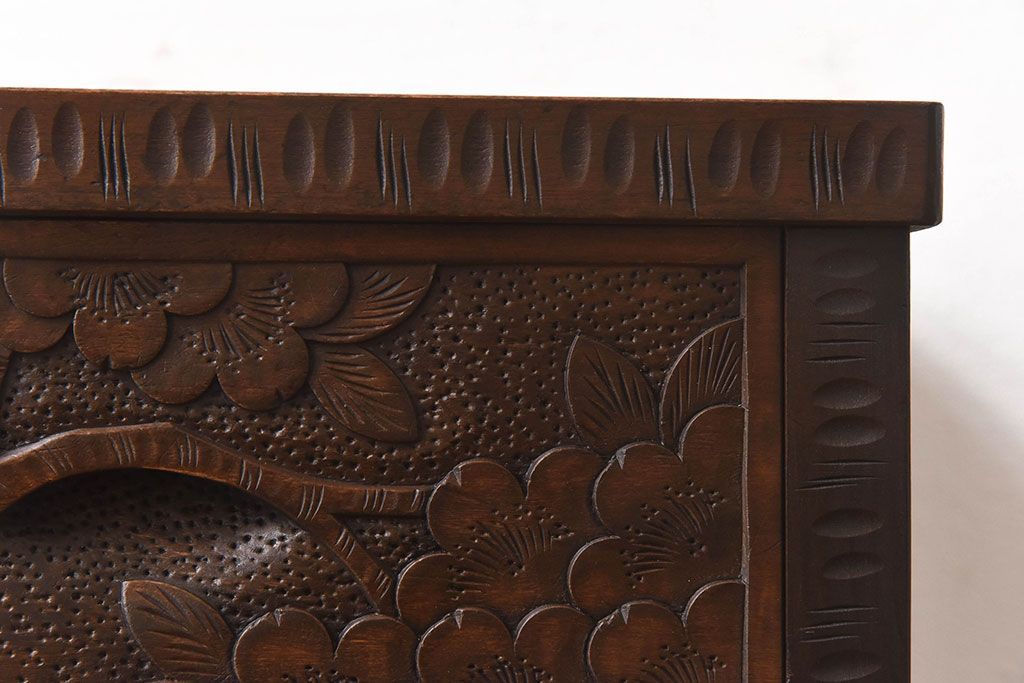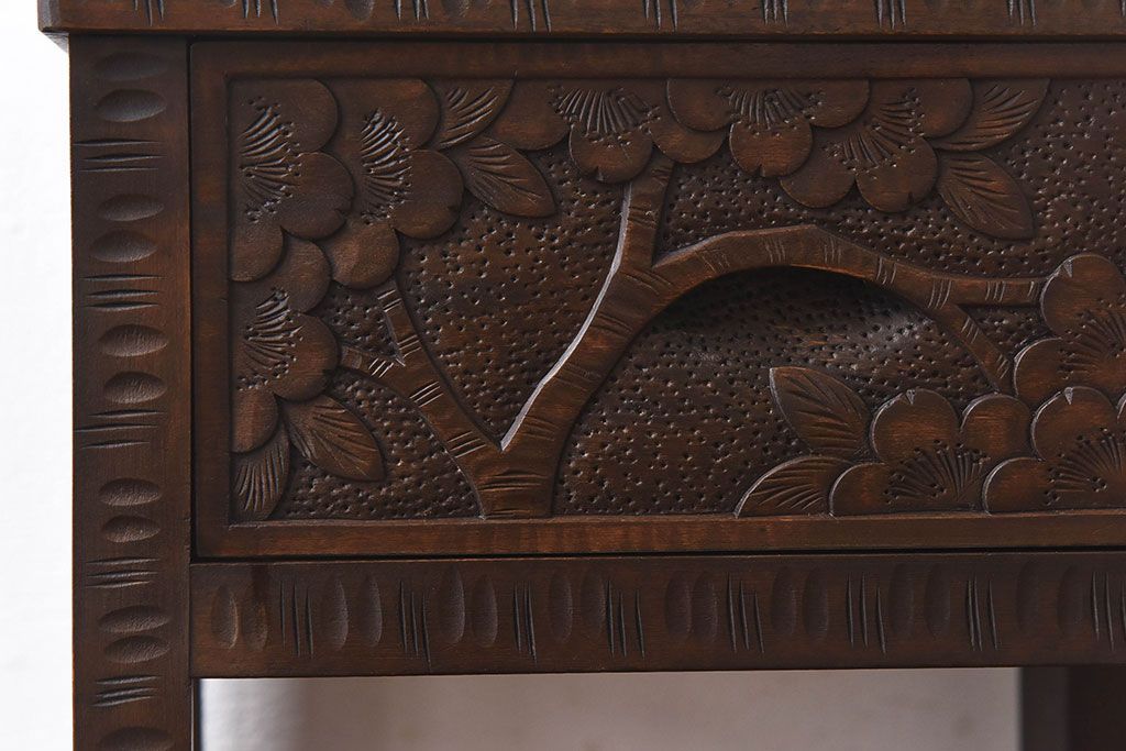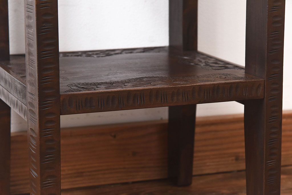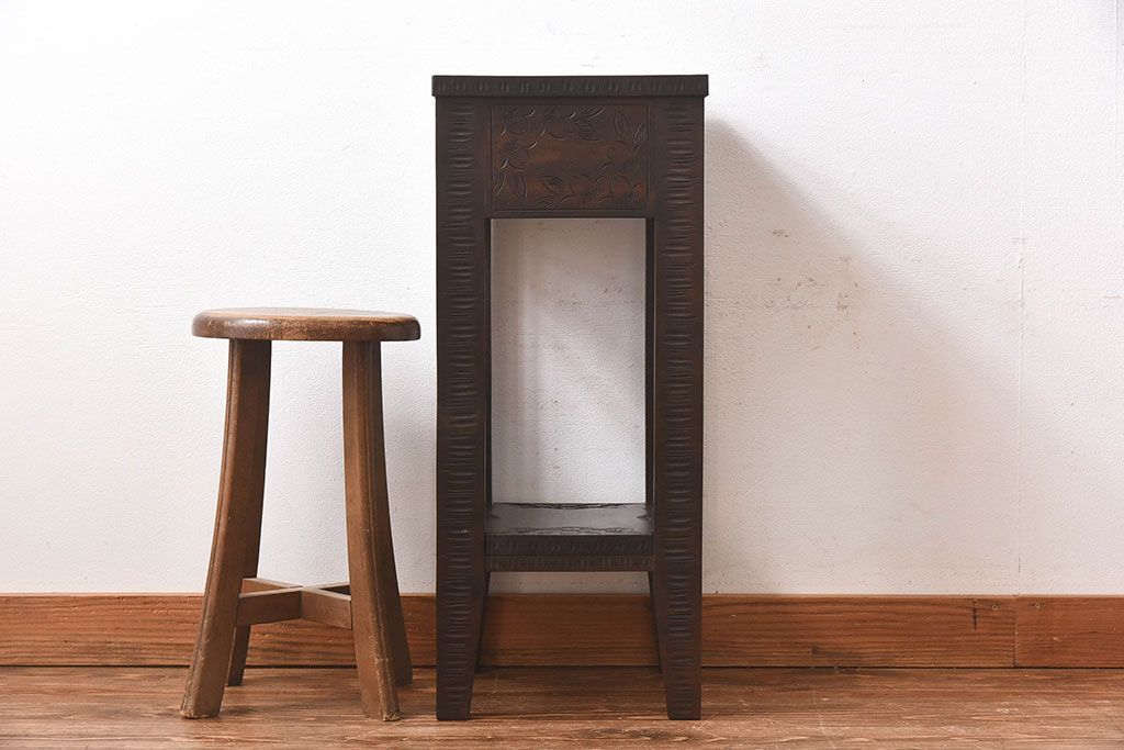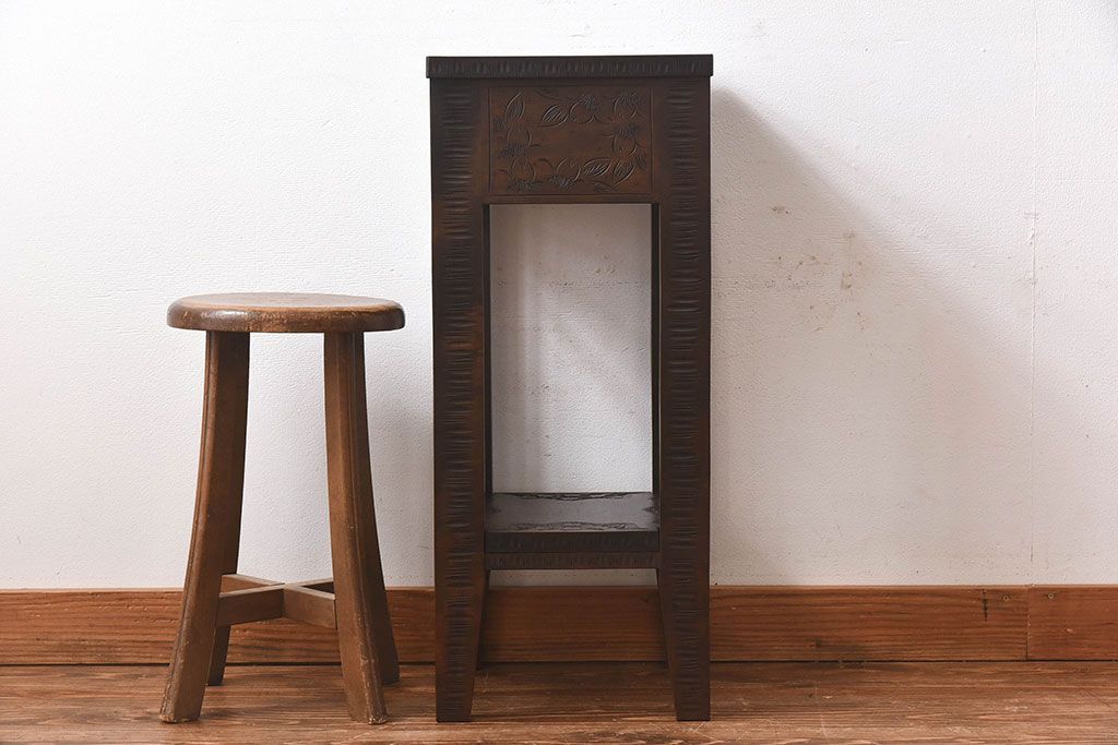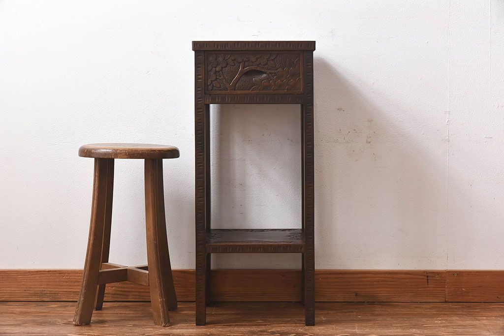 民芸家具 > アンティーク雑貨 中古 伝統工芸 軽井沢彫り 意匠を凝らした美しい花台(サイドテーブル、飾り台、引き出し)