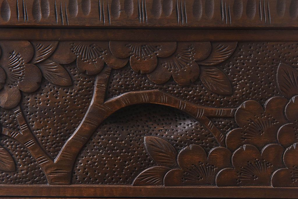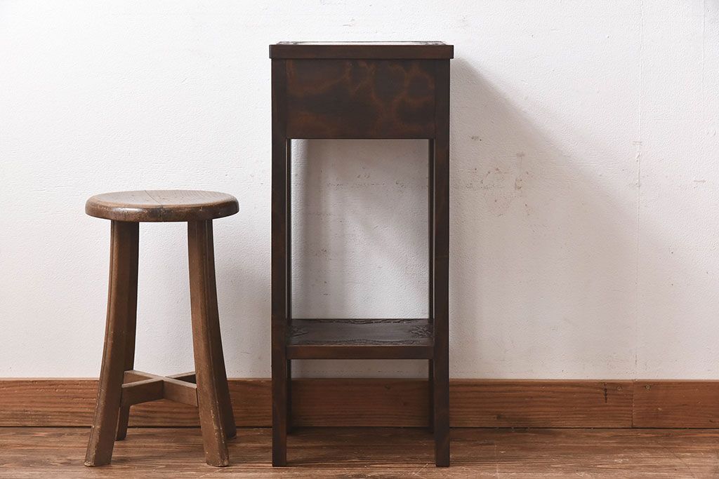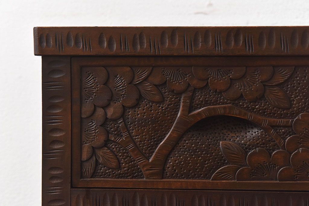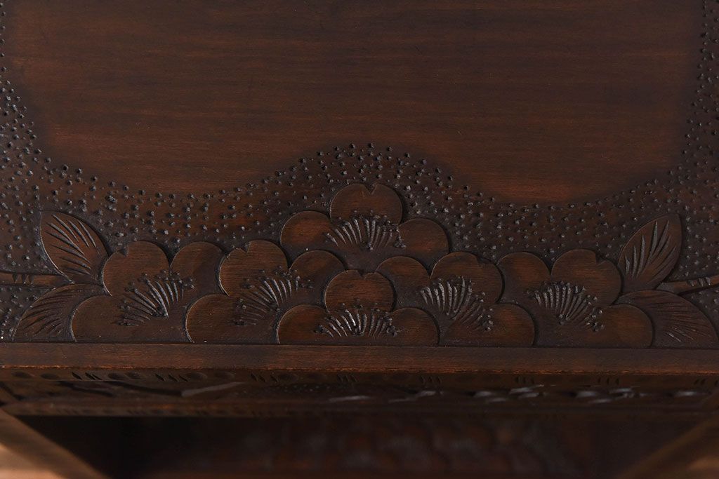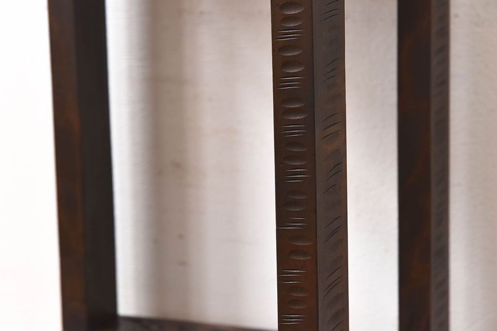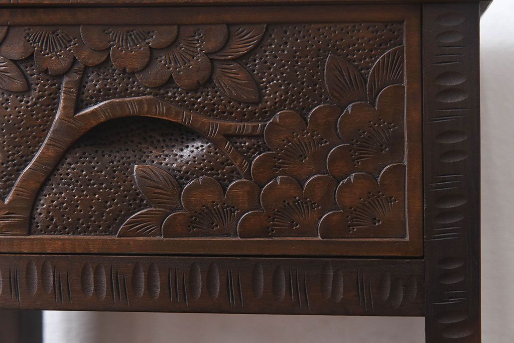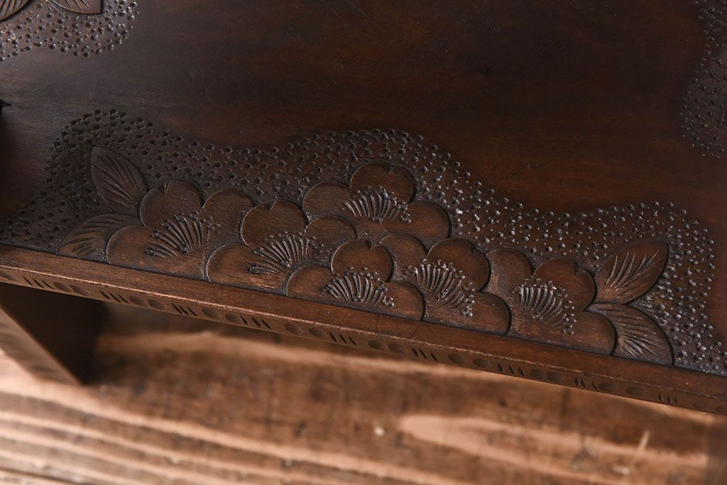 民芸家具 > アンティーク雑貨 中古 伝統工芸 軽井沢彫り 意匠を凝らした美しい花台(サイドテーブル、飾り台、引き出し)