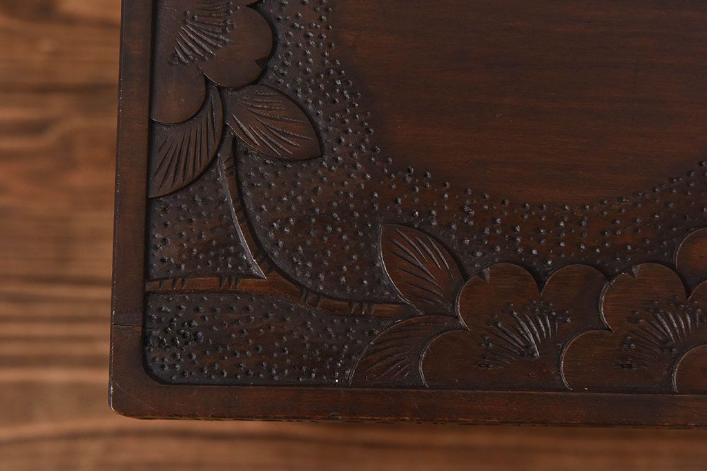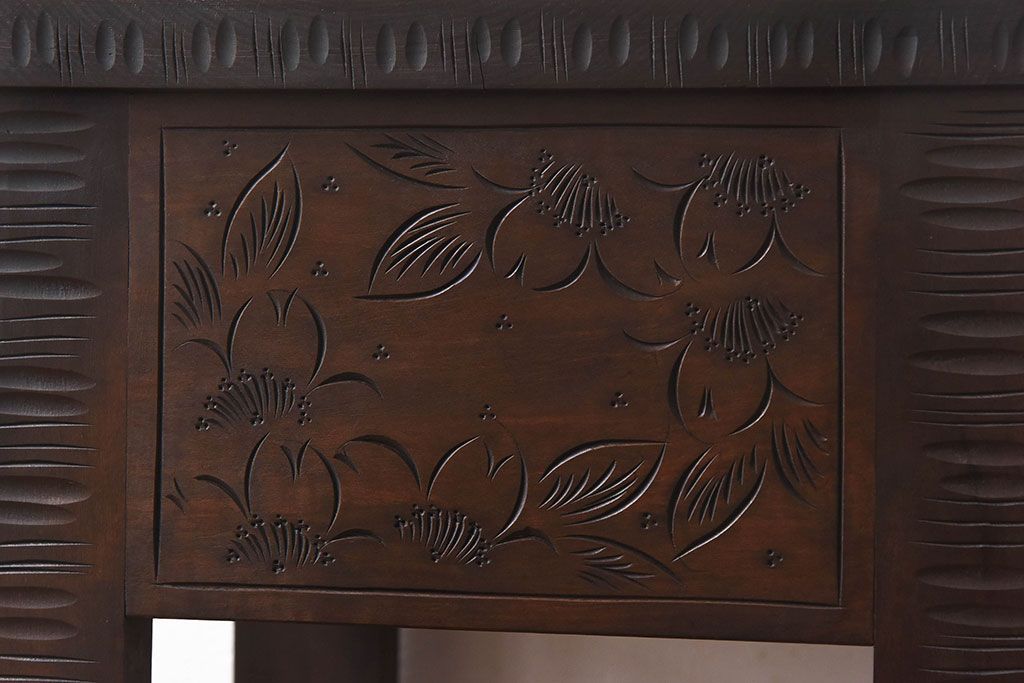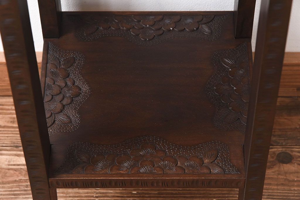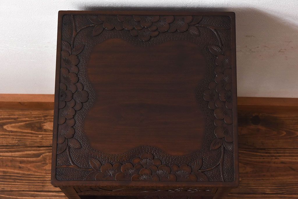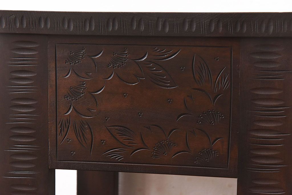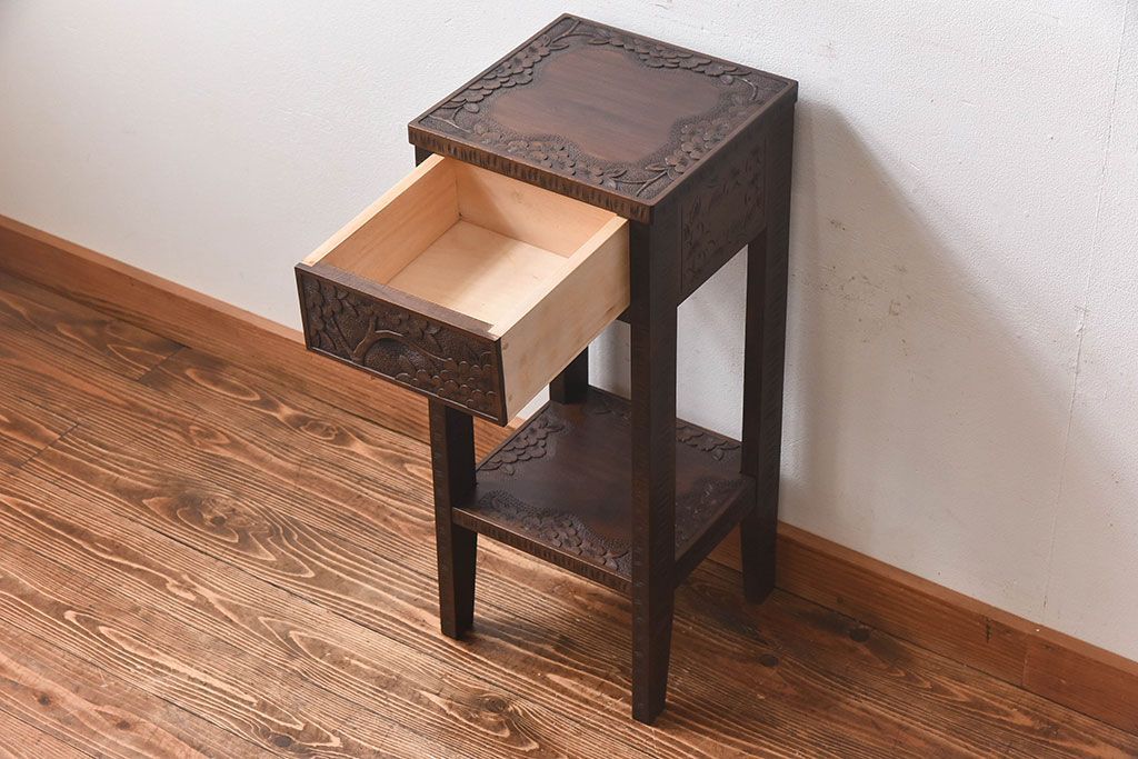 テーブル> サイドテーブル > アンティーク雑貨 中古 伝統工芸 軽井沢彫り 意匠を凝らした美しい花台(サイドテーブル、飾り台、引き出し)