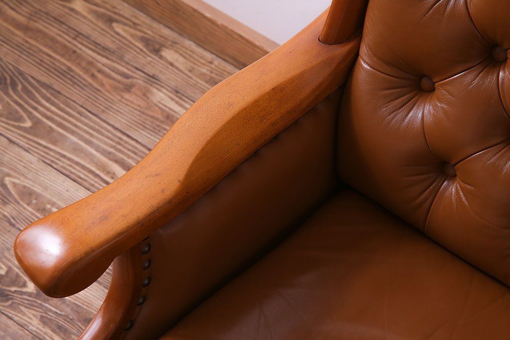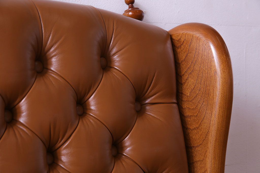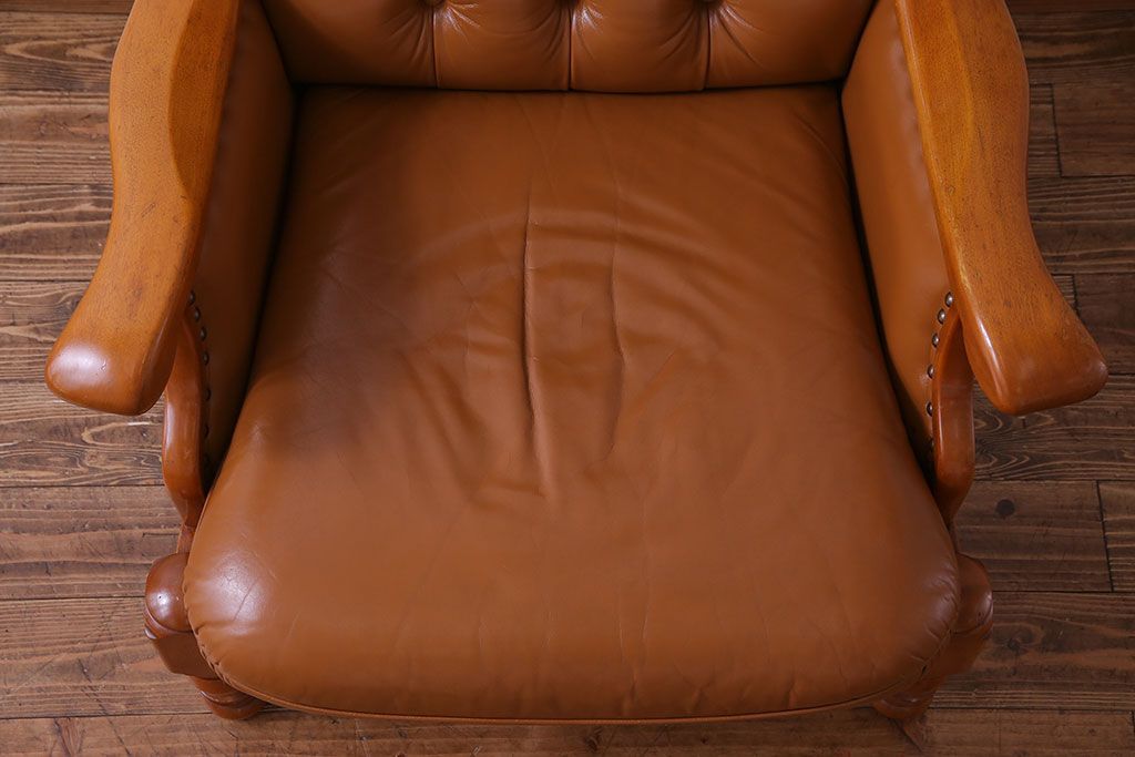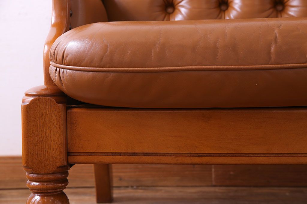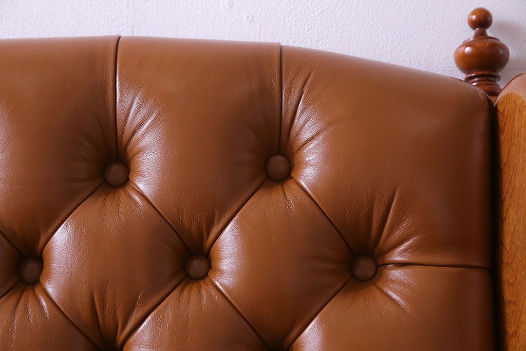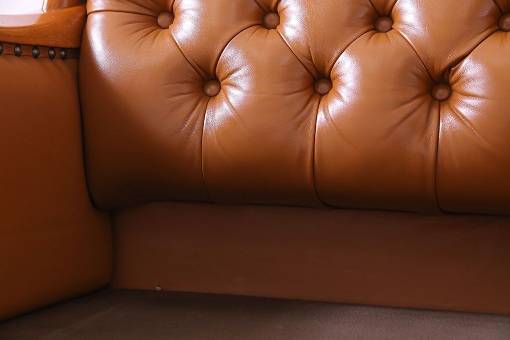 光沢感のあるキャメル色のレザーに、規則正しく並んだボタン飾りがアクセントを加えています。イギリスアンティークを思わせる洗練されたデザインが素敵ですね。