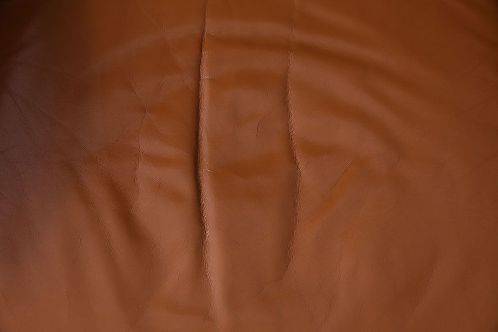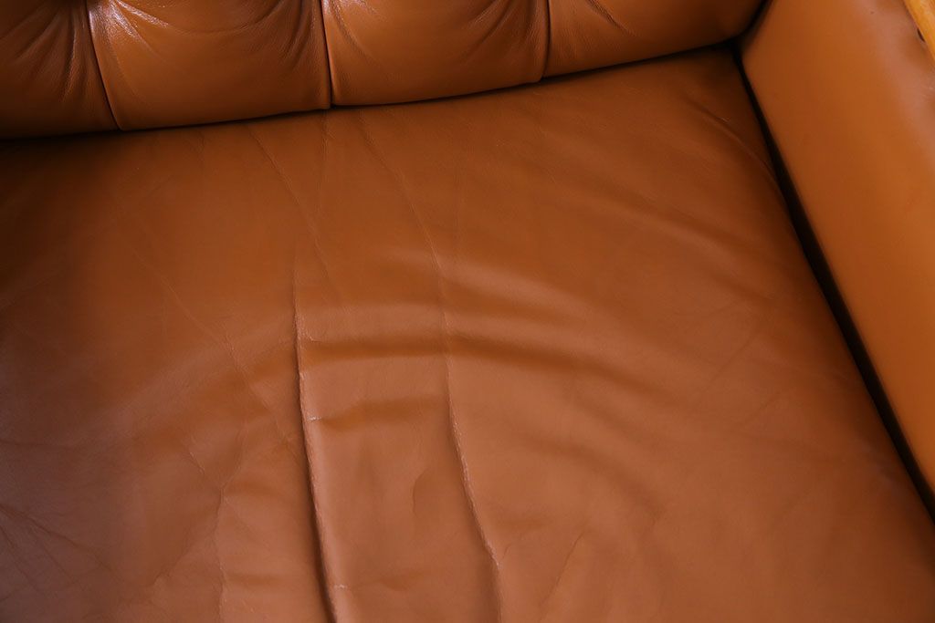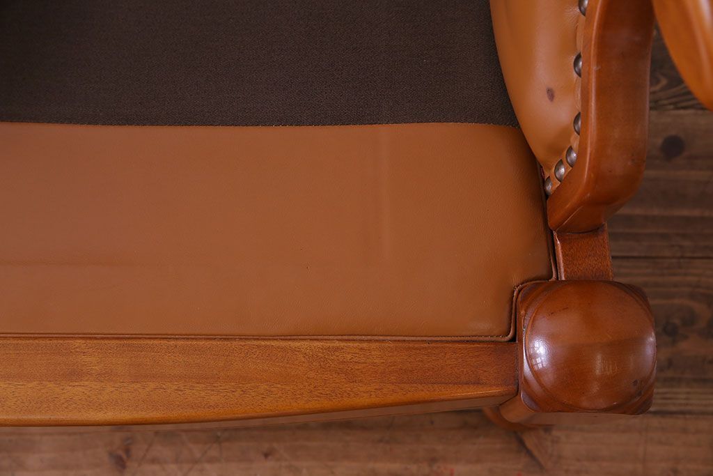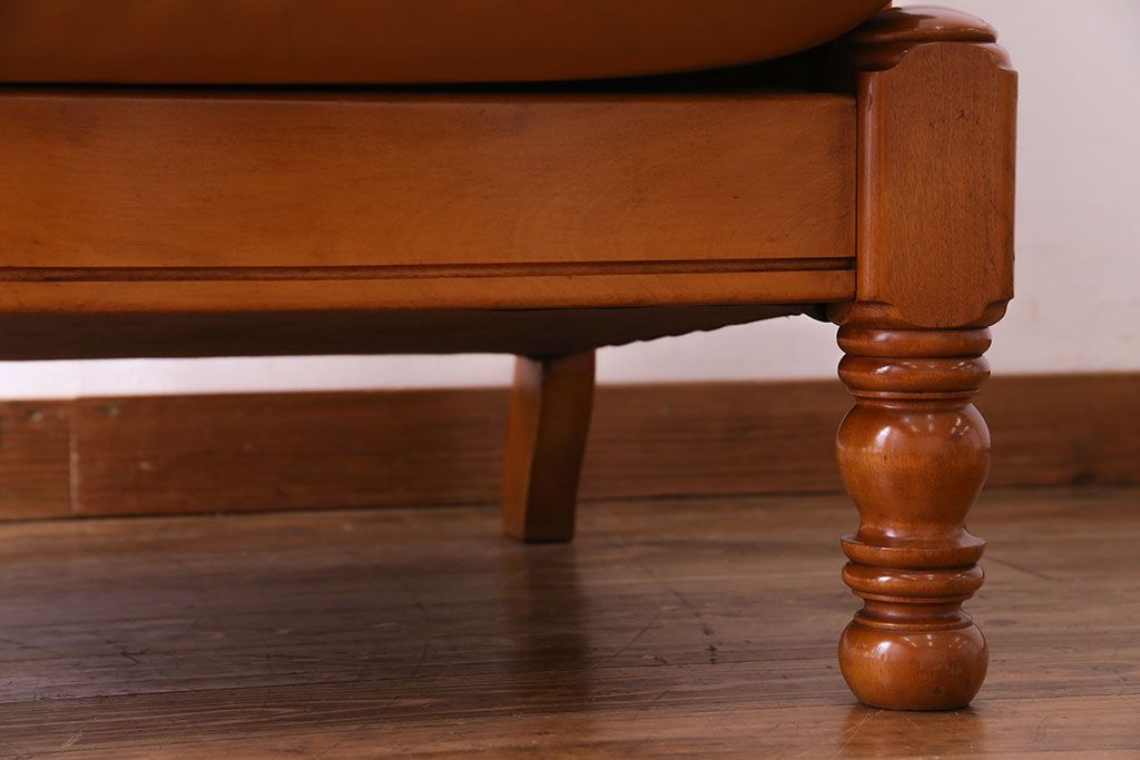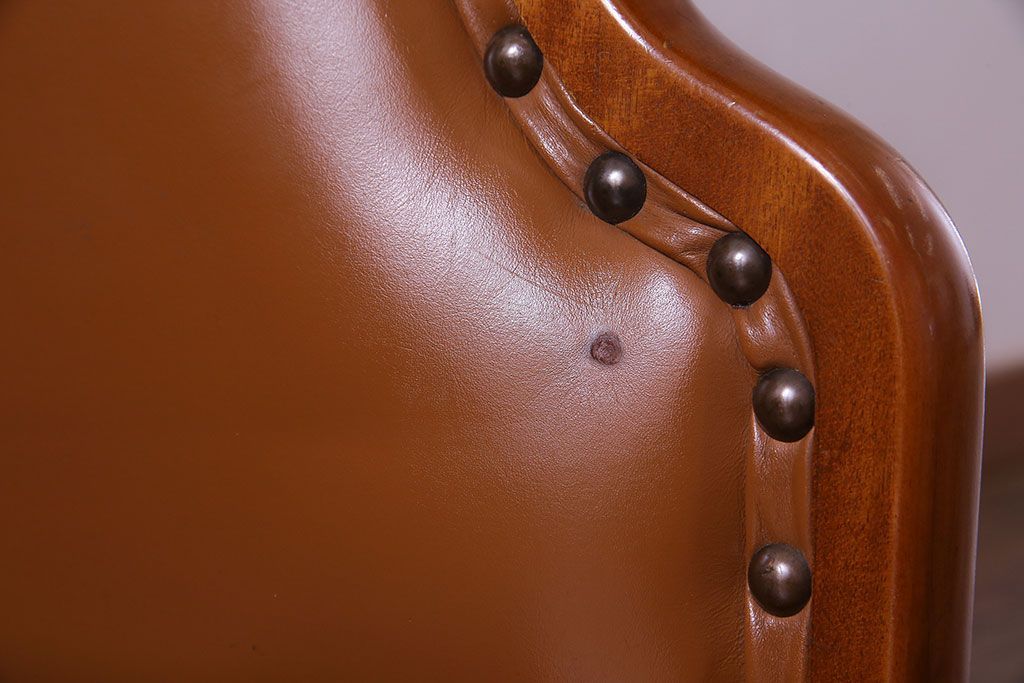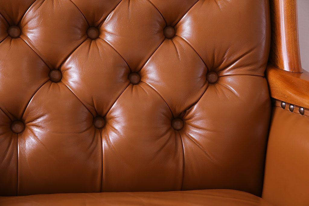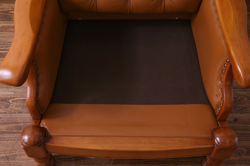 光沢感のあるキャメル色のレザーに、規則正しく並んだボタン飾りがアクセントを加えています。イギリスアンティークを思わせる洗練されたデザインが素敵ですね。