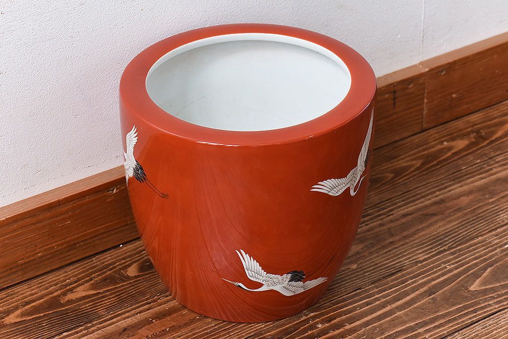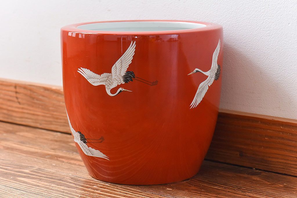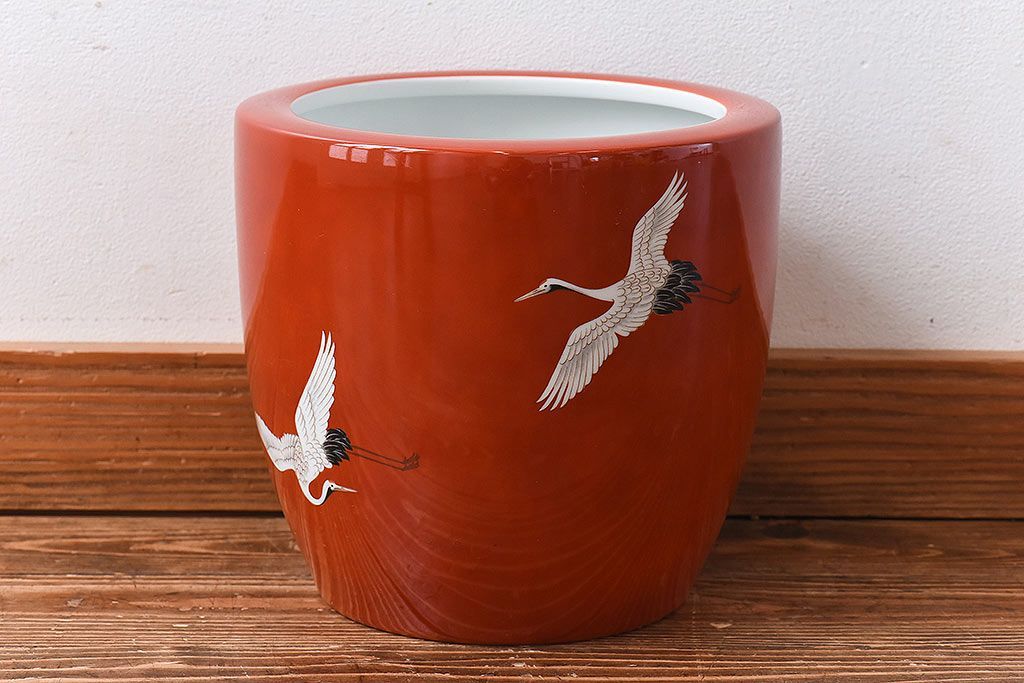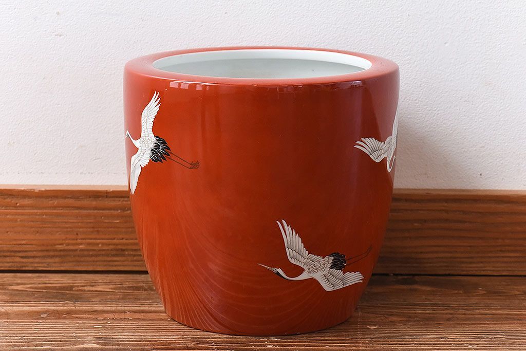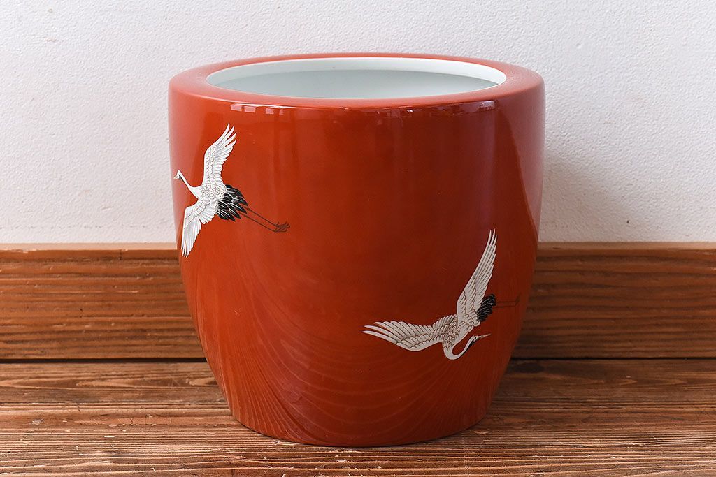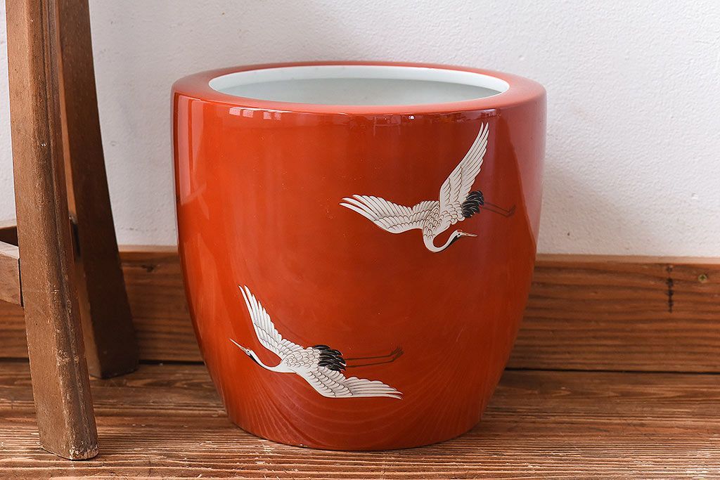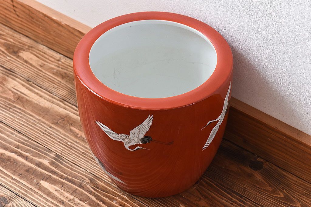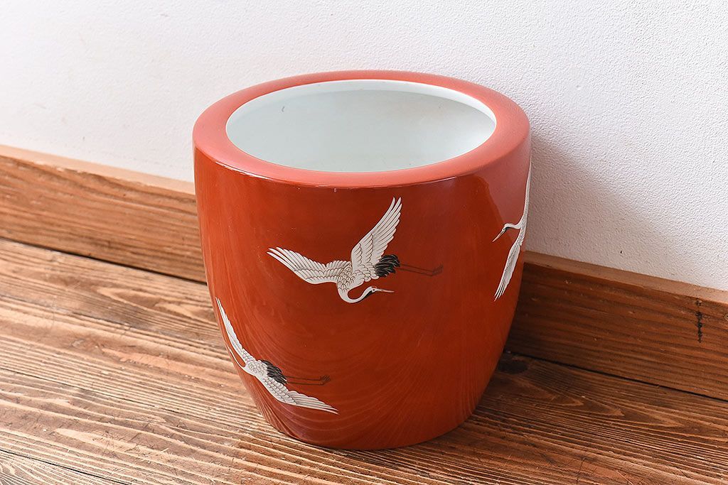 火鉢> 瀬戸火鉢 > アンティーク雑貨 ノリタケ・則武(日陶) 鶴の図 朱色が目を引く小振りの火鉢(手あぶり、鉢カバー)