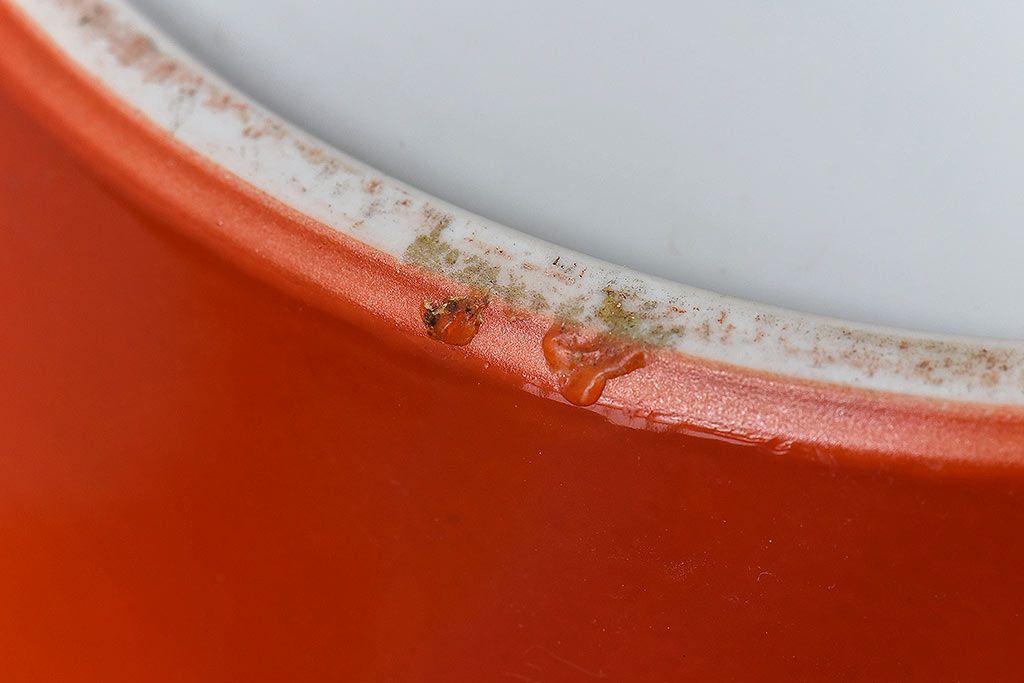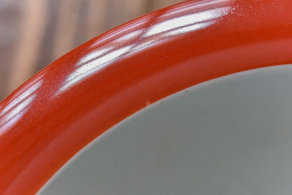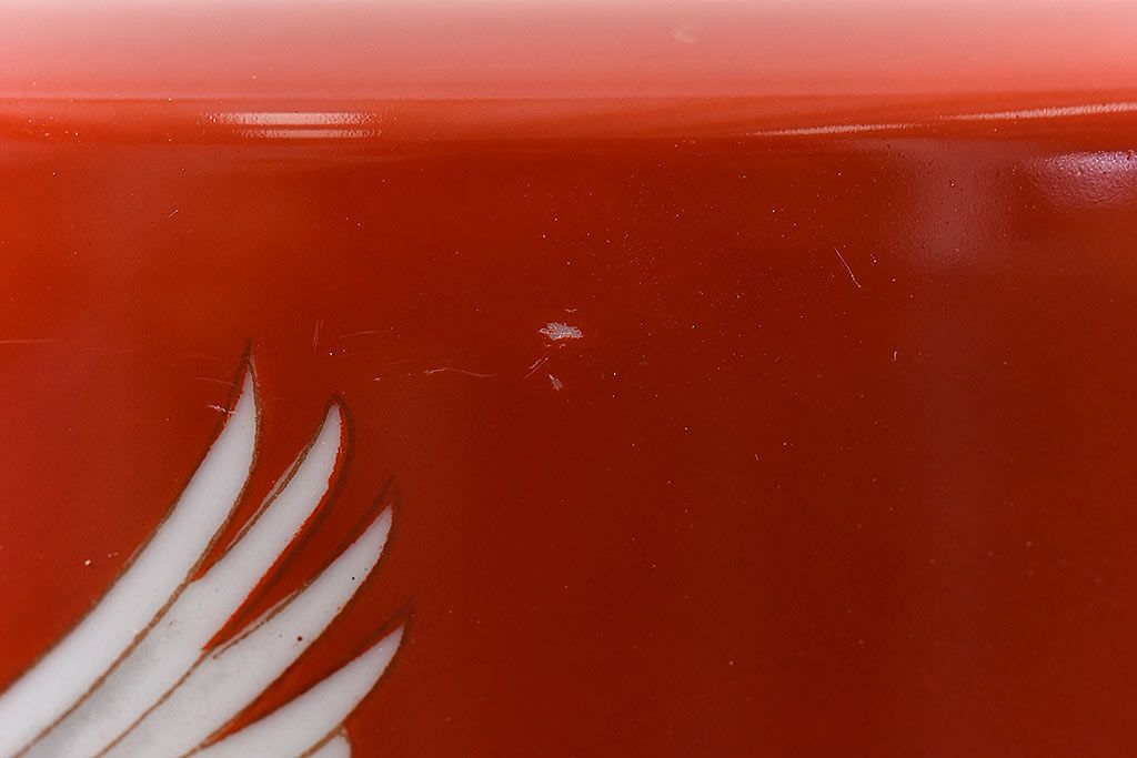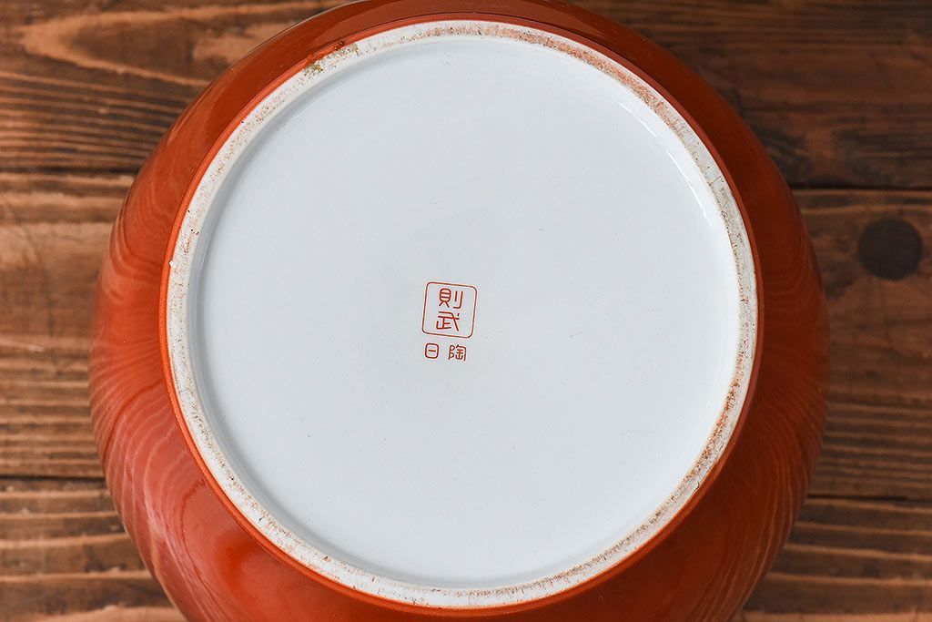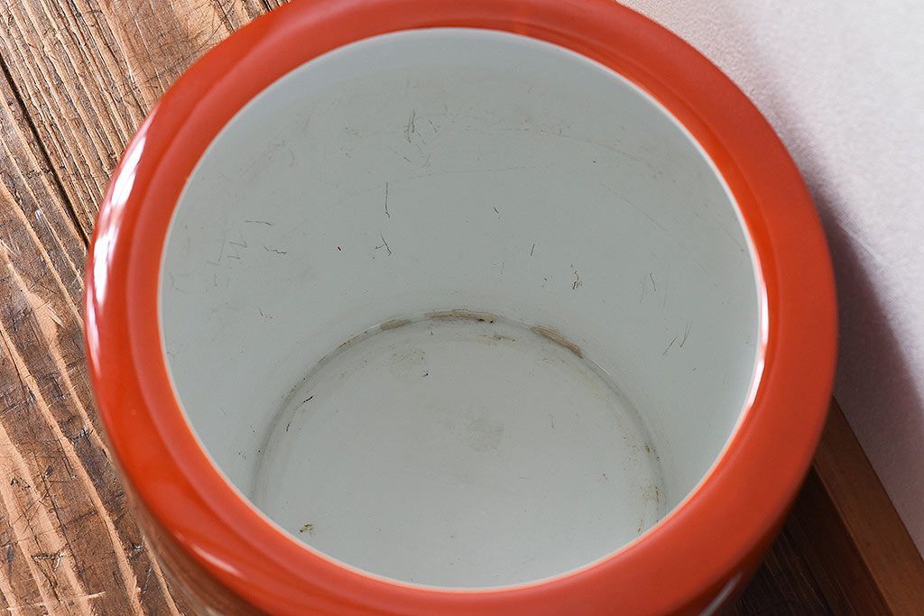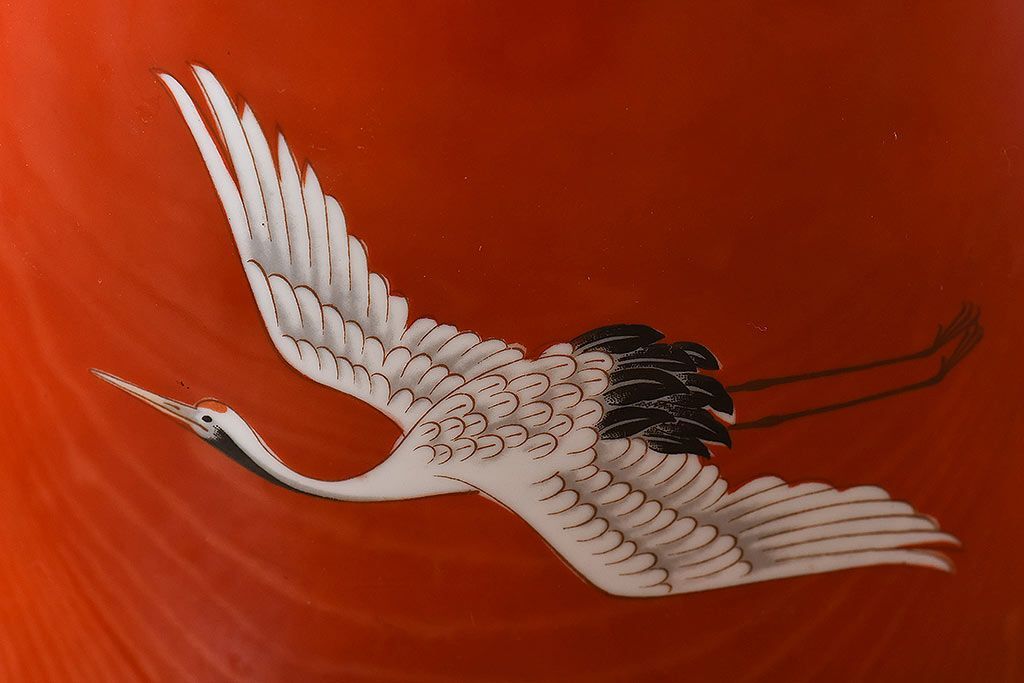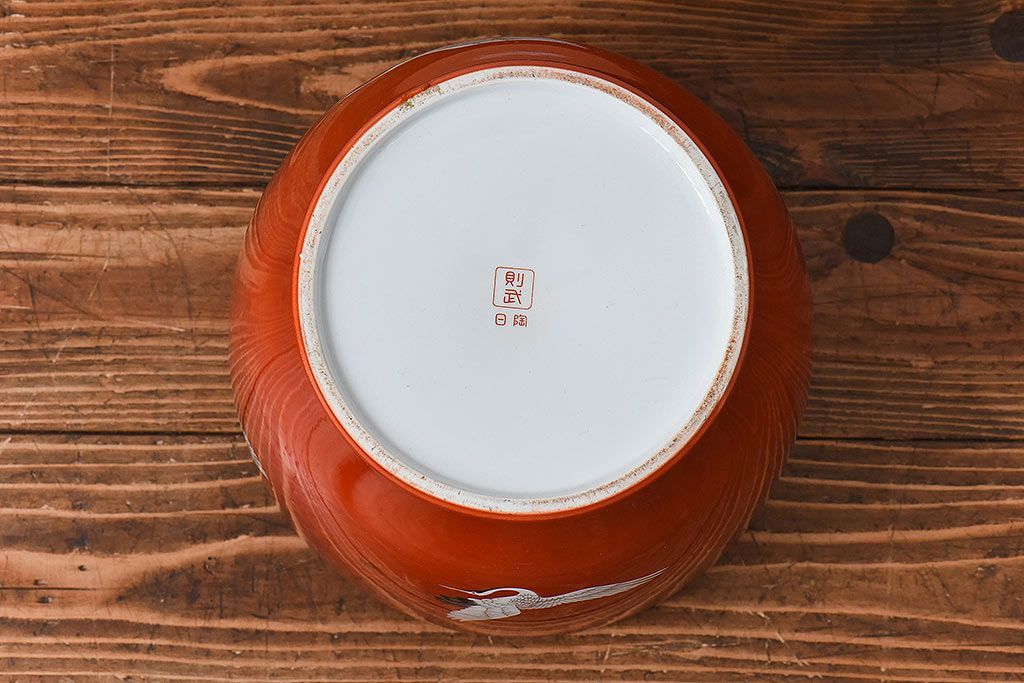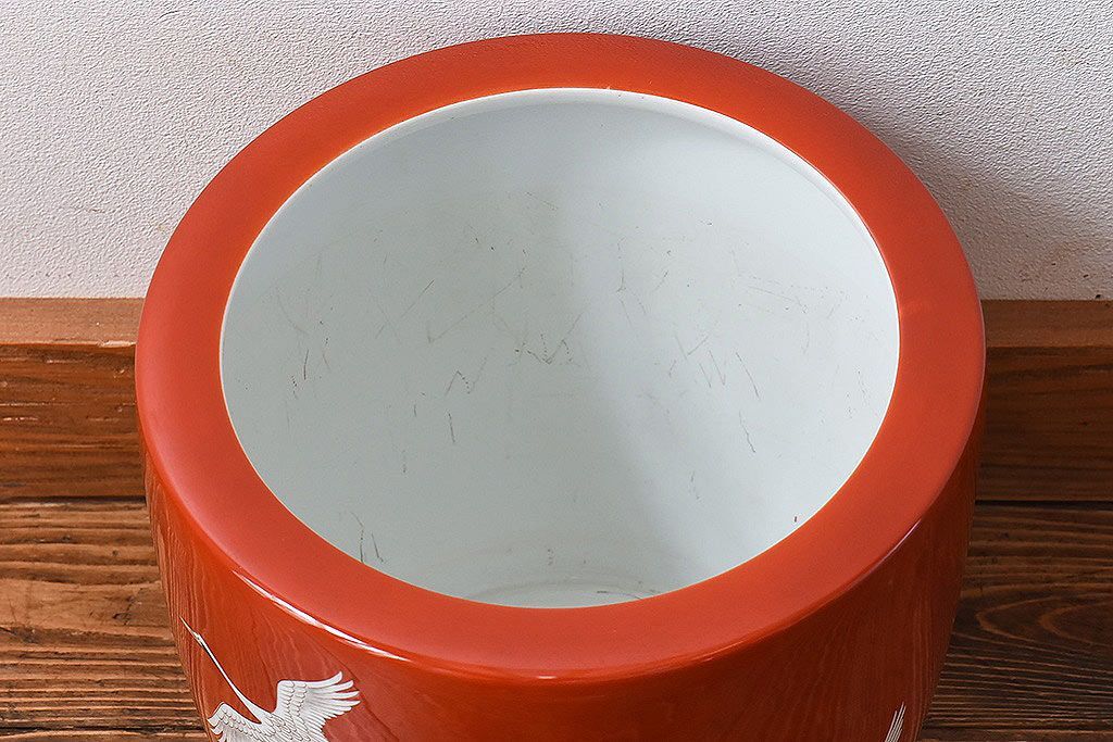 火鉢> 瀬戸火鉢 > アンティーク雑貨 ノリタケ・則武(日陶) 鶴の図 朱色が目を引く小振りの火鉢(手あぶり、鉢カバー)
