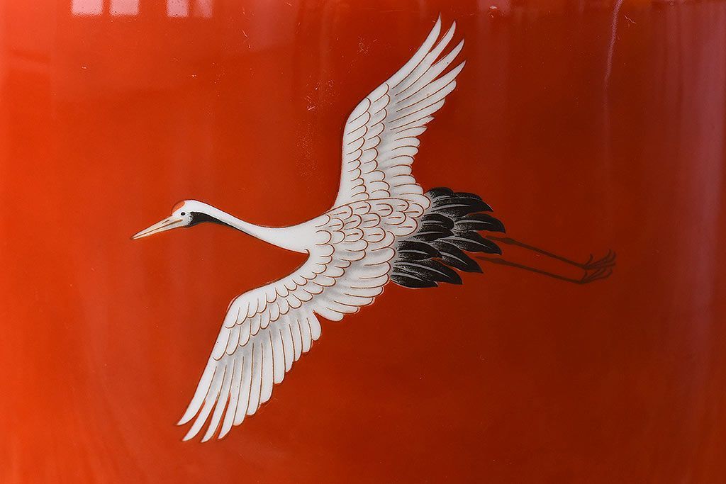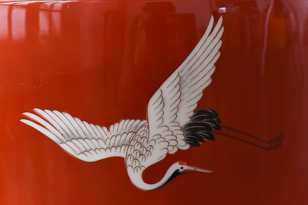 ノリタケ・則武(日陶) 鶴の図 朱色が目を引く小振りの火鉢(手あぶり、鉢カバー)です。