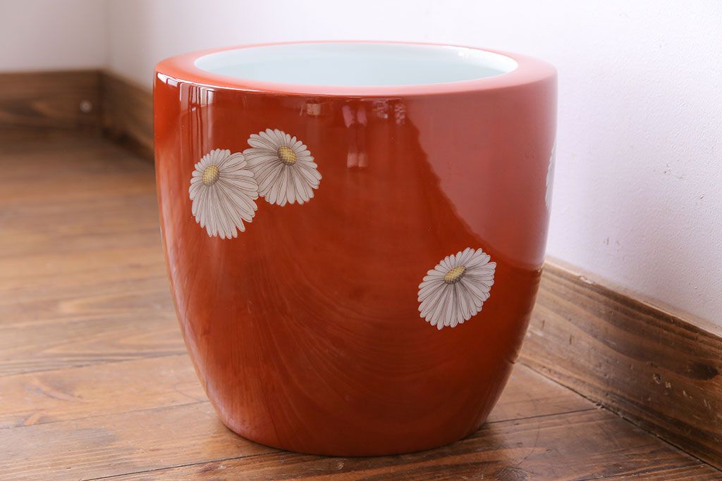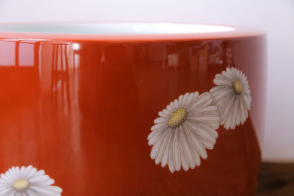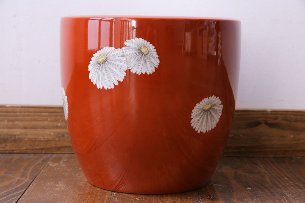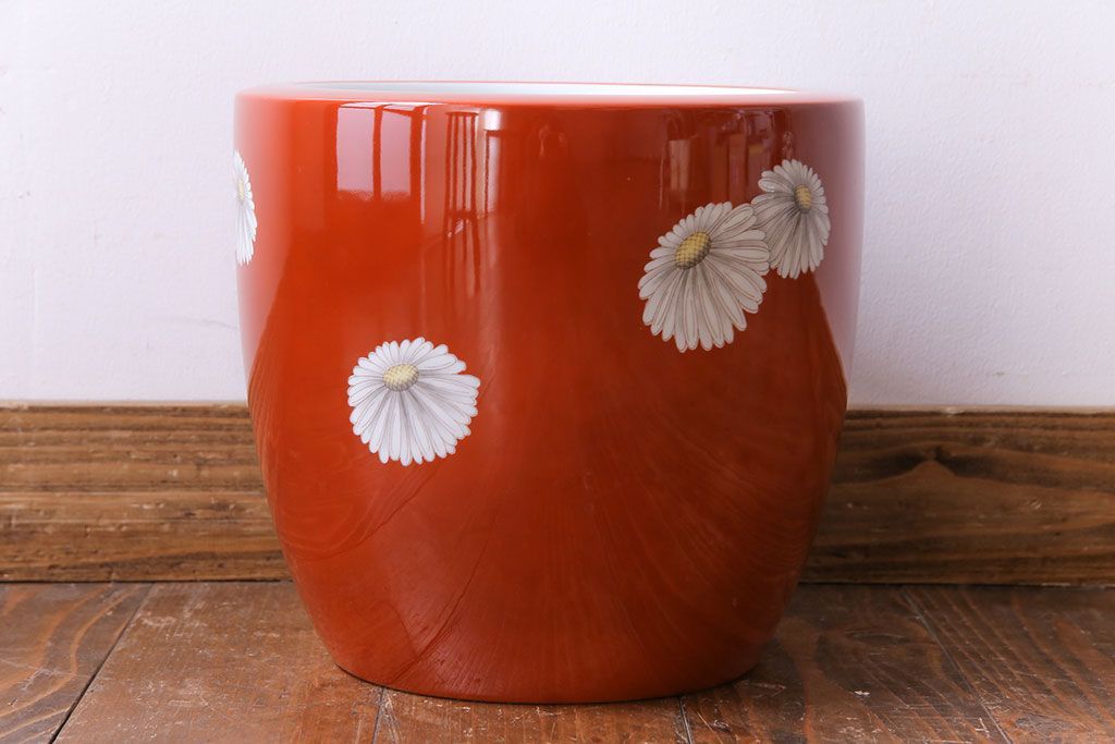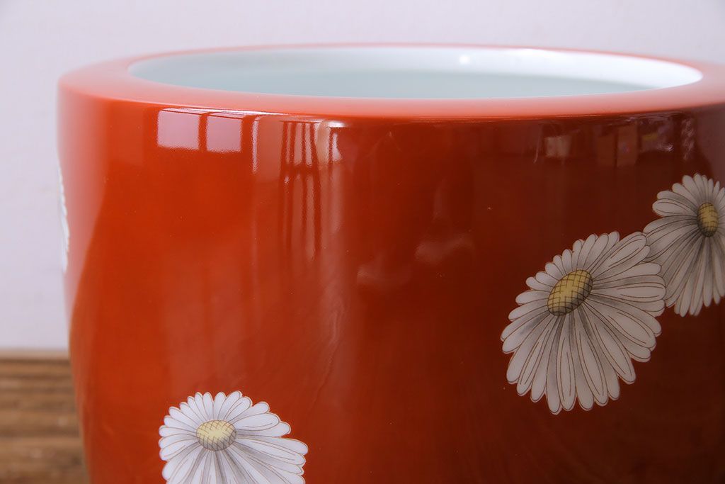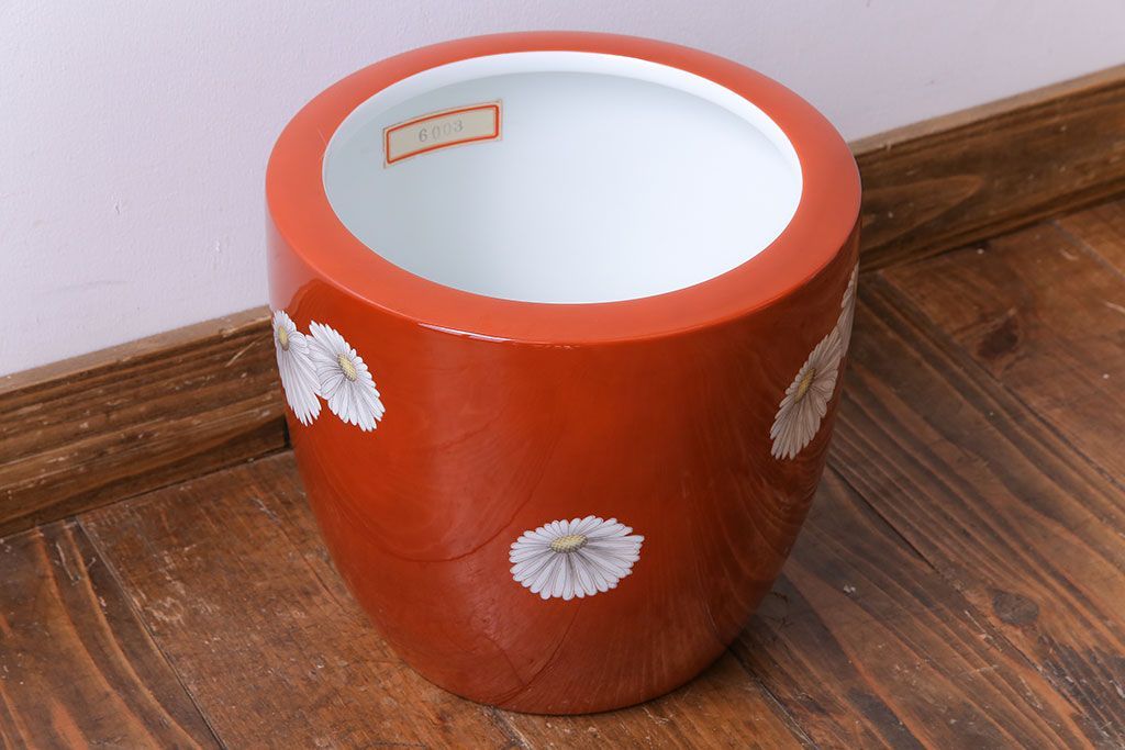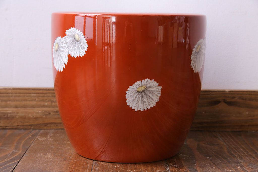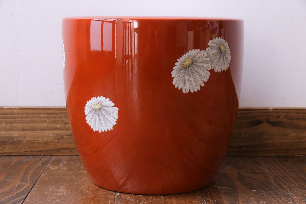 火鉢> 瀬戸火鉢 > アンティーク雑貨 未使用 ノリタケ・則武(日陶) 箱付 朱色地白菊文様 レトロな火鉢(手あぶり、鉢カバー)(2)