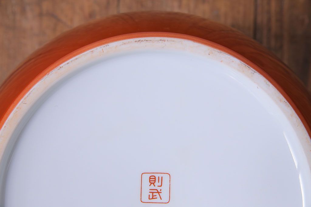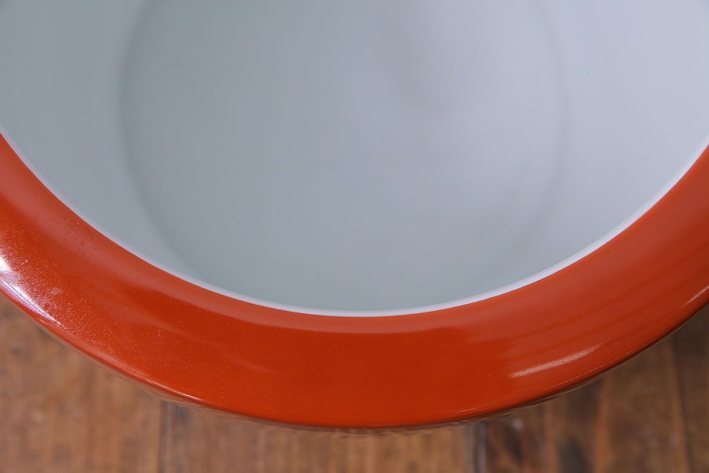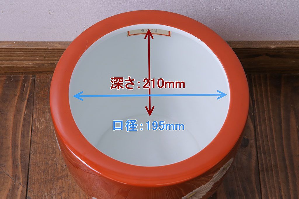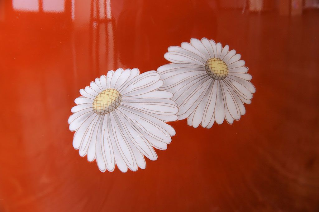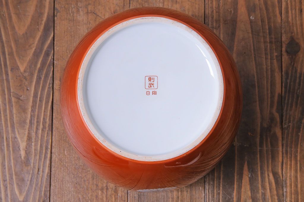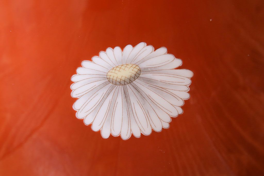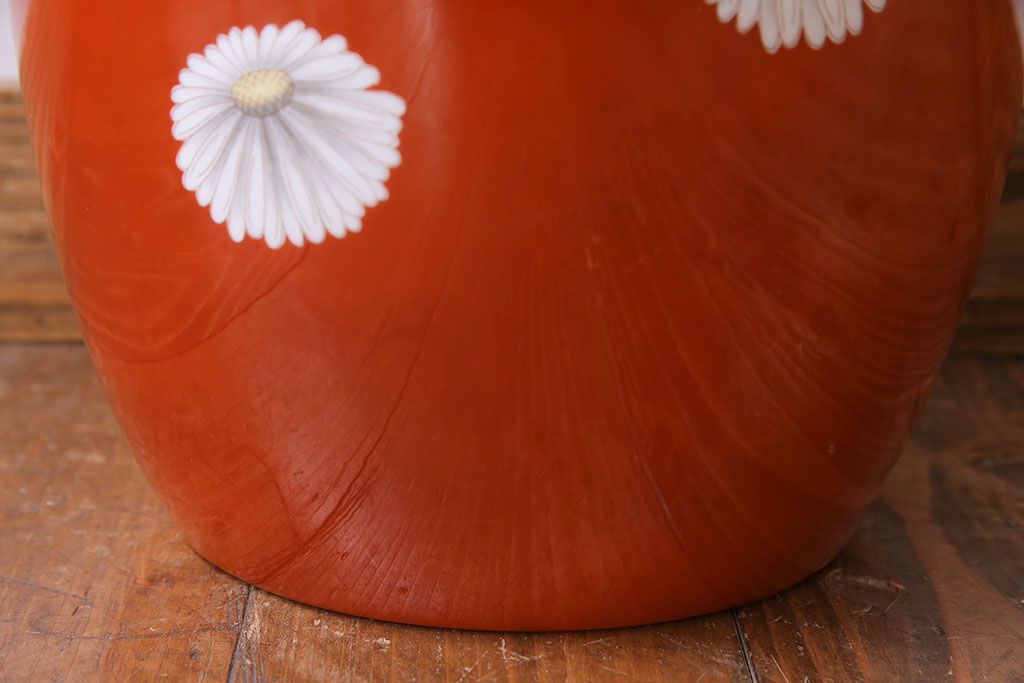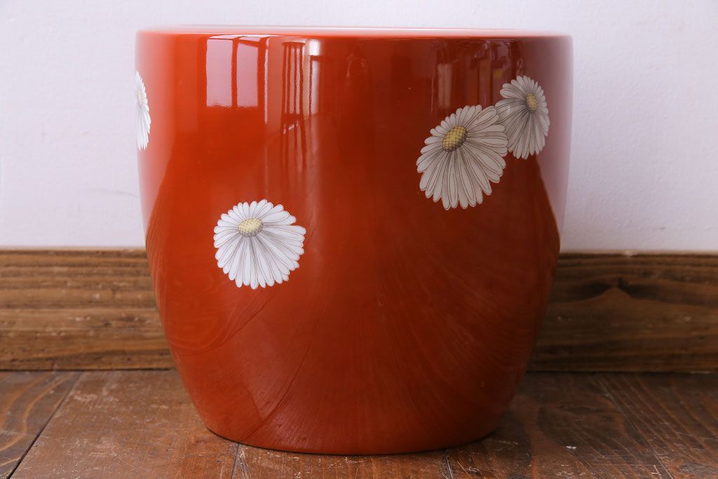 火鉢> 瀬戸火鉢 > アンティーク雑貨 未使用 ノリタケ・則武(日陶) 箱付 朱色地白菊文様 レトロな火鉢(手あぶり、鉢カバー)(2)