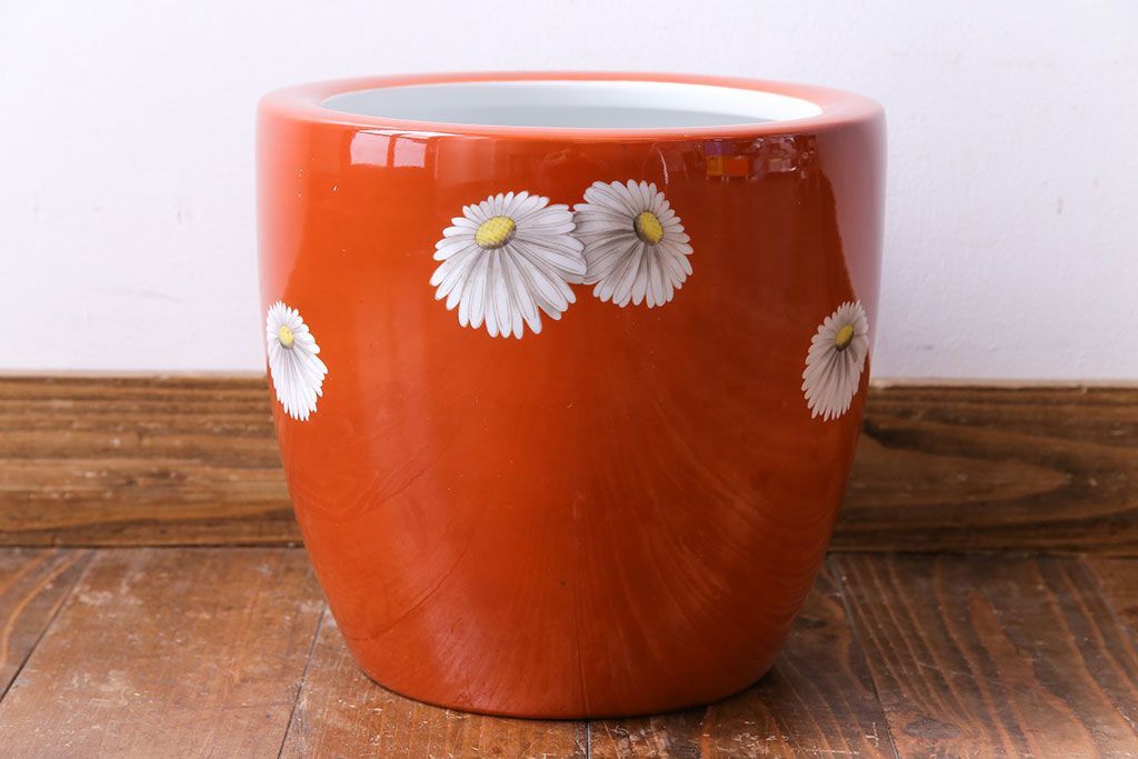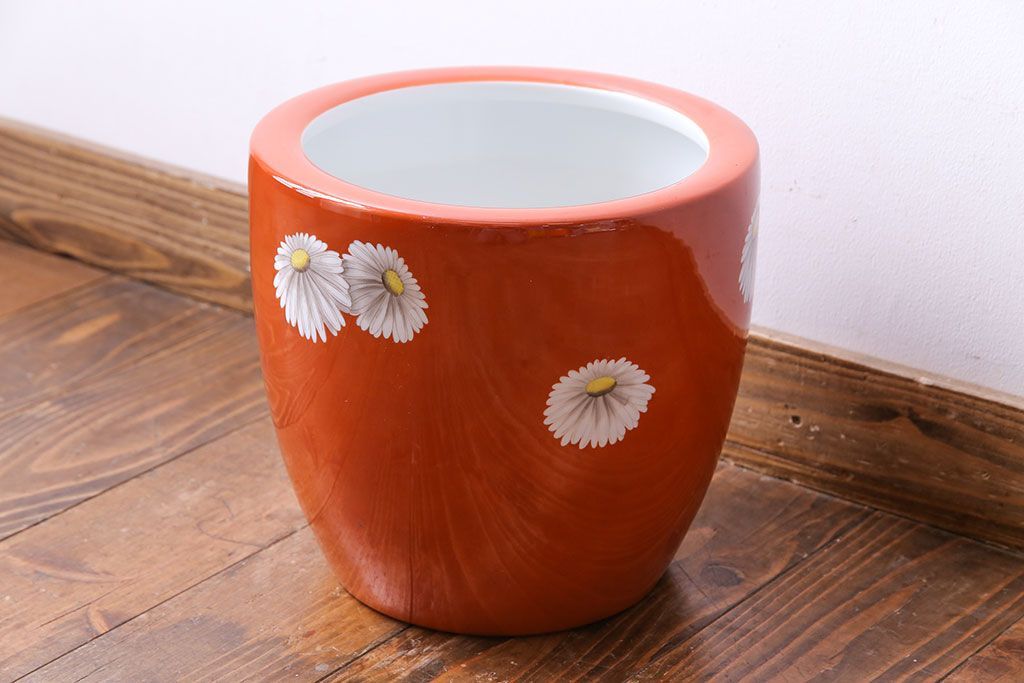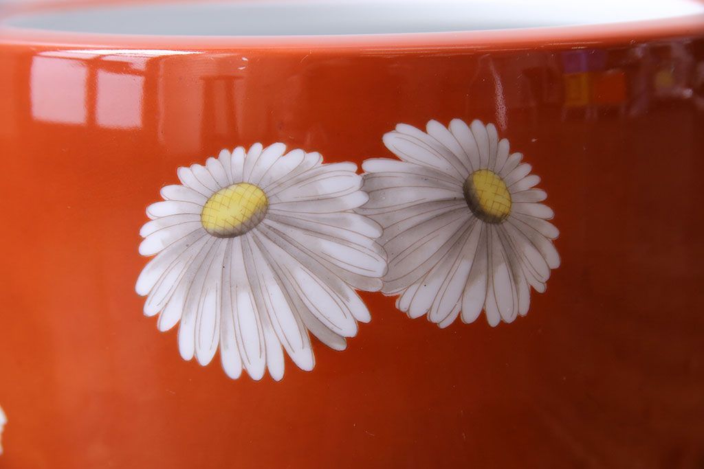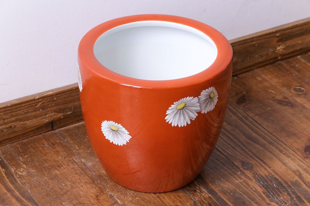 火鉢> 瀬戸火鉢 > アンティーク雑貨 オールドノリタケ(日陶) 朱色地白菊文様 レトロな火鉢(手あぶり、鉢カバー)(3)