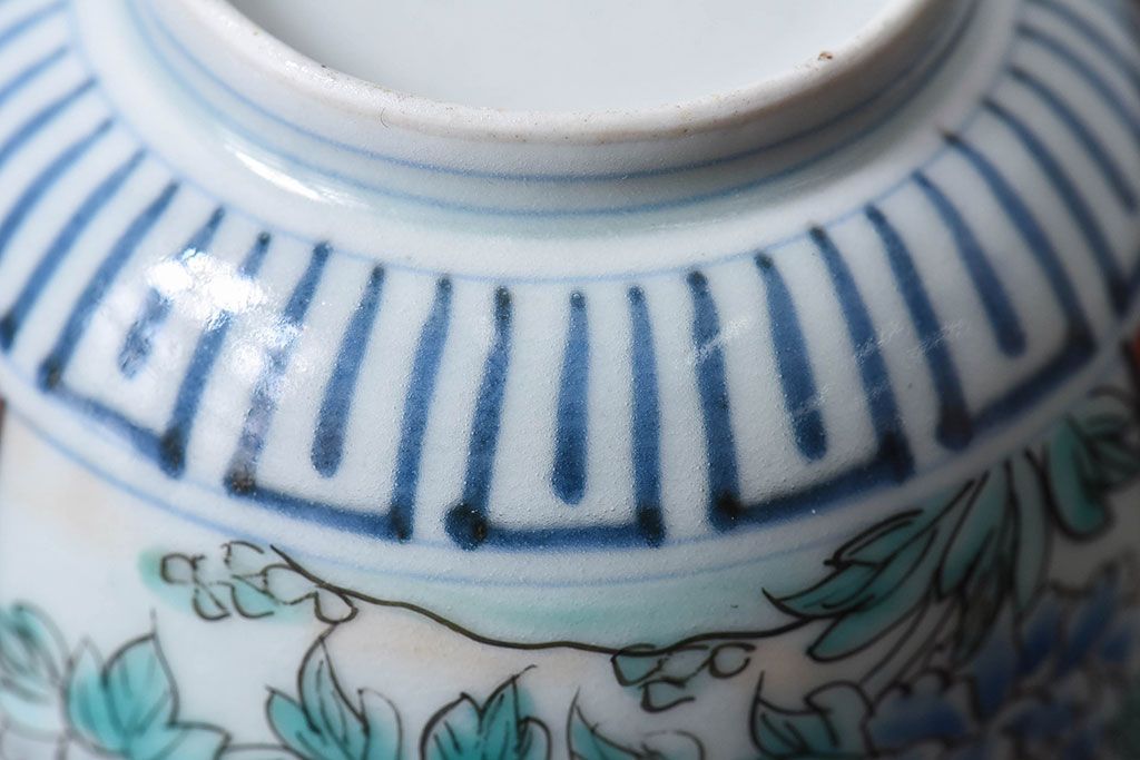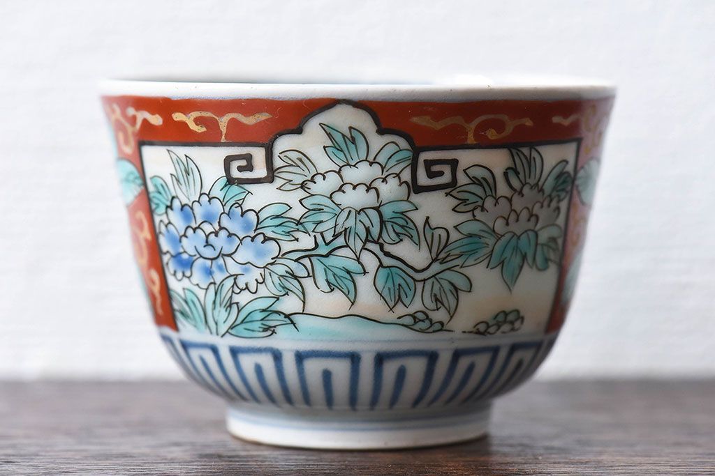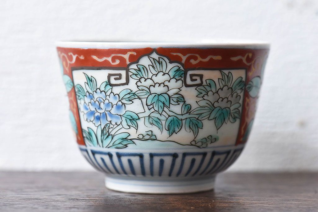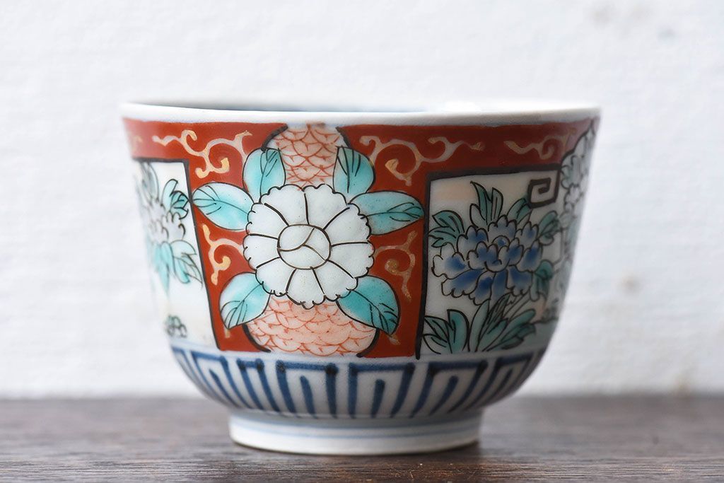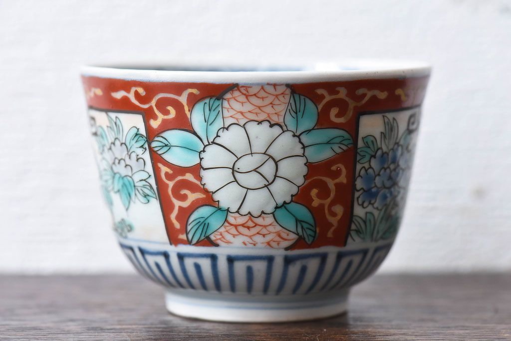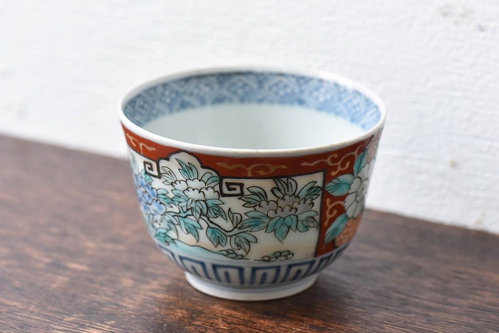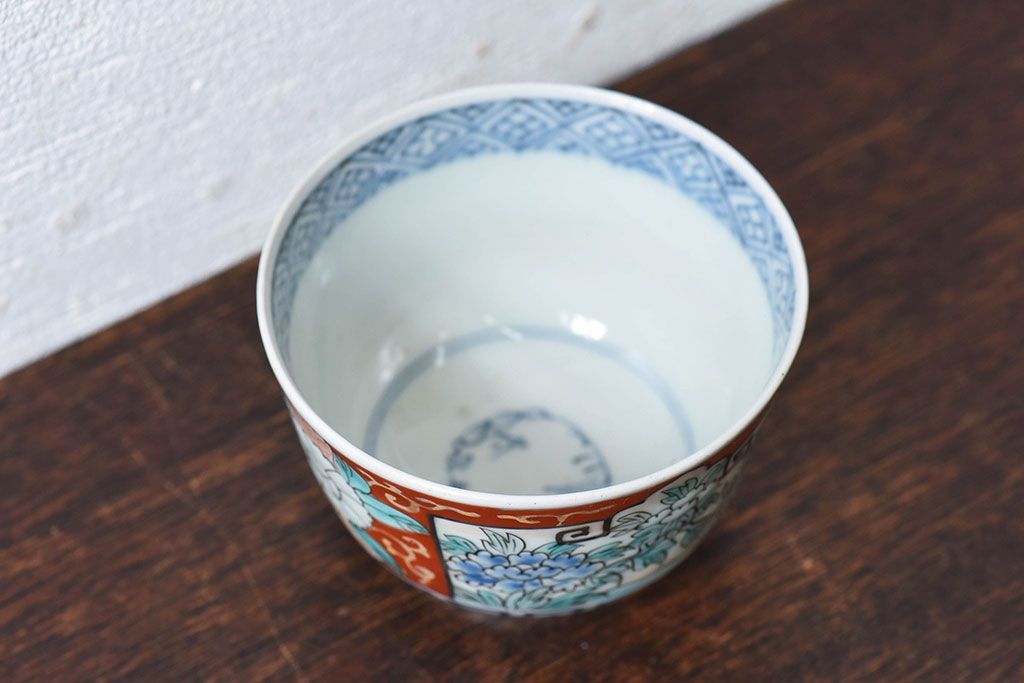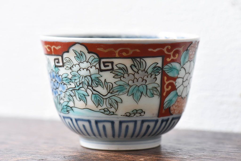 ラフジュ工房> 骨董・美術品> 骨董-陶磁器 > 古民具・骨董 江戸期 華やかな古伊万里色絵染付 蕎麦猪口(湯呑、向付)(1)