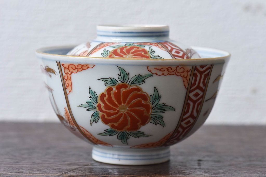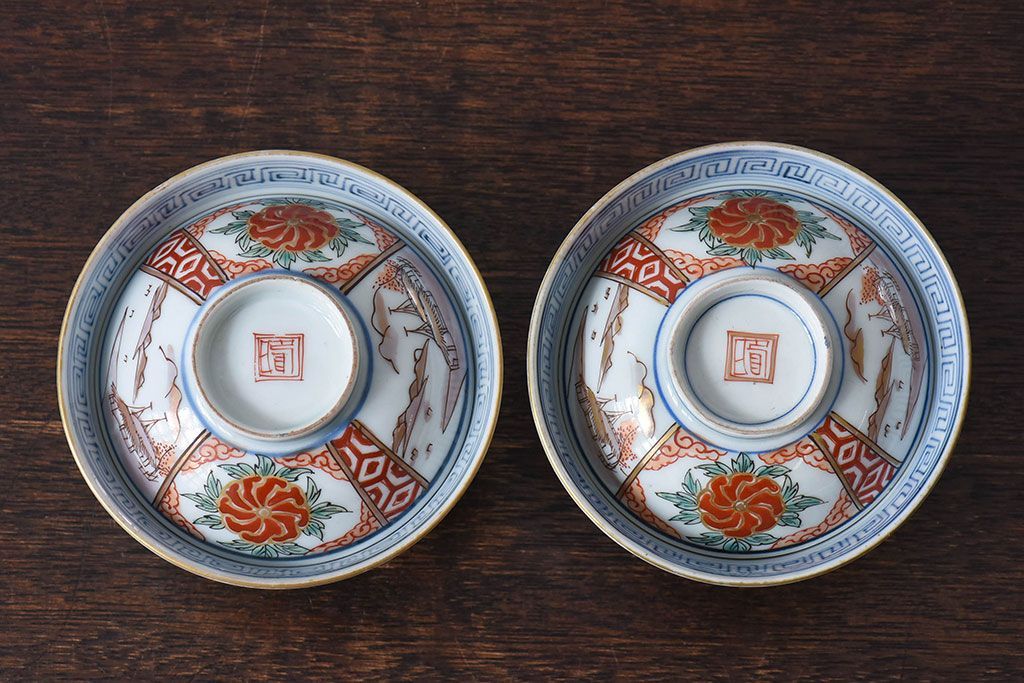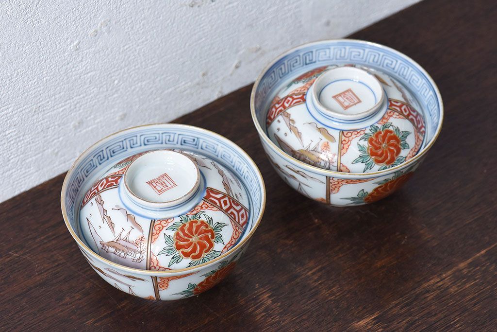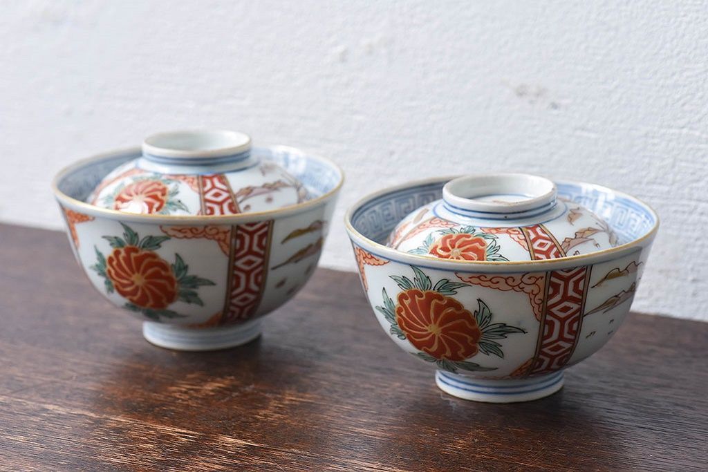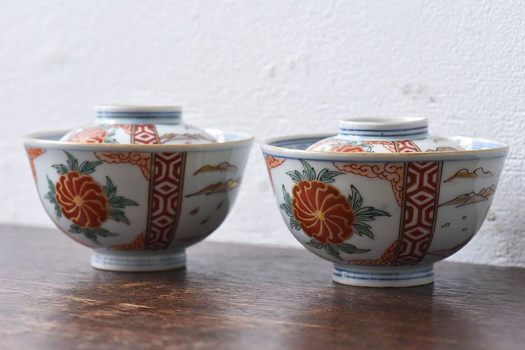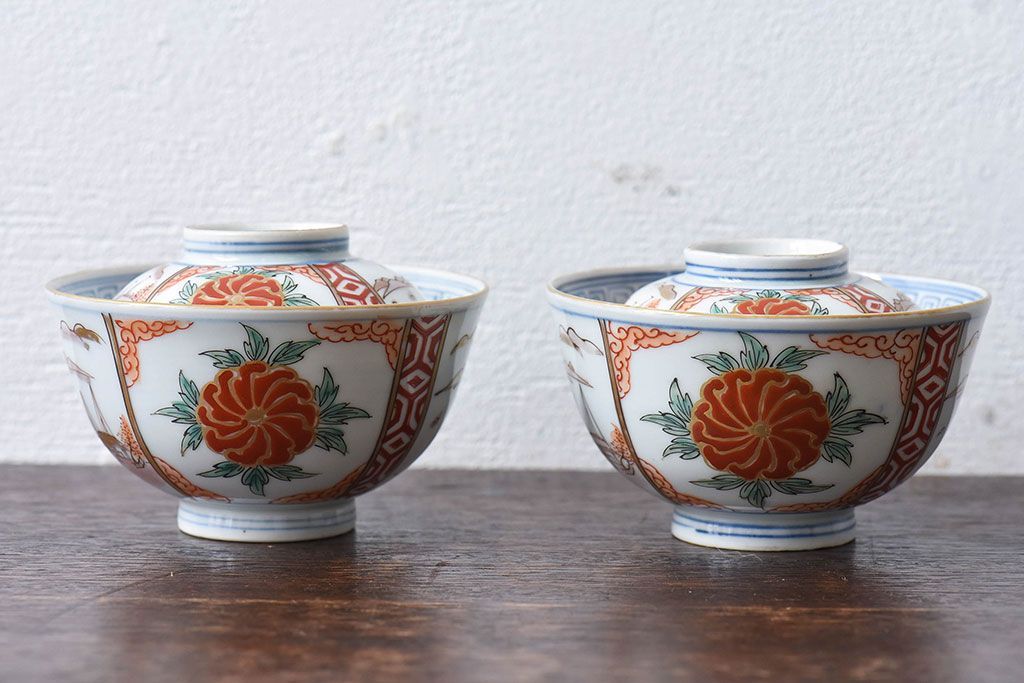 ラフジュ工房> 骨董・美術品> 骨董-陶磁器 > 古民具・骨董 江戸期 華やかな古伊万里色絵染付 蓋つき茶碗(2客セット)
