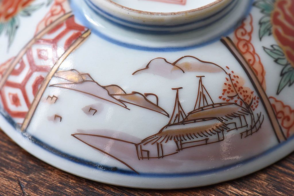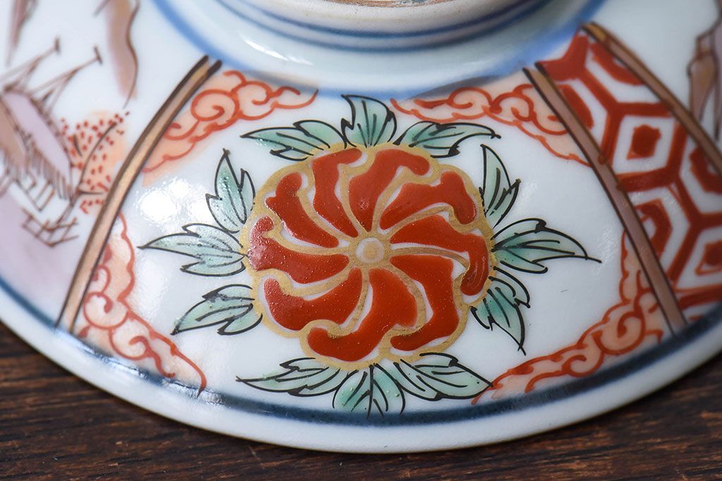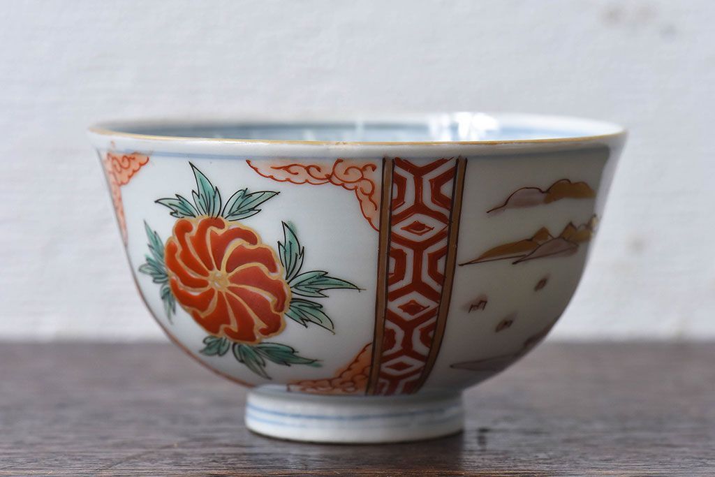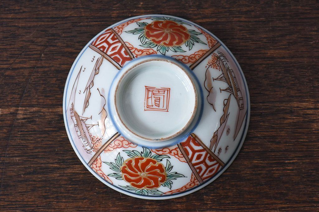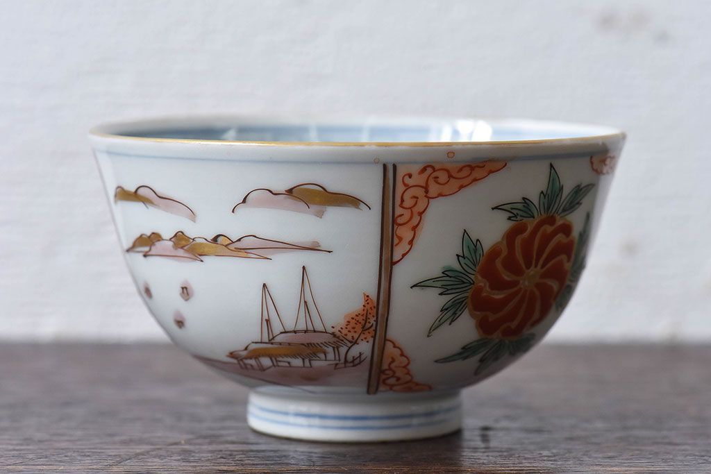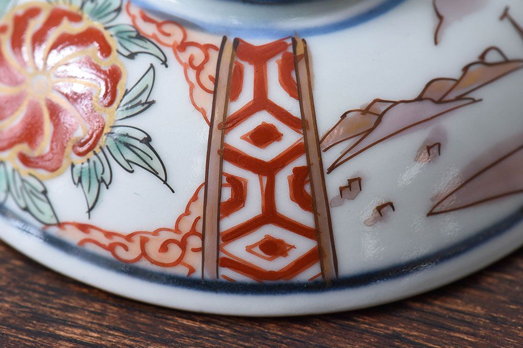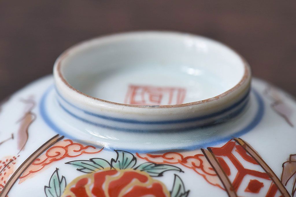 ラフジュ工房> 骨董・美術品> 骨董-陶磁器 > 古民具・骨董 江戸期 華やかな古伊万里色絵染付 蓋つき茶碗(2客セット)