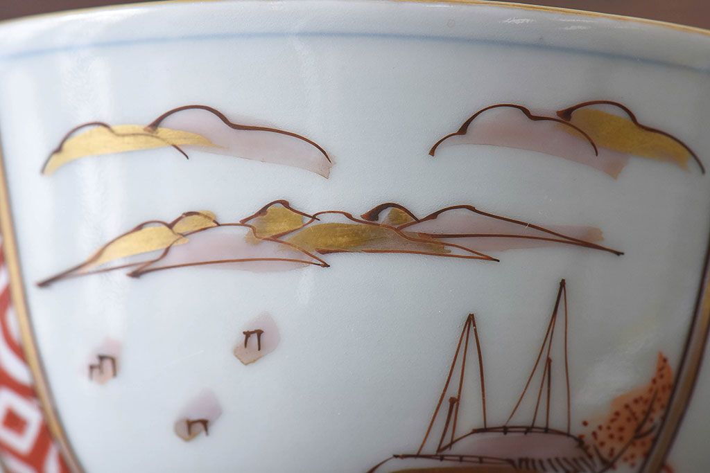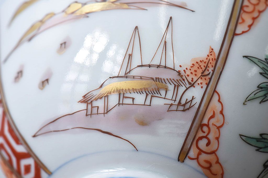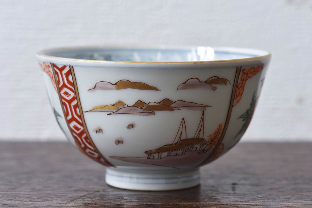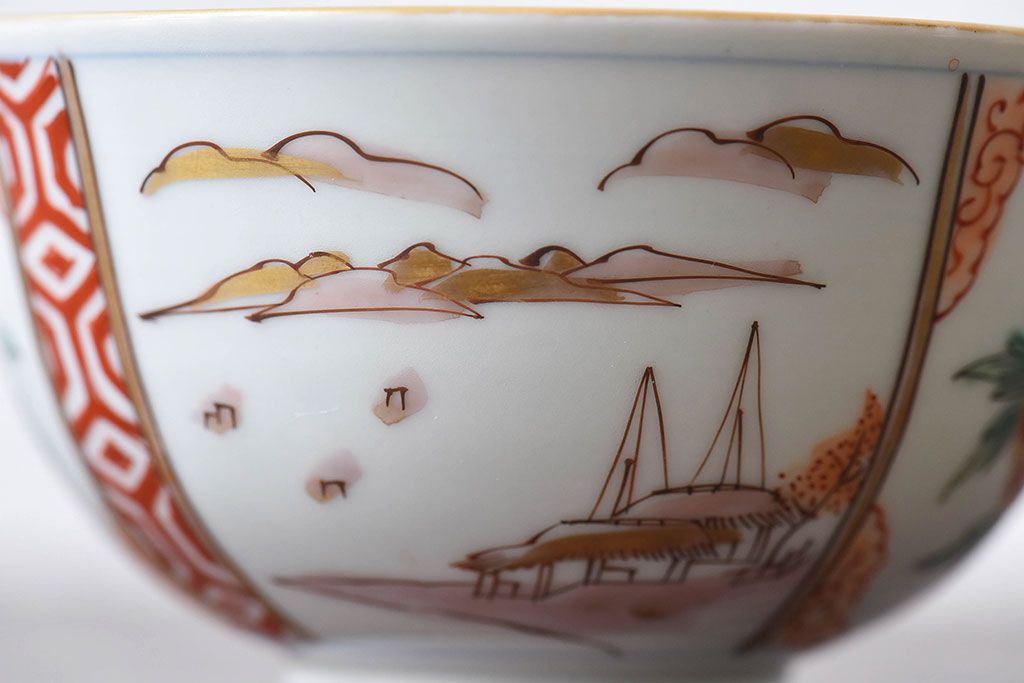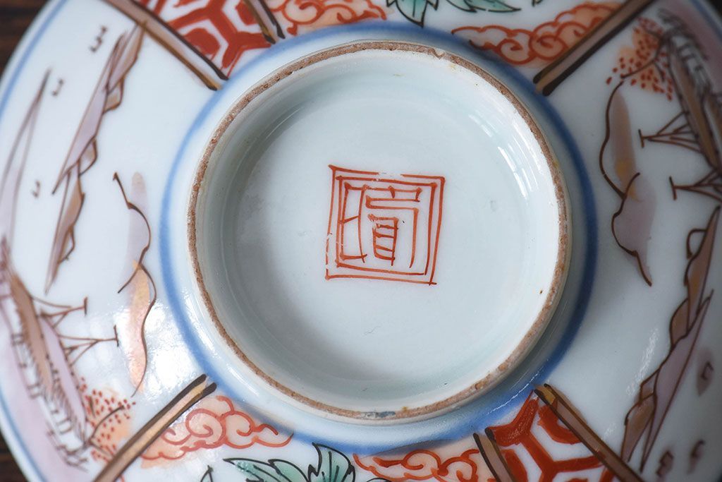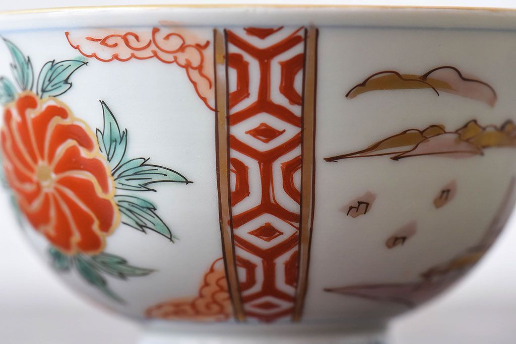 ラフジュ工房> 骨董・美術品> 骨董-陶磁器 > 古民具・骨董 江戸期 華やかな古伊万里色絵染付 蓋つき茶碗(2客セット)