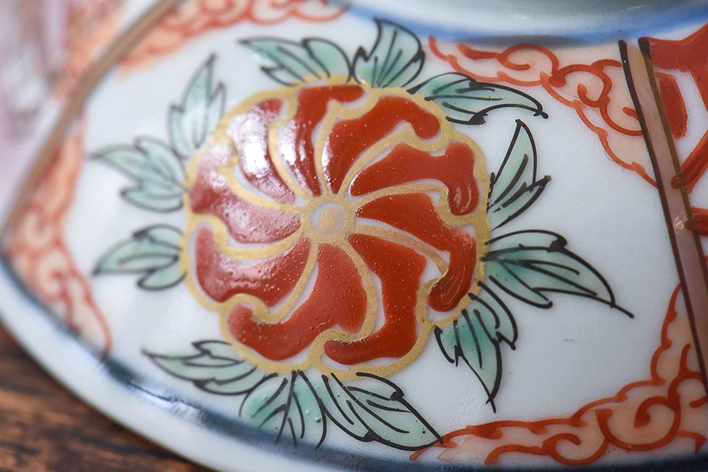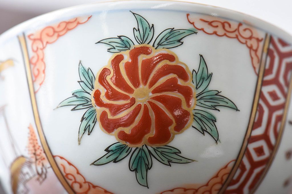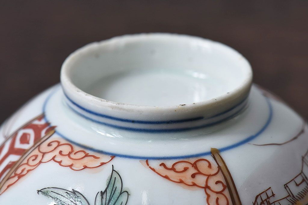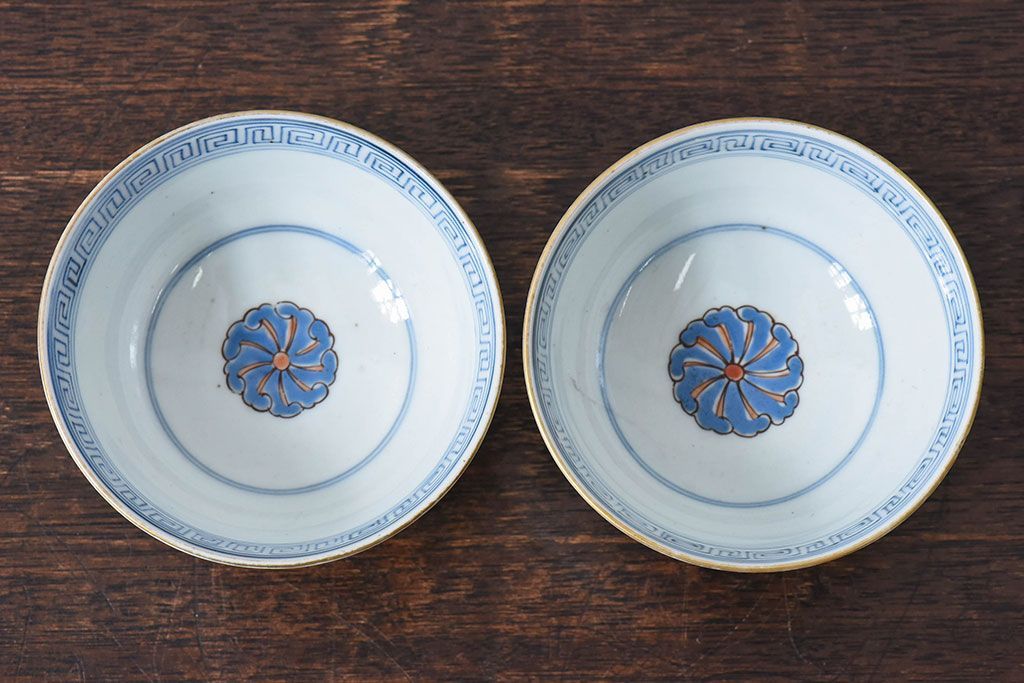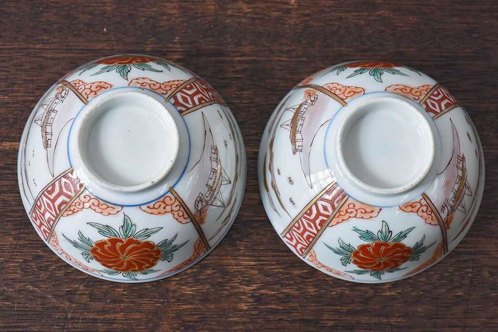 ラフジュ工房> 和食器・茶道具> お椀・茶碗 > 古民具・骨董 江戸期 華やかな古伊万里色絵染付 蓋つき茶碗(2客セット)