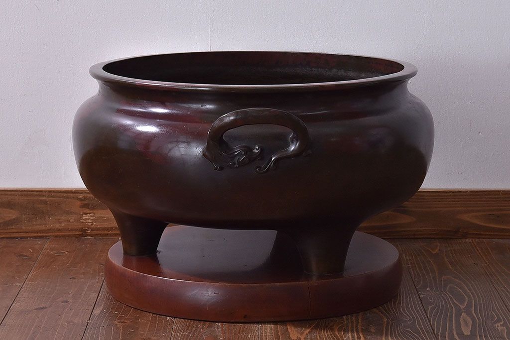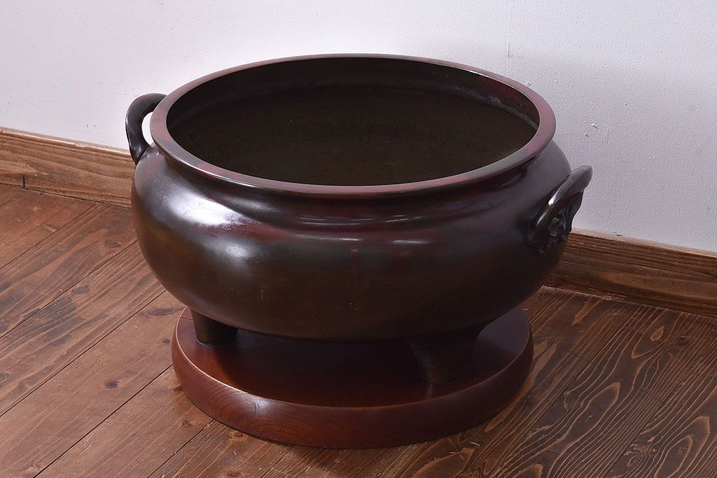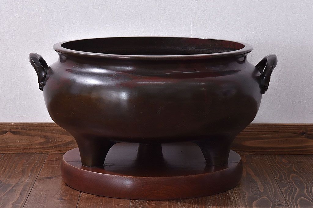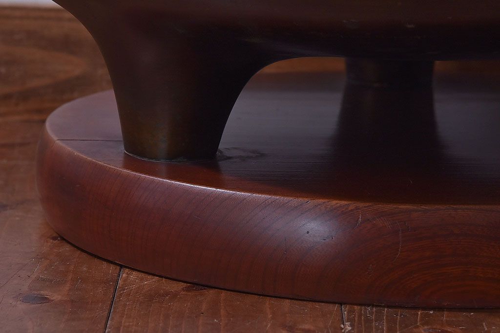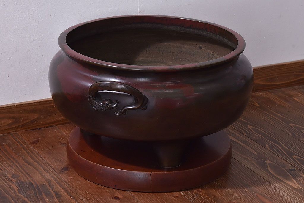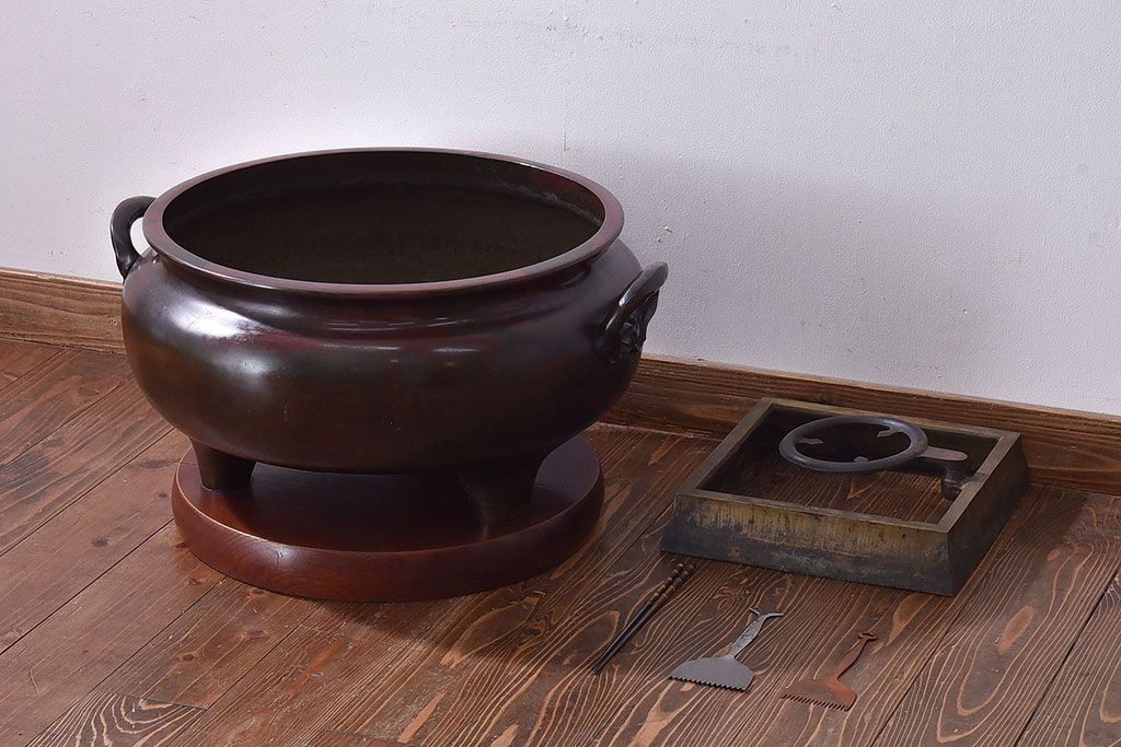 火鉢> 金属火鉢 > アンティーク雑貨 和製アンティーク 明治〜大正期 木製台座付き斑紫銅火鉢セット(五徳、火箸、灰ならし)