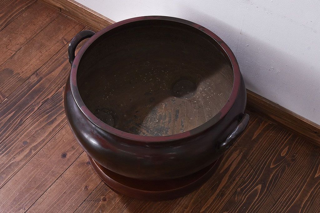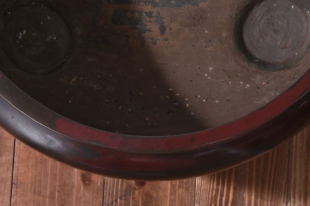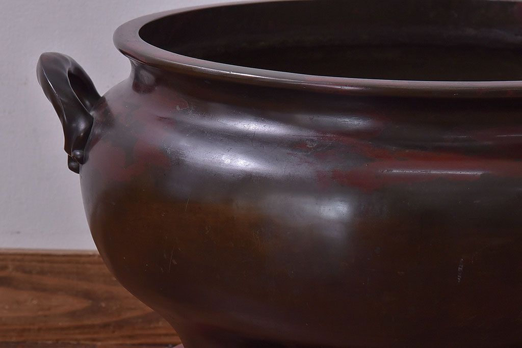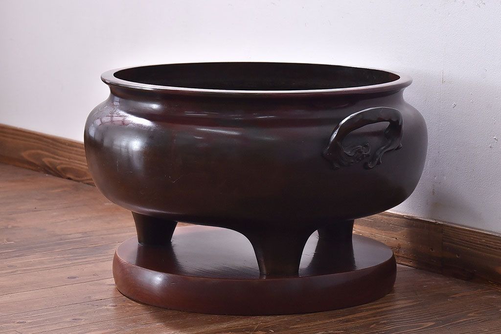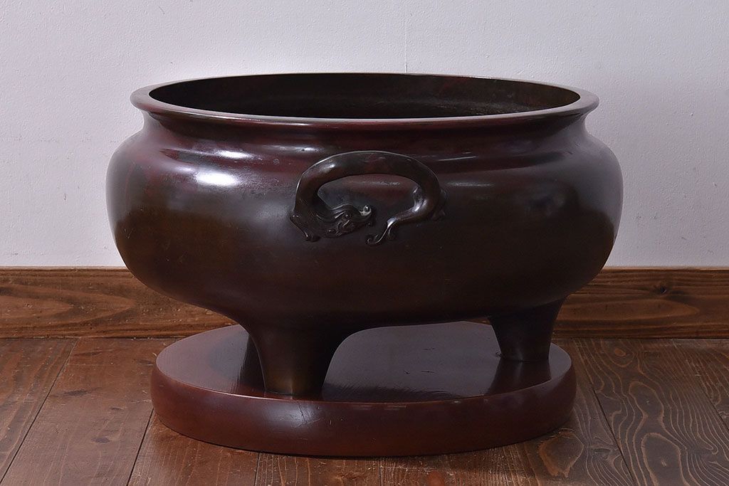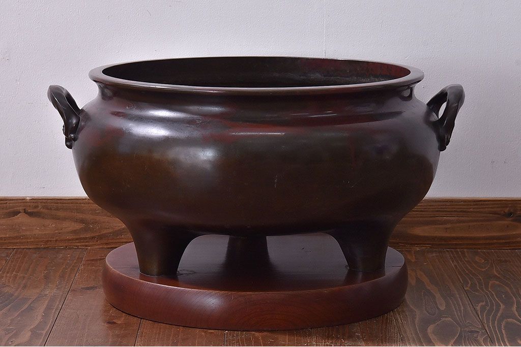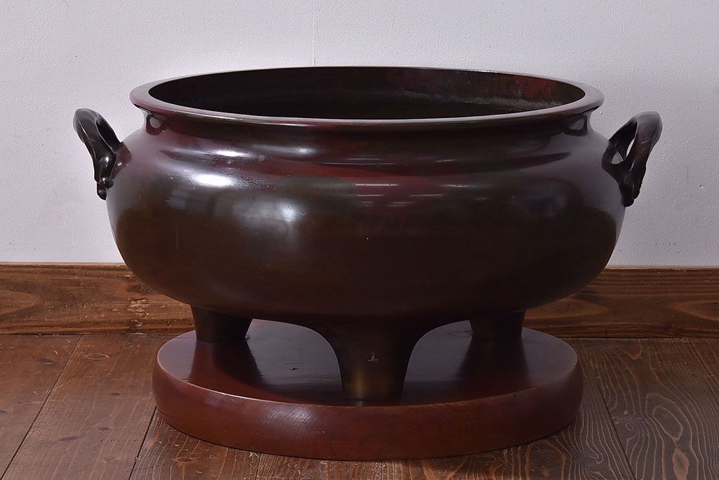火鉢> 金属火鉢 > アンティーク雑貨 和製アンティーク 明治〜大正期 木製台座付き斑紫銅火鉢セット(五徳、火箸、灰ならし)