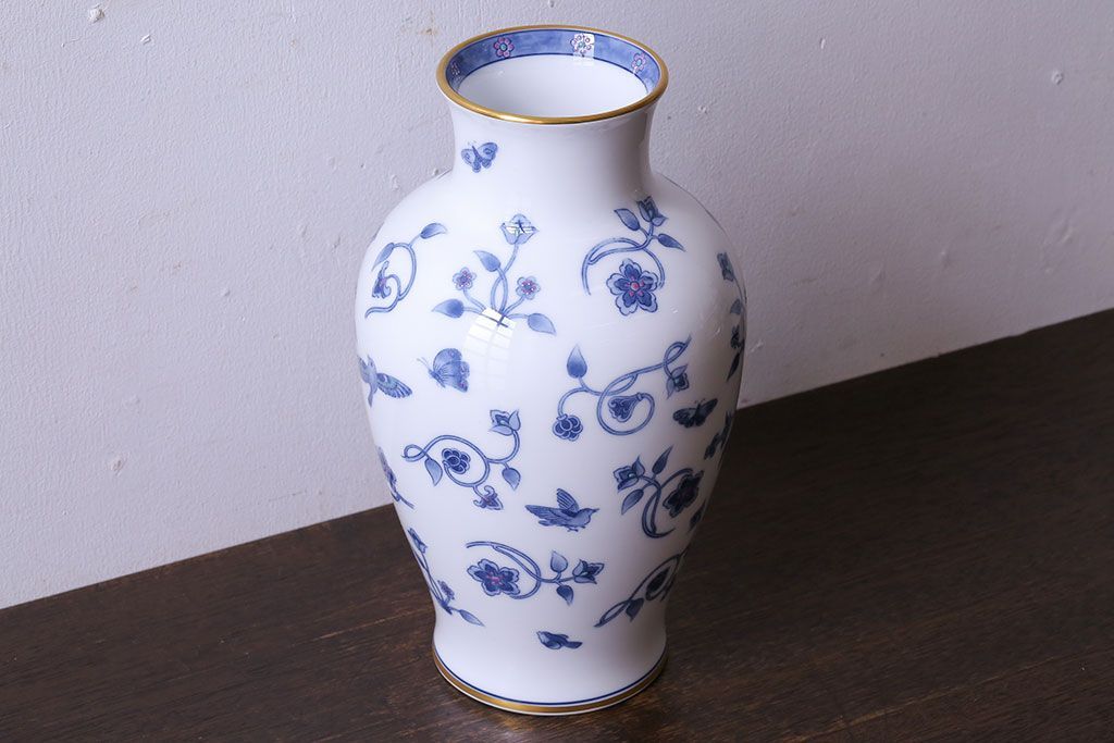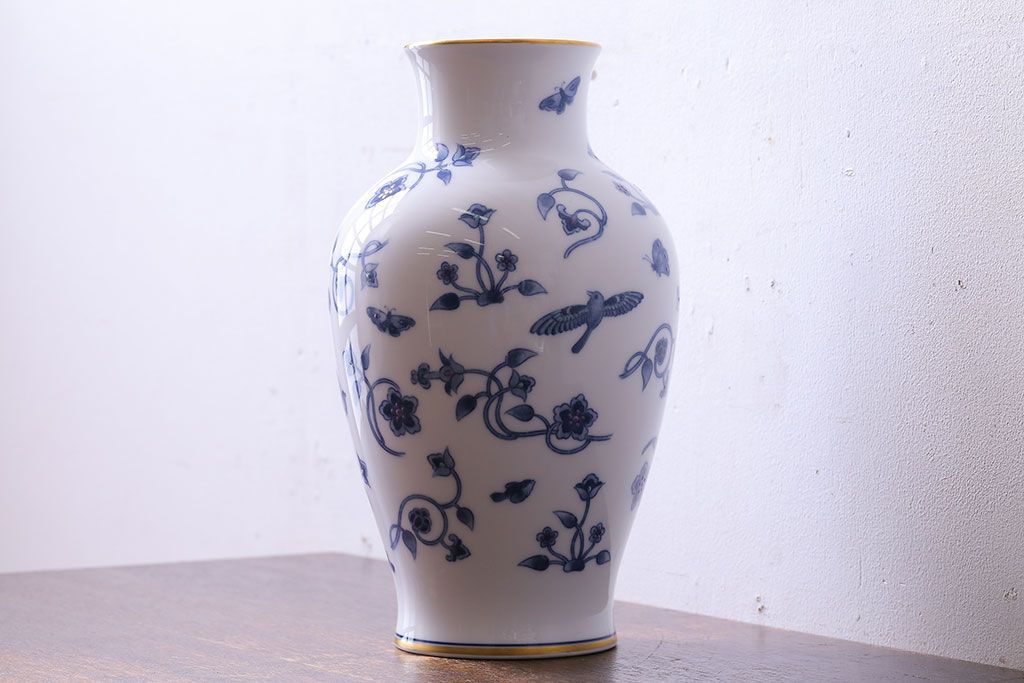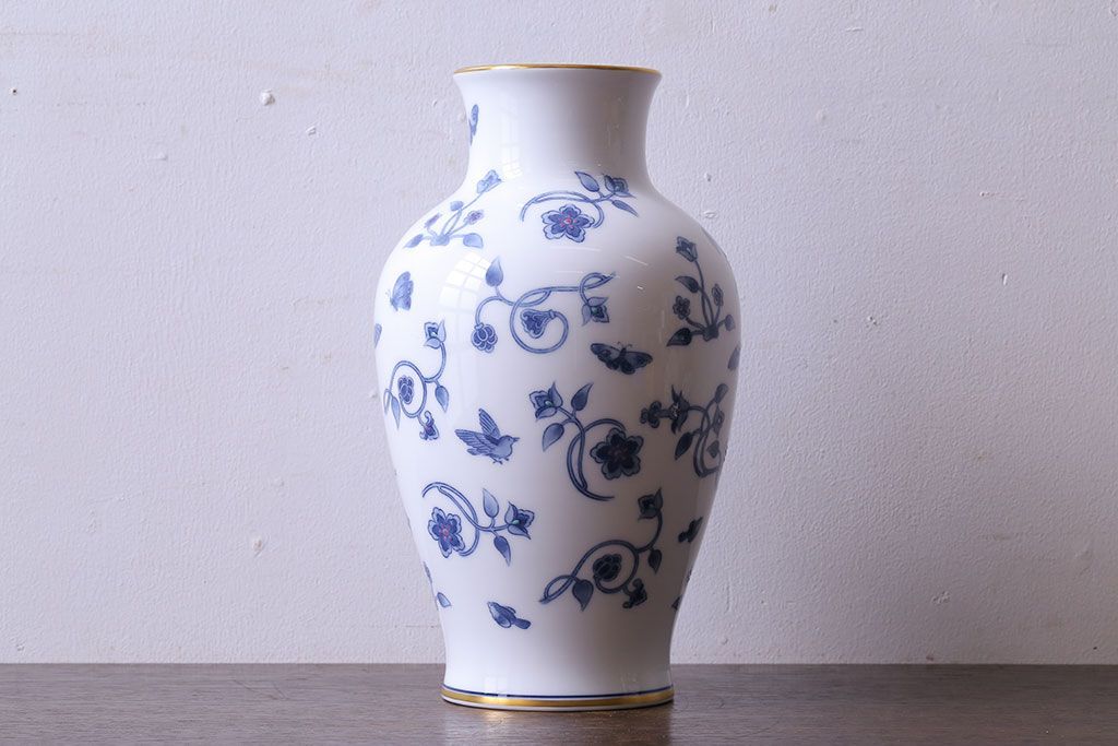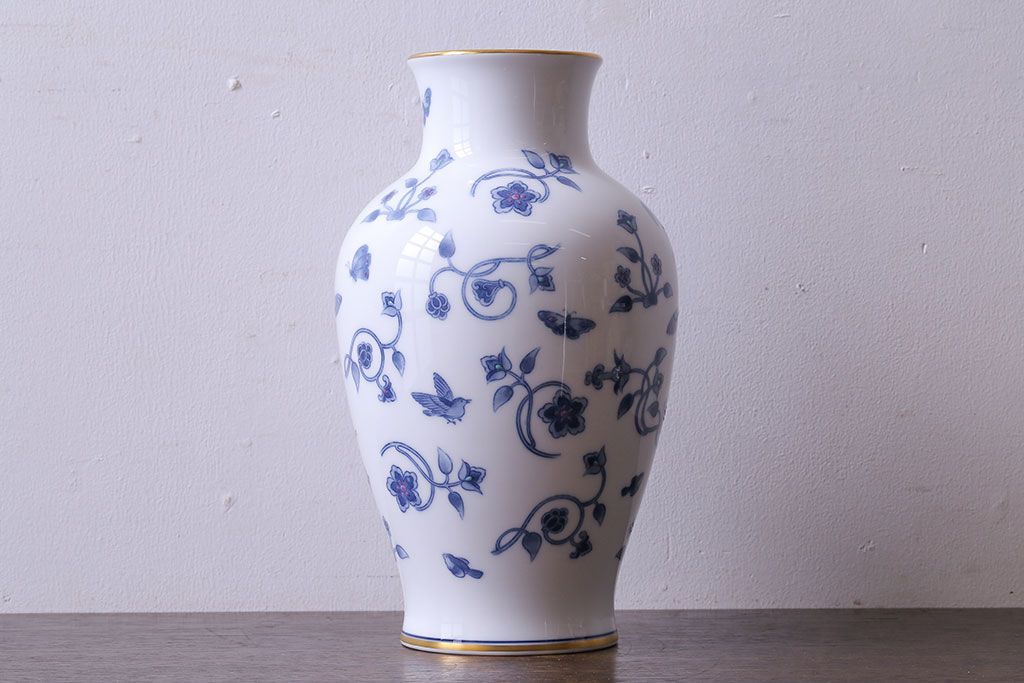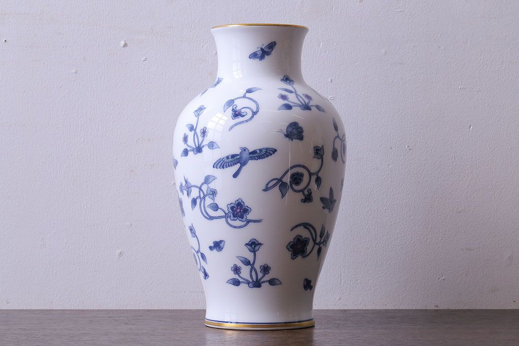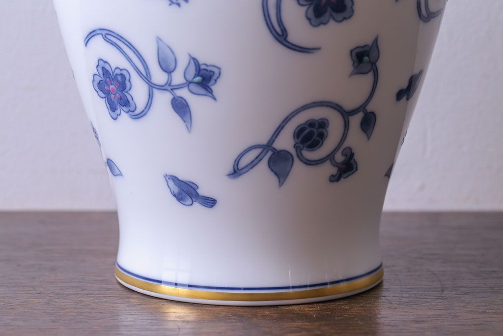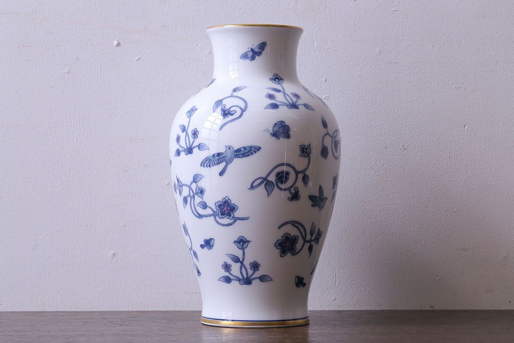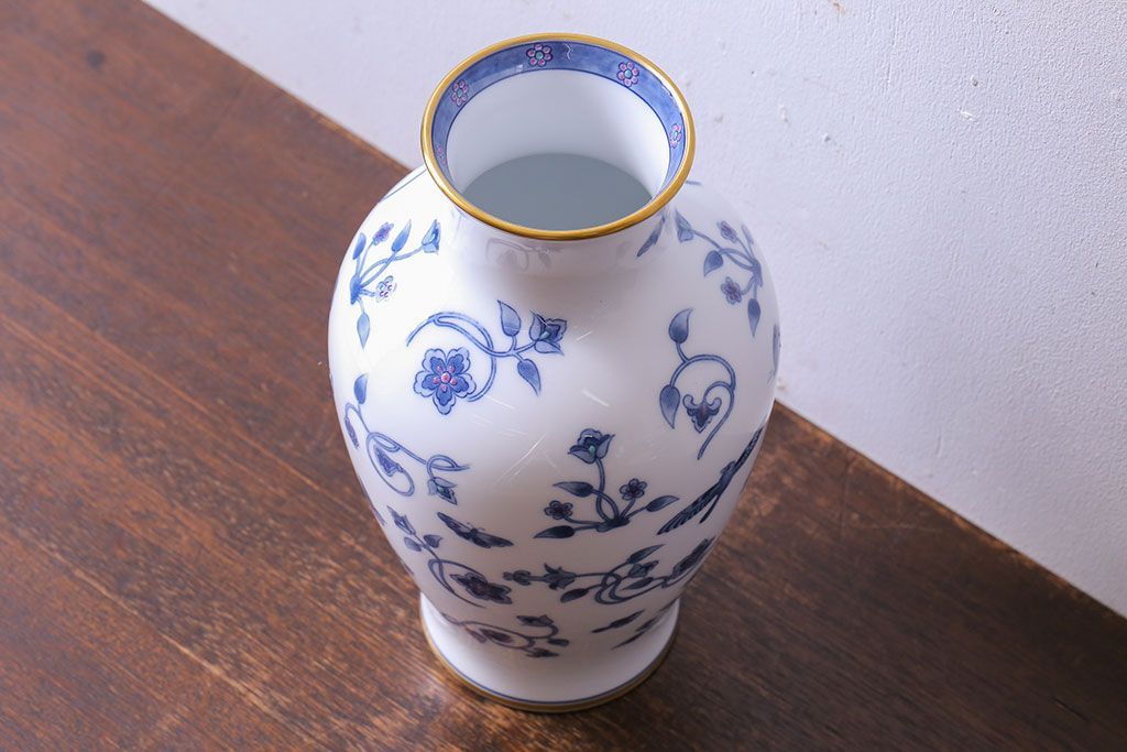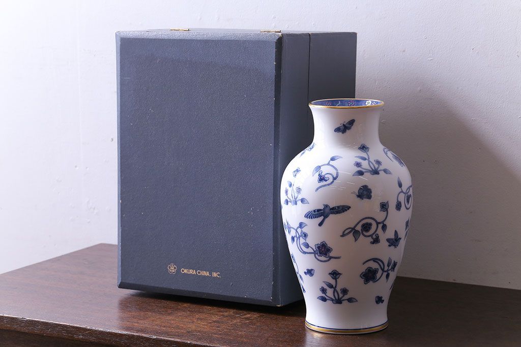 アンティーク雑貨 中古 大蔵陶園(OKURA) 花と蝶と鳥の絵柄が上品な花瓶(花器)