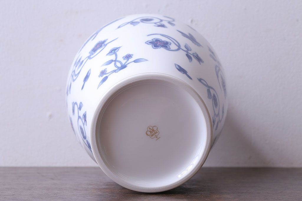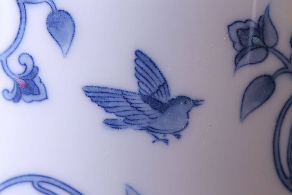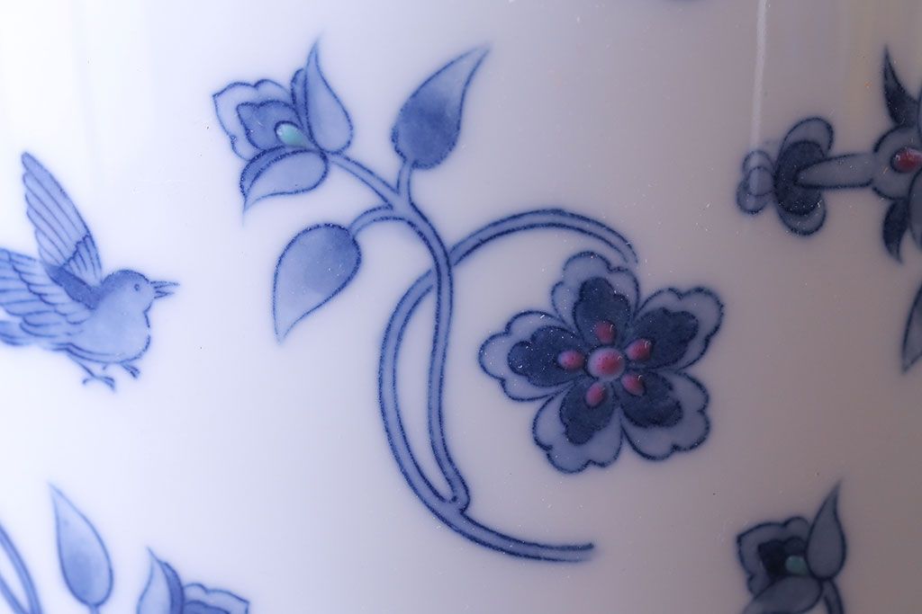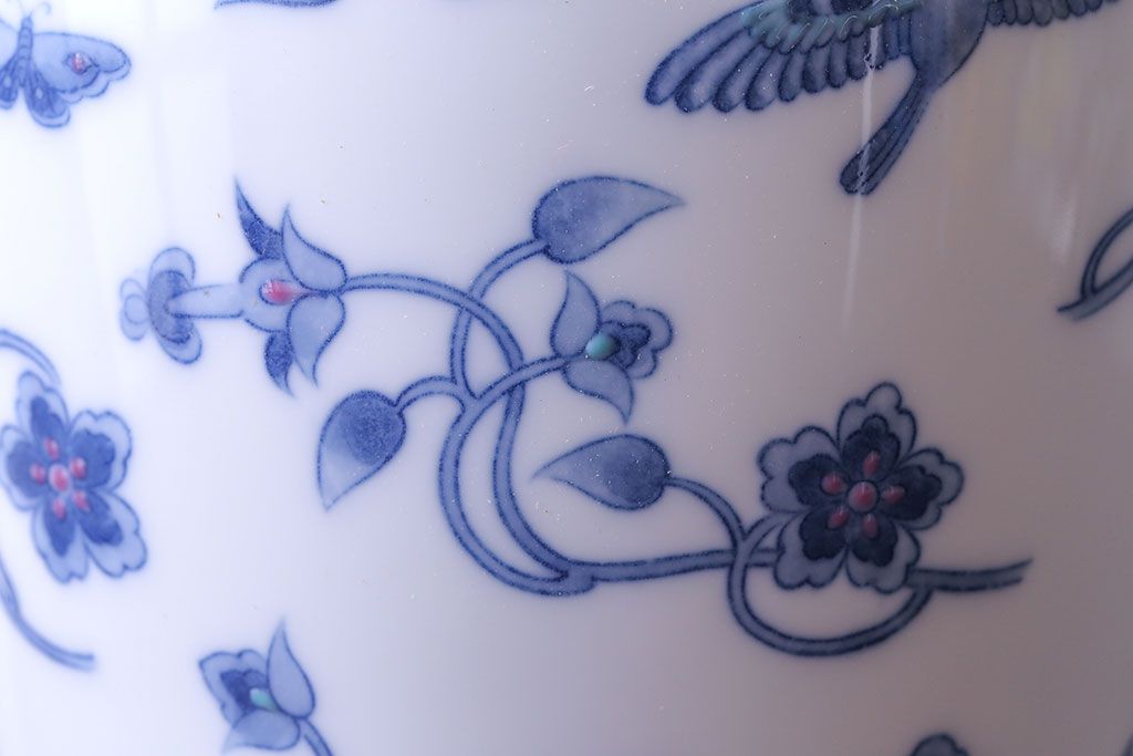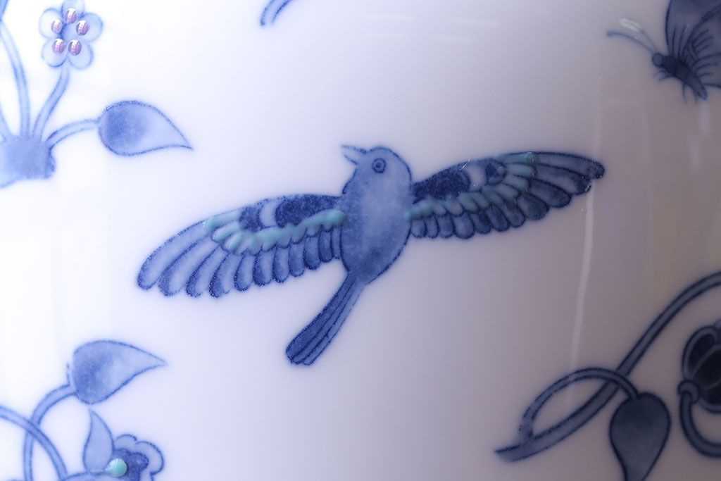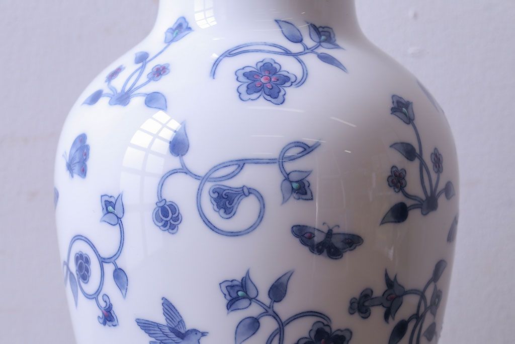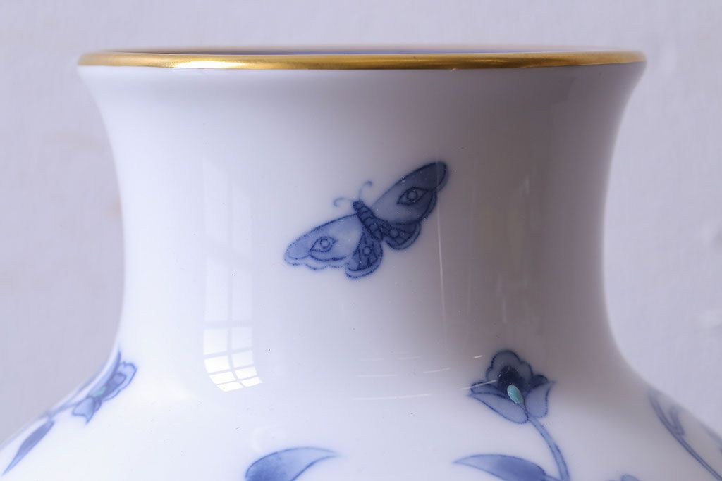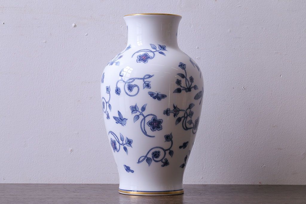 アンティーク雑貨 中古 大蔵陶園(OKURA) 花と蝶と鳥の絵柄が上品な花瓶(花器)