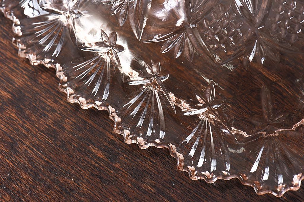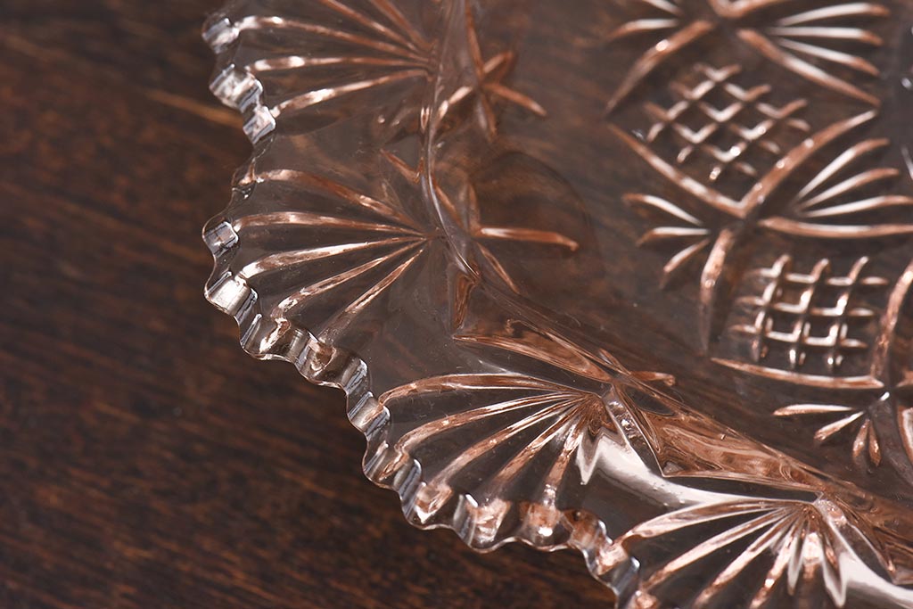 アンティーク雑貨 昭和レトロ レトロな雰囲気漂う薄ピンクの脚付きプレート皿(プレスガラス、器)