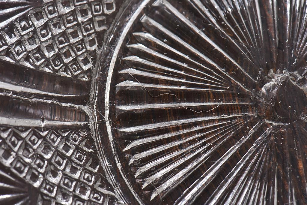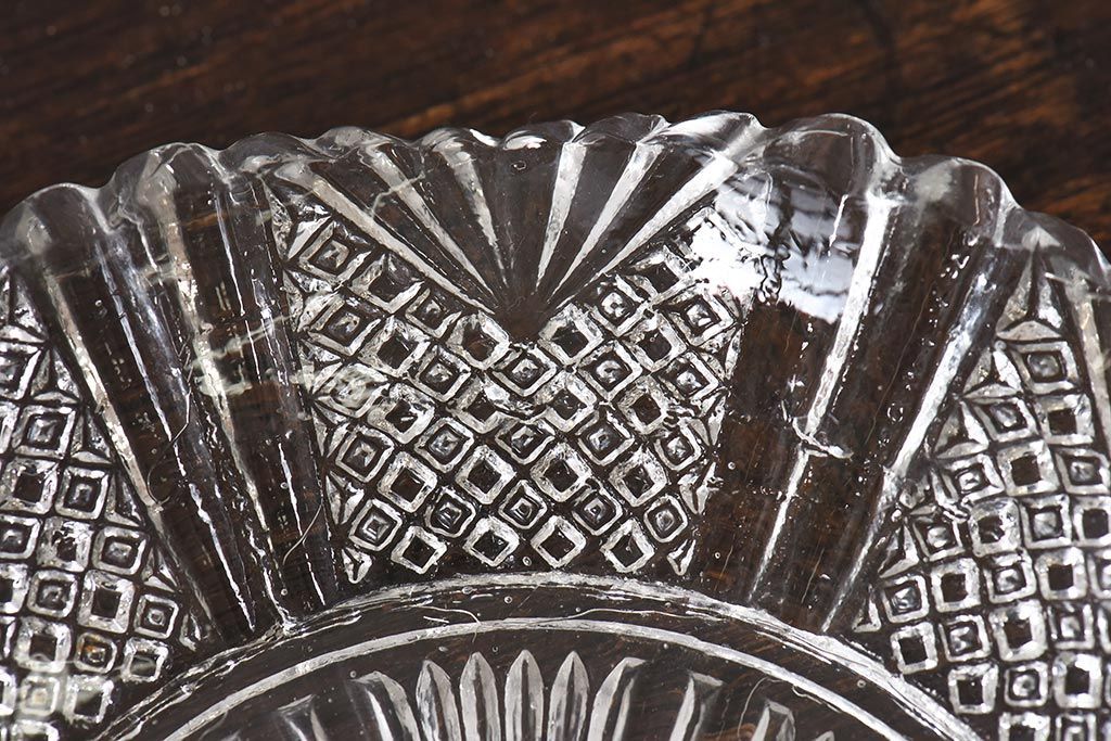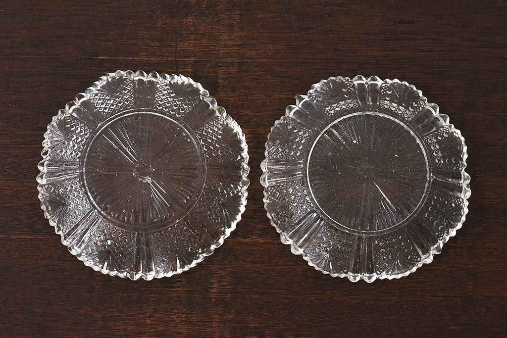 ラフジュ工房> 骨董・美術品> 骨董-ガラス食器 > アンティーク雑貨 大正期 鱗八つ割文 シックなガラスプレート(プレスガラス、レース皿)2枚セット