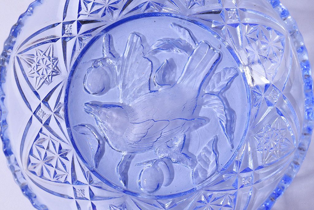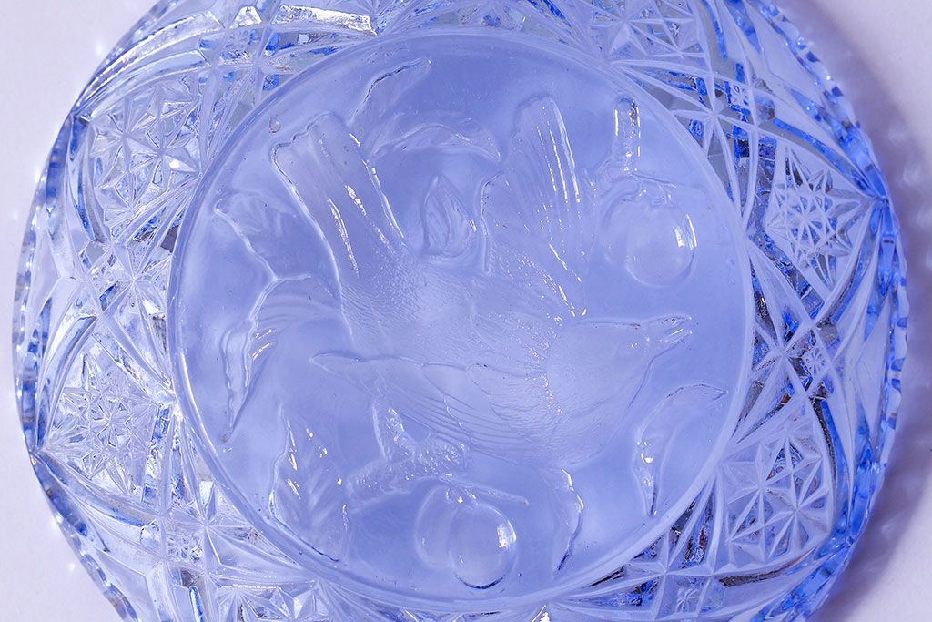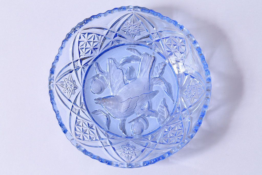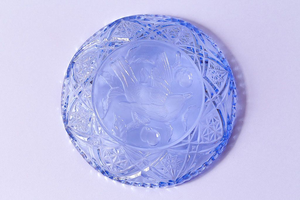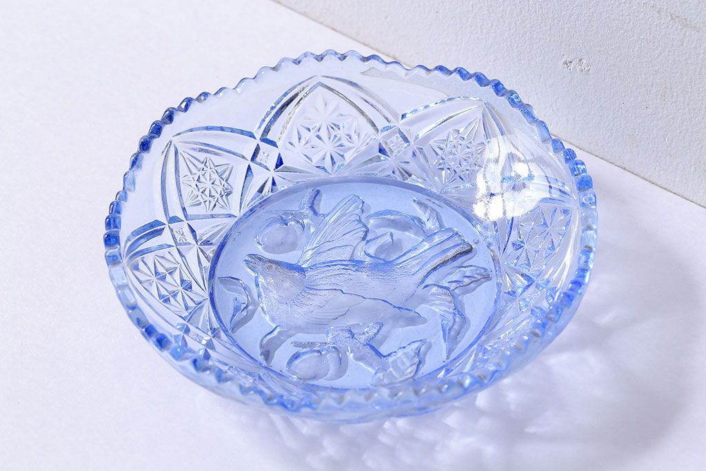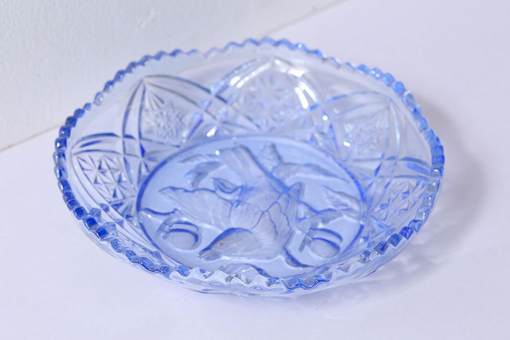 アンティーク雑貨 昭和レトロ 鳥の模様が愛らしい青いガラスの小皿(プレート、器)